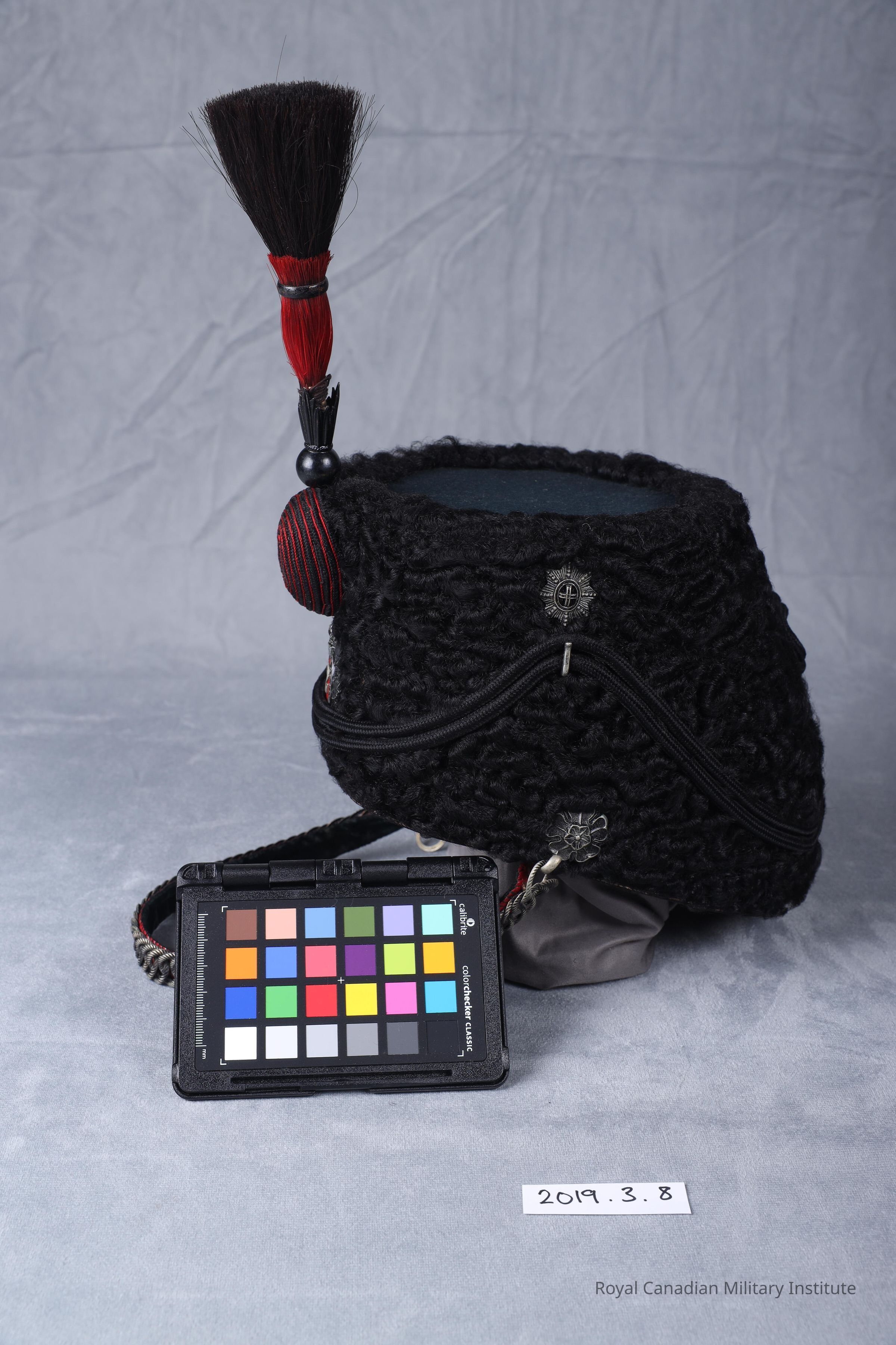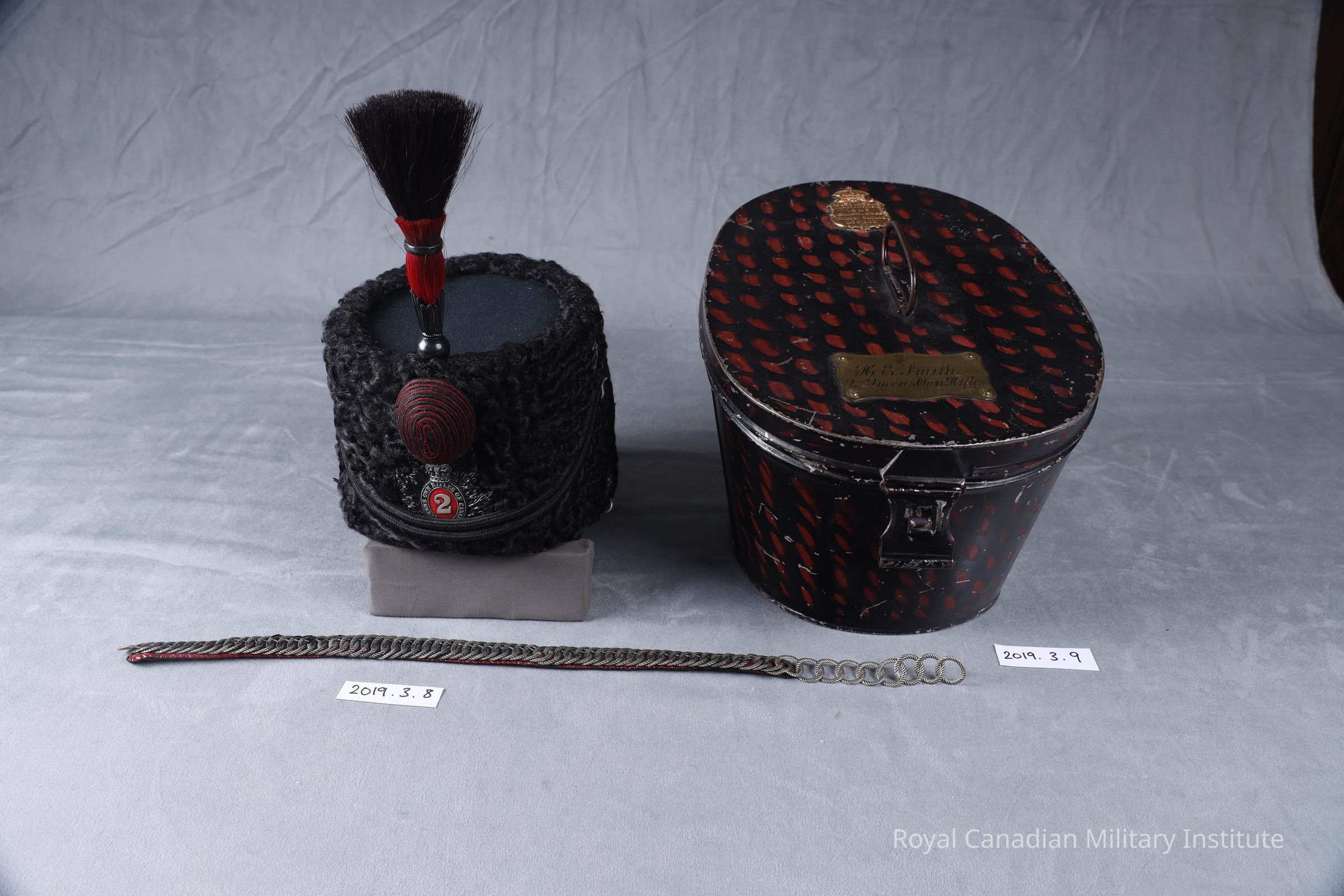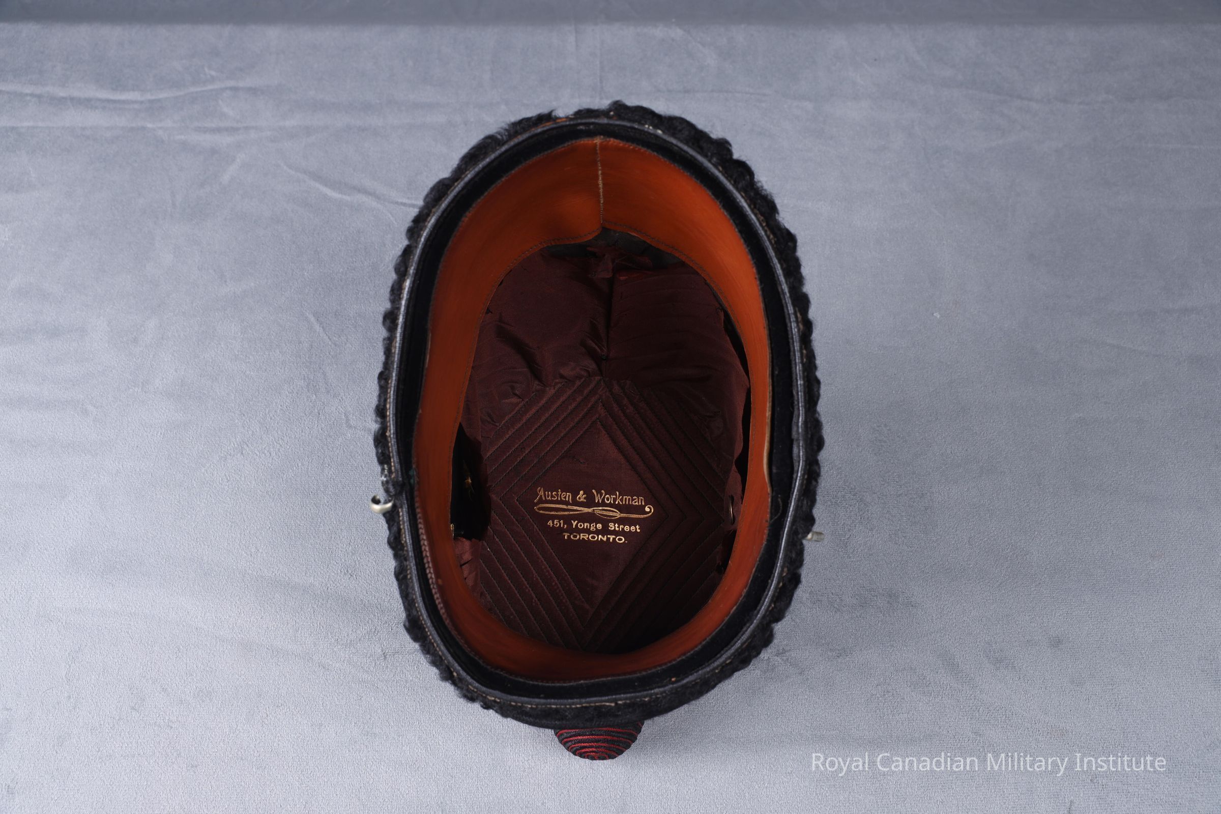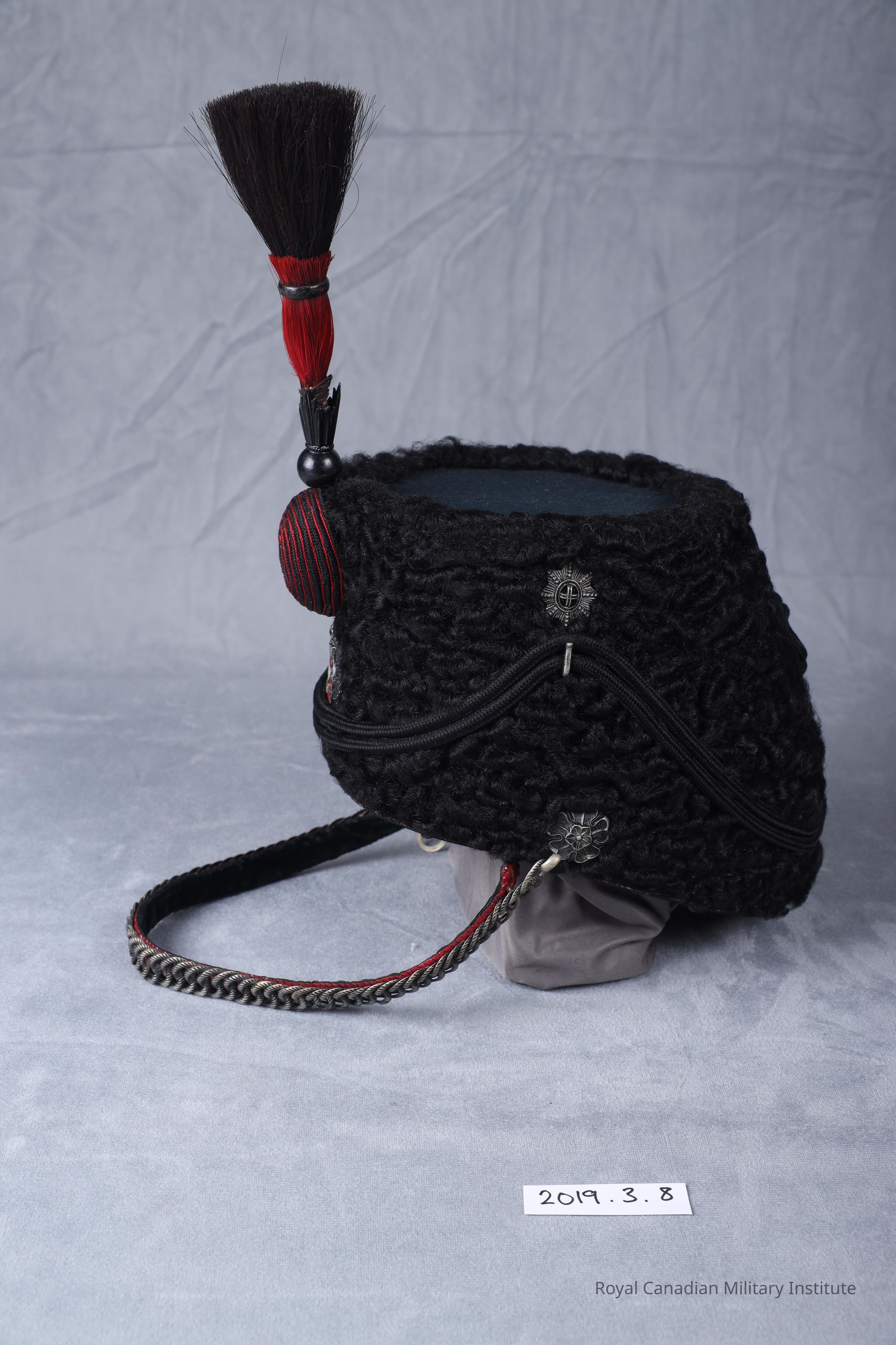 1890-1913 Queen's Own Rifles officer's busby made of black astrakhan fur and stiffened with cork. The top is covered with black felt. On the front is a black and sliver cap badge (5.5 cm x 5 cm) denoting the Queen's Own Rifles. The centre is made of red felt and is fronted with the number "2." Over the badge is an oval centrepiece ( 5.5 cm long x 4.5 cm wide) made of red and black cording. The plume (19 cm long from base) is made of black and red horsehair, stuck into a black ball base. On either side of the busby, towards the bottom rim is a silver rosette hook (4 cm long x 2.5 cm wide) to loop the chinstrap. Directly above this rosette, on the top rim is another silver hook (4 cm long x 2.5 cm wide) to secure the two row black cord around the body of the busby. On the back, the two row cord loops around itself. Over the loop is a silver lion hook and ring. The chinstrap (47 cm long x 1.6 cm wide) is silver chain backed onto a red material and black felt.