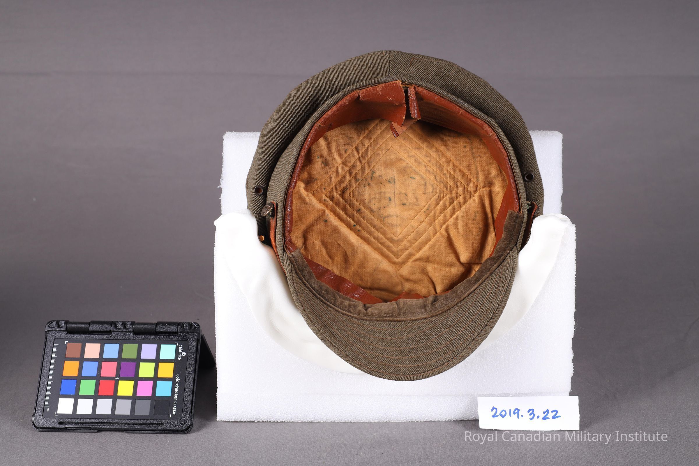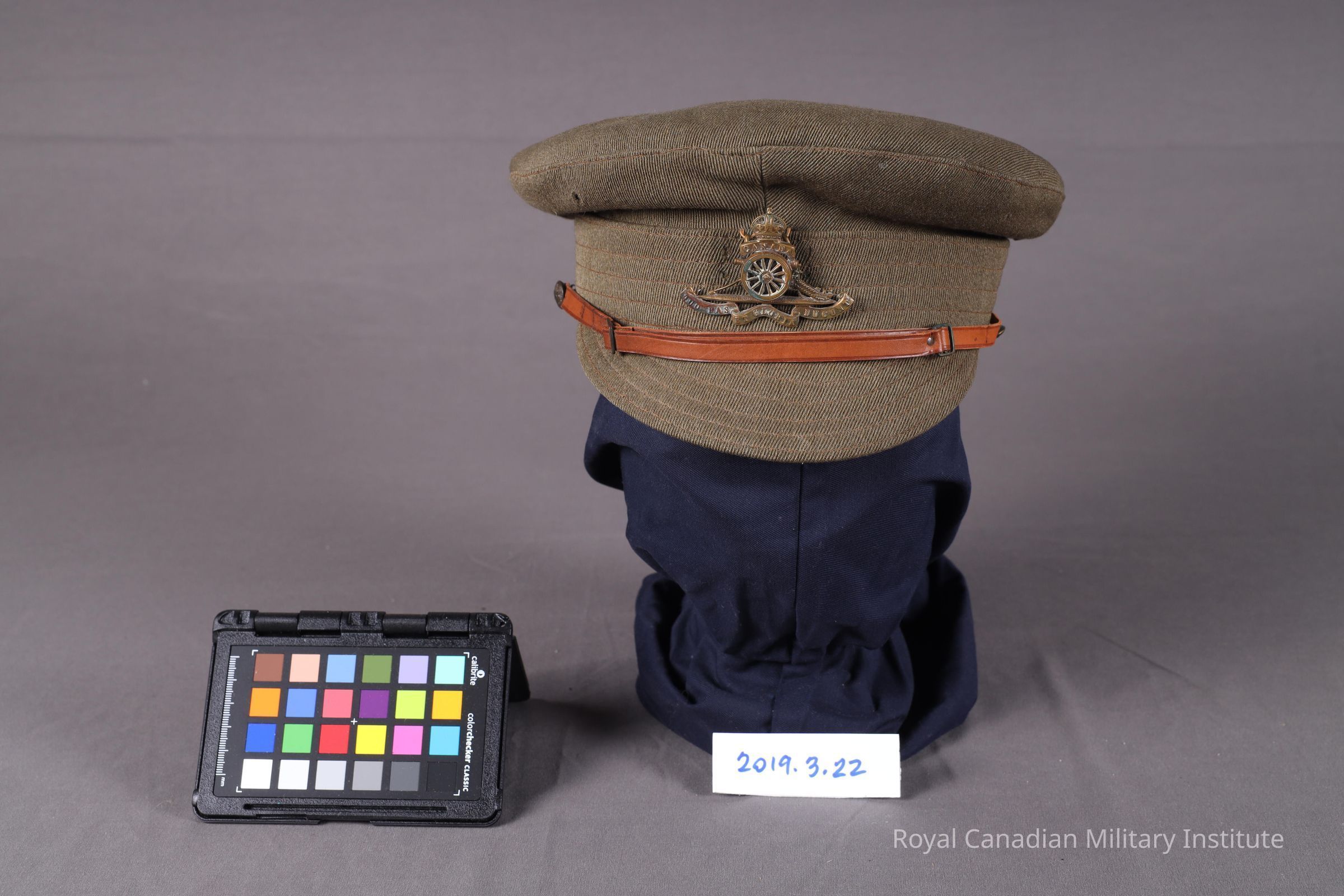 1918 Field Artillery gunner's service dress cap. Khaki green wool crown, body, cap band, soft peak (prominent stitching cap band and peak). Two ventilation grommet holes each side. Two 1.3 cm. diameter dulled brass "coat of arms" buttons hold a 9 mm. x 31 cm. adjustable, buckled light brown leather chinstrap. Loosely sewn to front is a flat brass 4.5 x 6.8 cm. Canadian Artillery Interior of soft brown leather liner, sweatband, yellow-tan cotton twill crown padding. Soft leather band 1.5 x 22.5 cms. at rear.Made/Created