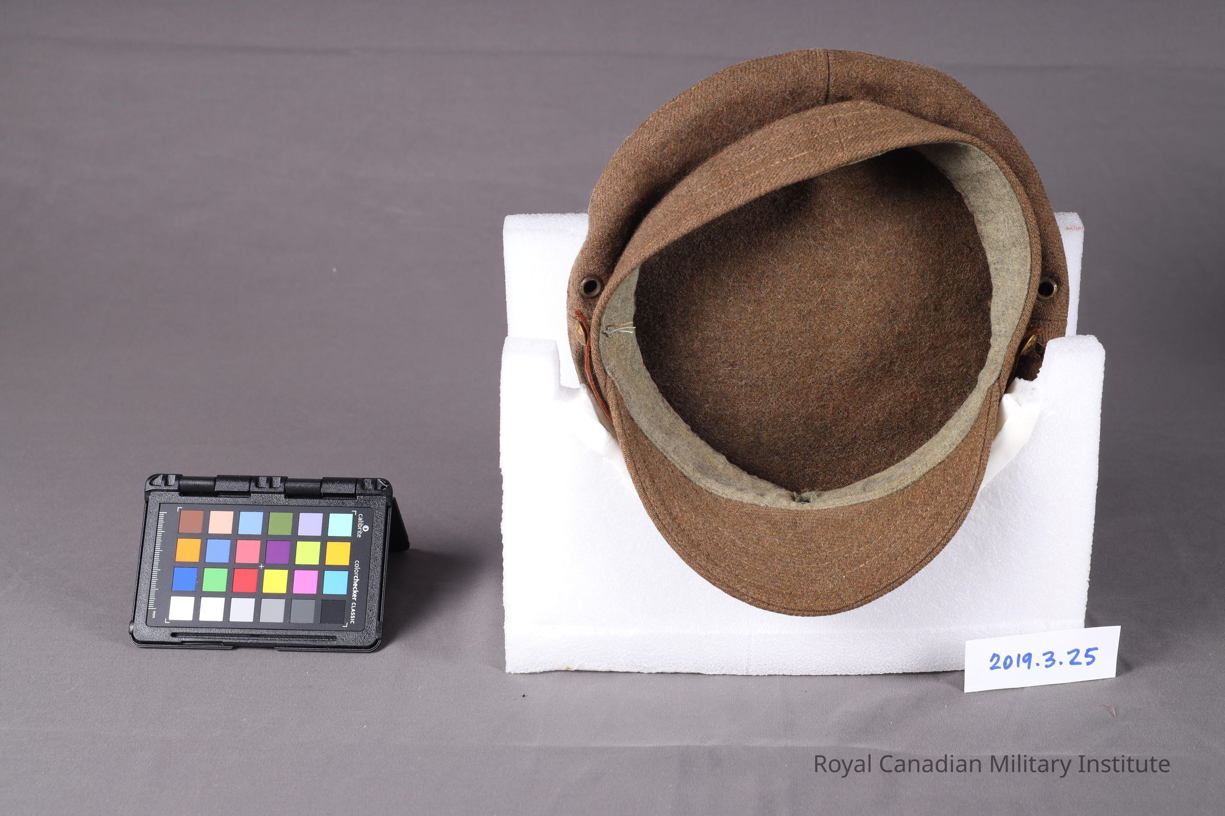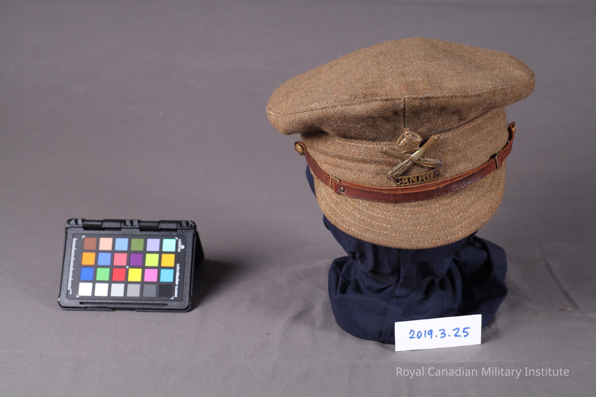 1918 2nd Division Machine Gun Corps private's service dress cap made of tan khaki serge wool. The crown is circular and unstiffened. The body is four-piece construction with two brass grommets on either side of the head. The cap band is quilted with three lines of straight stitches. On the front of the cap band (5 x 5 cm), the cap badge denoting the 2nd Division Machine Gun Corps is hooked in place with a metal bar. The cap badge depicts a royal crown superimposed over two machine guns crossed over each other. Underneath reads "CANADA." The chinstrap (32.5 cm long x 1 cm wide) is made of medium brown leather and made adjustable with two brass, rectangular buckles (1 x 1.4 cm). General list buttons (1.3 cm diameter) on either side of the attach the chinstrap to the cap band. The peak is unstiffened but its shape is held with six lines of quilted straight stitches that follow the shape of the peak.