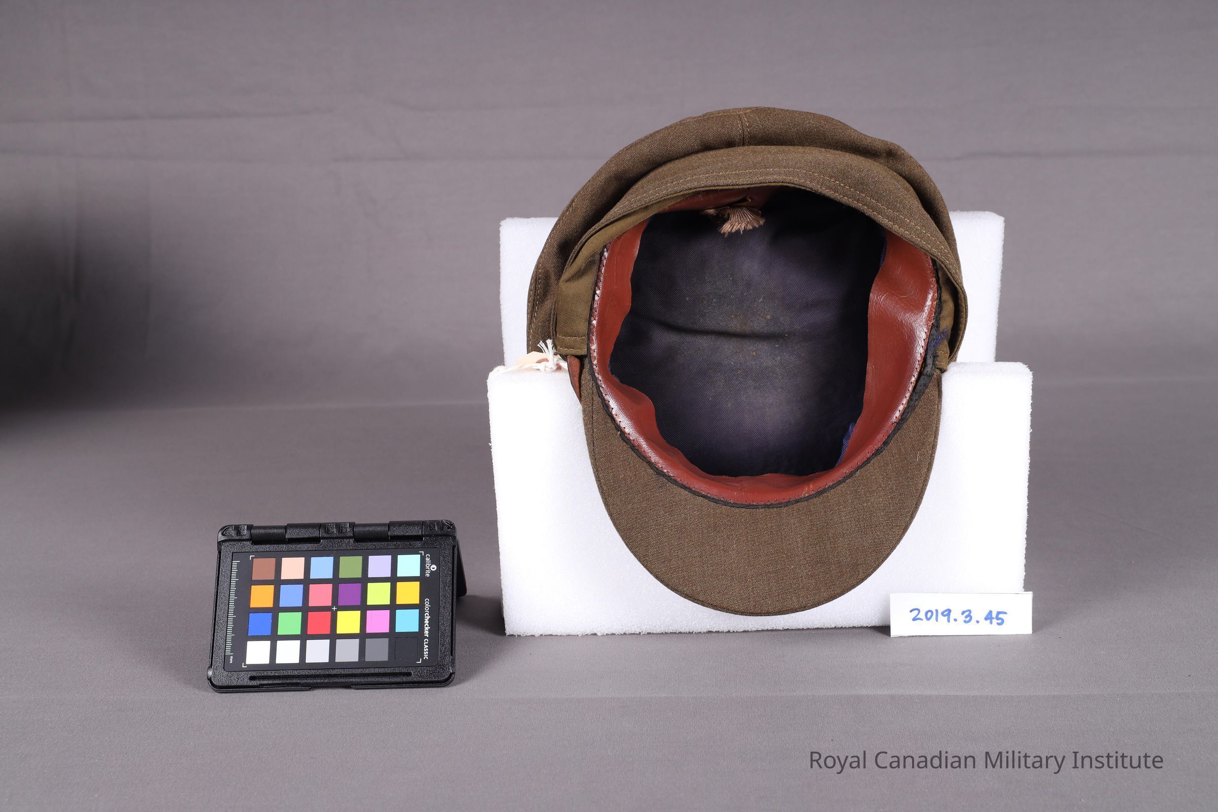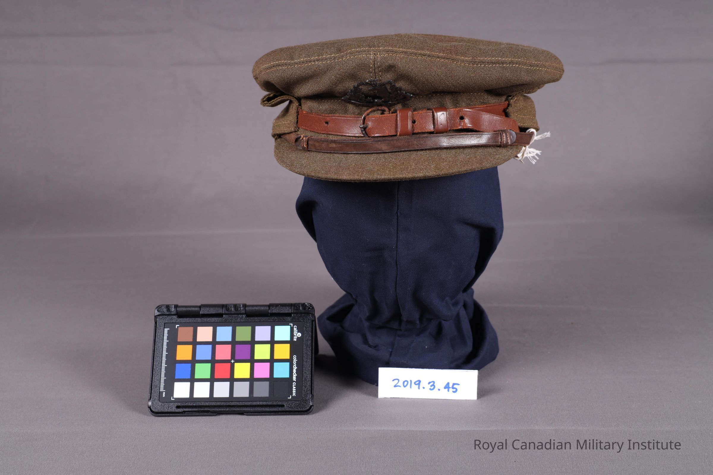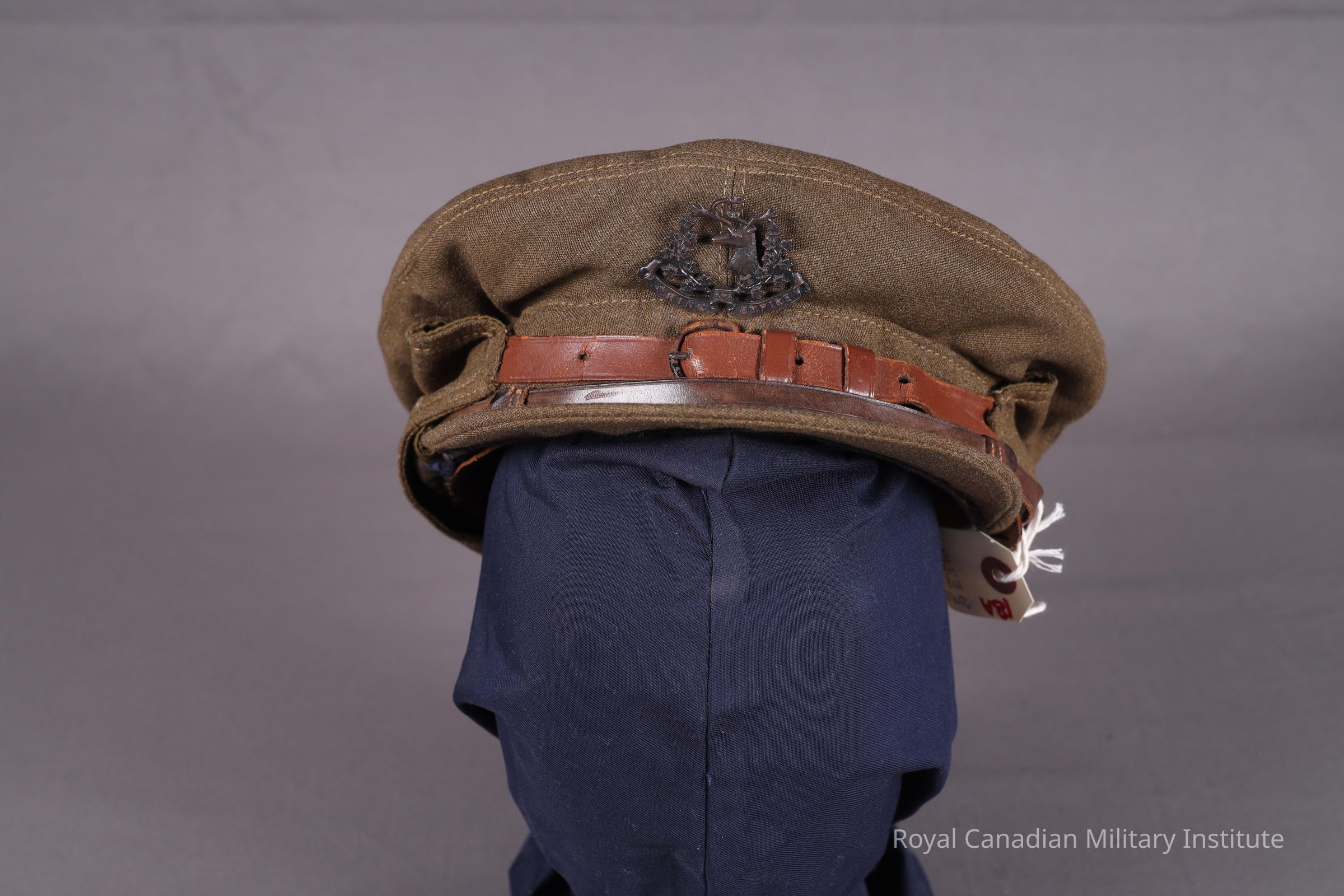 1918 16th Canadian Light Horse officer's "Gor'Blimey" service dress cap made of khaki green barathea wool. The crown is circular and attached to a two-piece body. The stitching is a double layer of contrasting lighter khaki thread. Pinned to the body is a brass cap badge (5.4 cm x 4 cm) denoting the 16th Light Horse. It depicts a male moose with laurels on either side of the body. Below, on a scroll, reads "FOR KING AND EMPIRE." The cap band is stiffened and made with two-piece construction. A dark brown leather chin strap (32 cm x 1 cm) is attached to the cap band on either side with a King's Royal Rifle button (1.3 cm diameter). The chin strap is made adjustable with leather sliders. The ear/neck flap is flipped onto the cap band and is connected in the centre front with a leather strap (19 cm x 1.5 cm adjusted to the second tightest setting) and a black D-ring buckle (2.5 cm x 2 cm). The peak is stiffened.