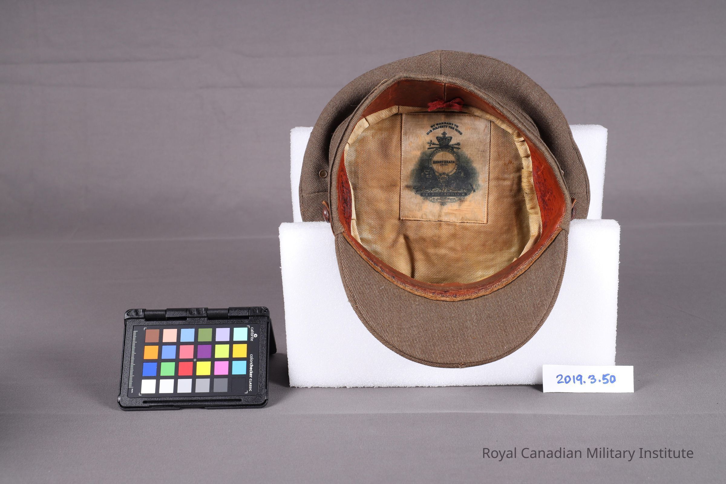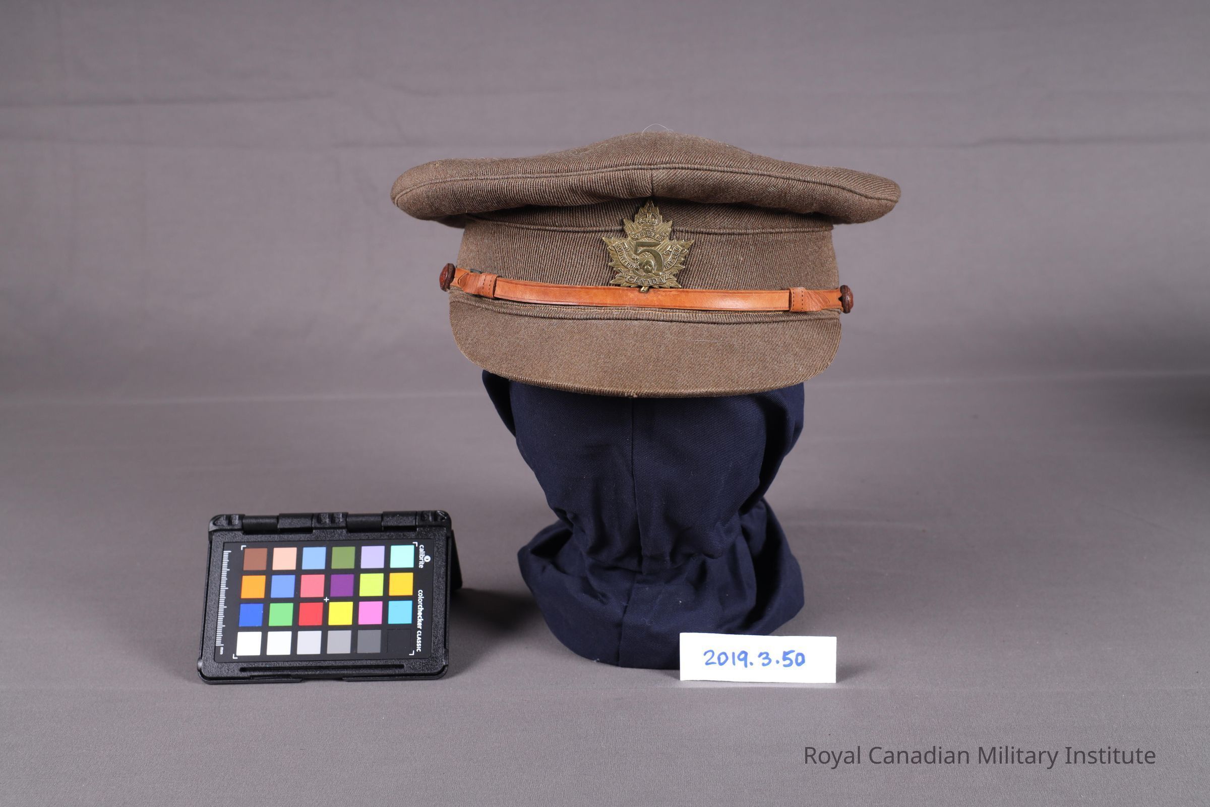 1917 5th Canadian Mounted Rifles Lieutenant's service dress cap. Tight weave khaki green barathea wool crown, body, cap band, peak. Soft crown, no wire or cane stiffener. Two ventilation grommet holes each side. Two 1.3 cm. diameter "lobed pattern" brown leather buttons hold an adjustable, buckled, light brown leather chinstrap 1 x 30 cms. Pinned to front is brass 5th CMR cap badge (maple leaf, crown atop "5" and scrolled title "Overseas Mounted Canada", also a beaver, 4 x 4.4 cms. Stiffened peak. Interior of woven hemp covered with light green cotton twill. 4.2 cm. high red-brown leather sweatbandMade/Created