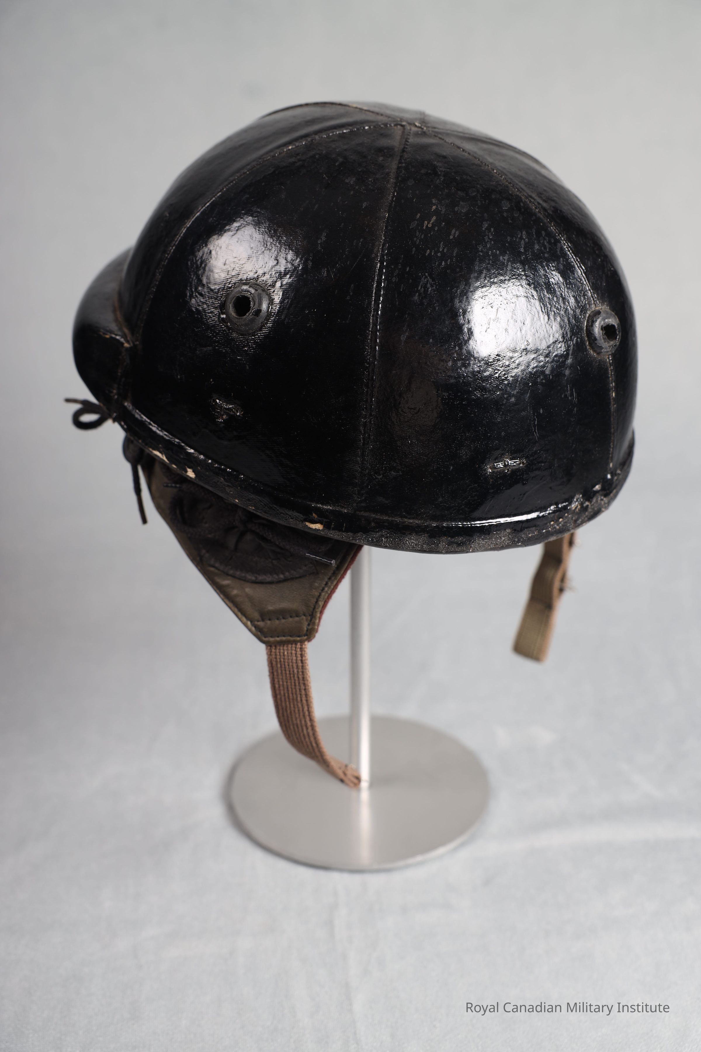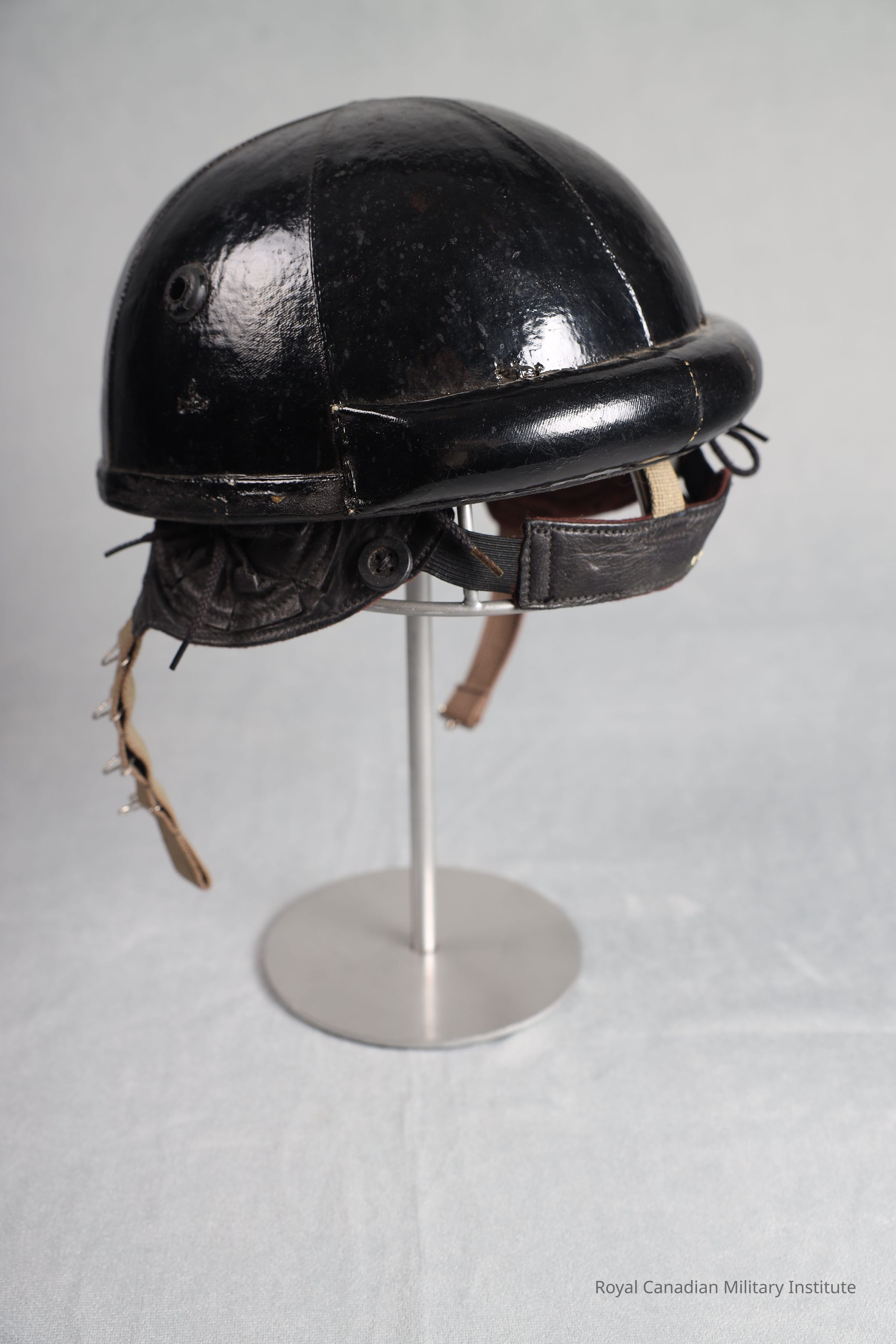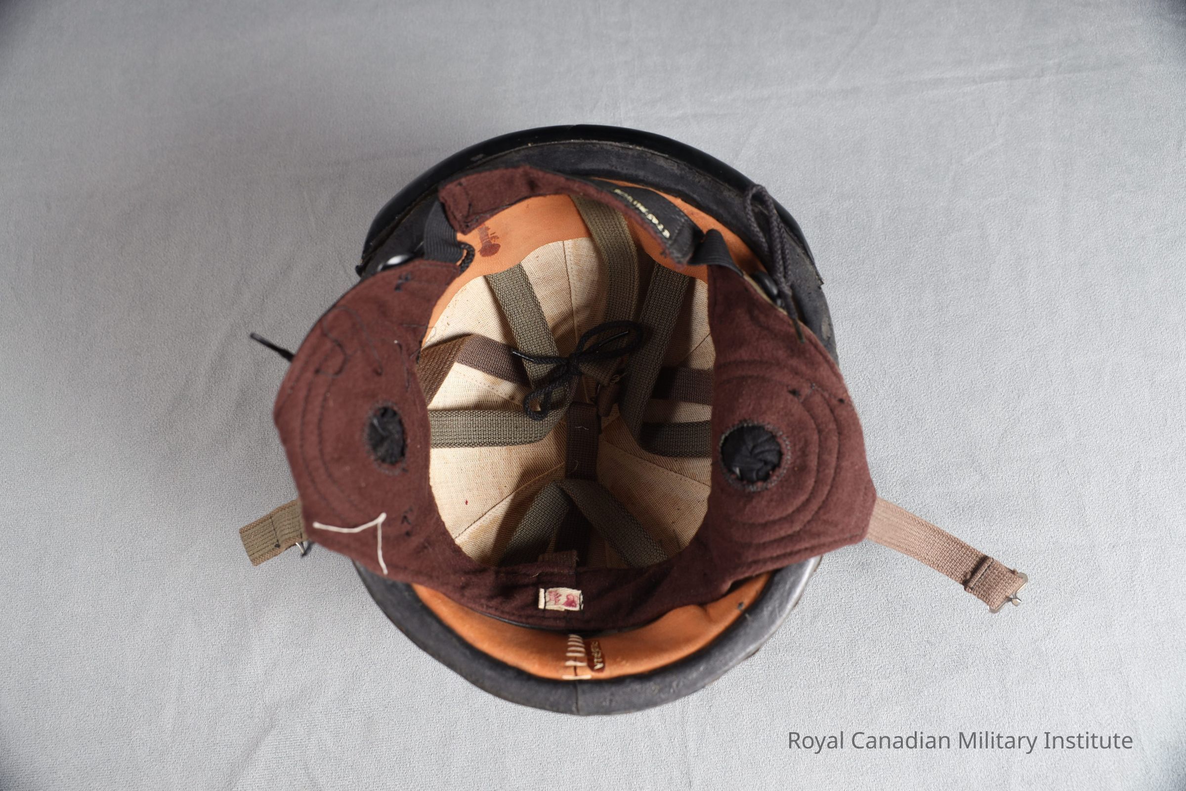 1943-1944 Canadian Armoured Corps training helmet liner made of black leather and lined with brown wool fleece. It joins to the helmet suspension with its own brown web suspension. The chin strap (9.2 x 1.8 cm and 12 x 1.8 cm) is adjustable using a single hook and four different hook bars. The front of the liner has black elastic to adjust to the head. On either side of the front of the head are black plastic buttons (1.7 cm diameter) to attach the liner to the helmet.Made/Created