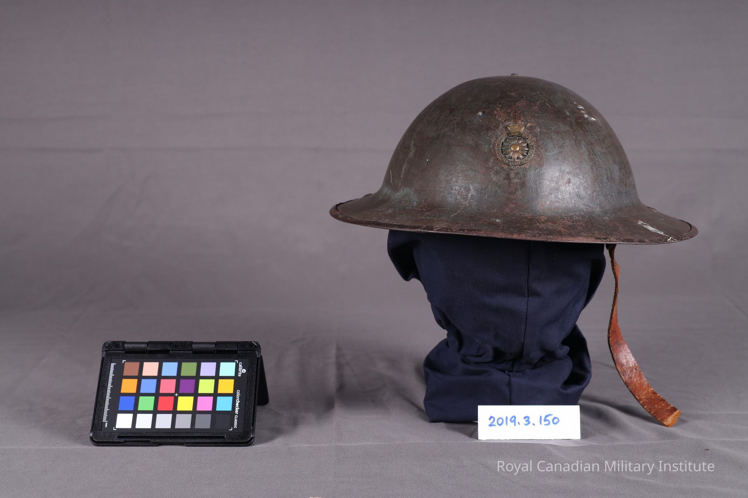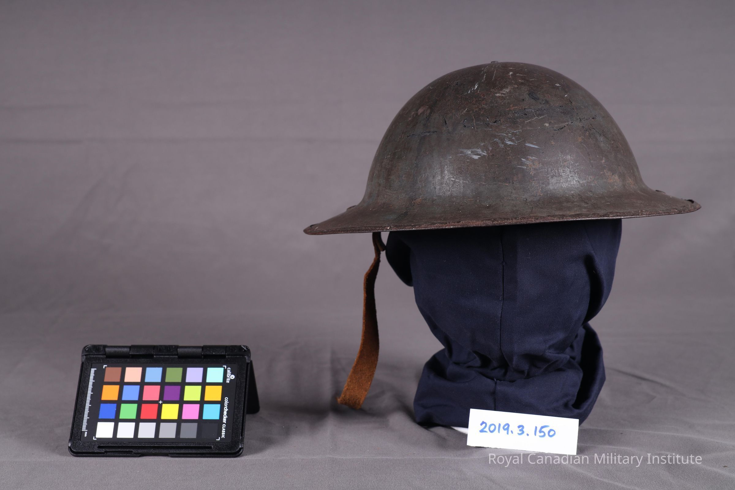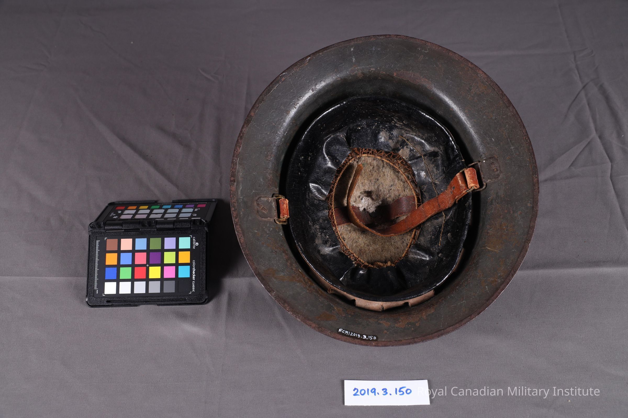 1917 - 1918 2nd pattern painted Brodie helmet with Princess Patricia's Canadian Light Infantry badge. Circular basin shape, manganese steel. Dark green paint, 20% of finish remains. PPCLI brass cap brazed to front (crown atop scrolled title, Princess Marguerite flower in centre). Dents on top of badge. Black oilskin liner and cotton netting in good condition. Horsehair liner and rubber doughnut in fair condition. Leather chinstrap missing end piece.Use