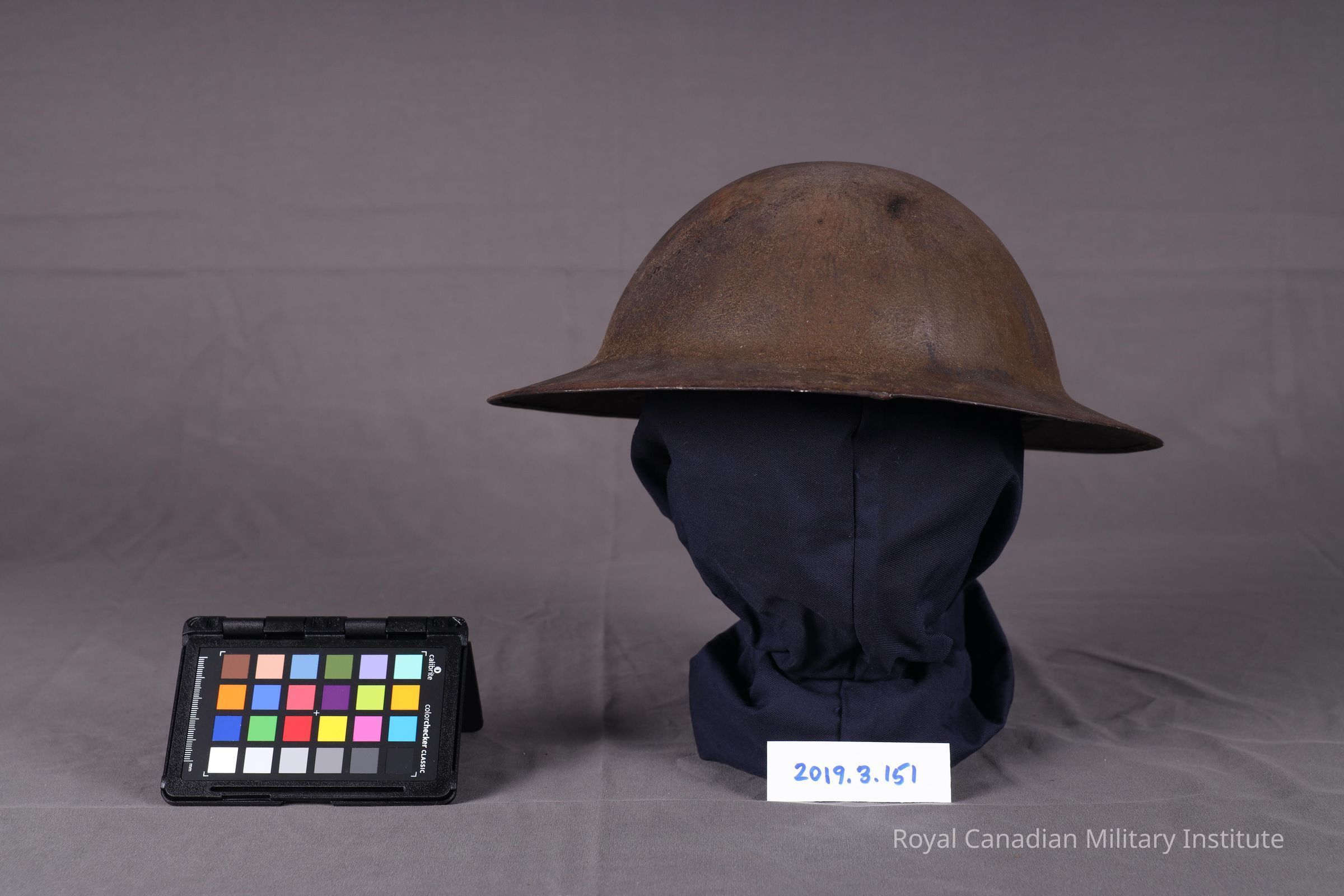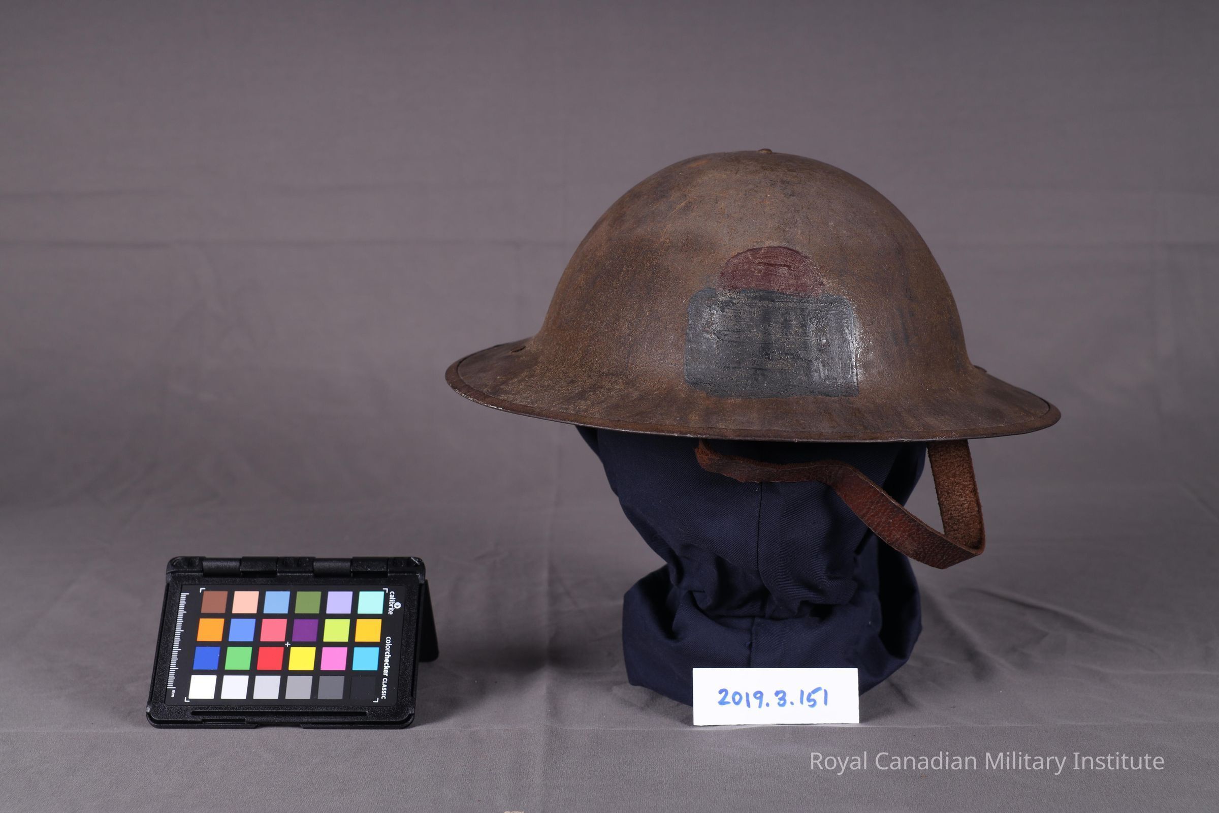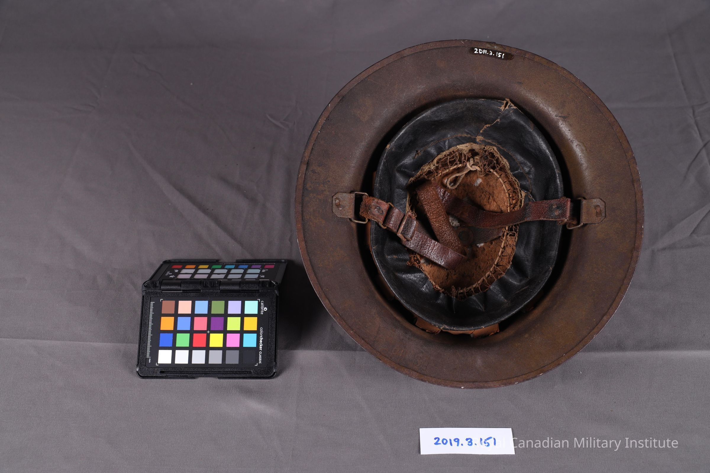 1917-1918 2nd pattern painted Brodie helmet with 24th Infantry Battalion insignia. Circular, basin shape, manganese steel. Dark green/brown khaki paint, 25 percent of finish remains. Insignia is 7.5cm x 4cm blue rectangle with 4cm x 2cm red semi circle on top. Black oilskin liner, cotton netting and leather chinstrap in good condition. Rubber doughnut missing.Made/Created