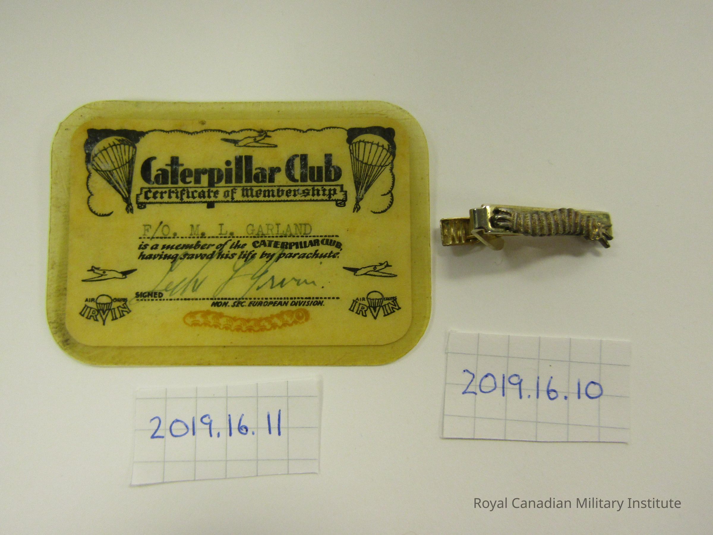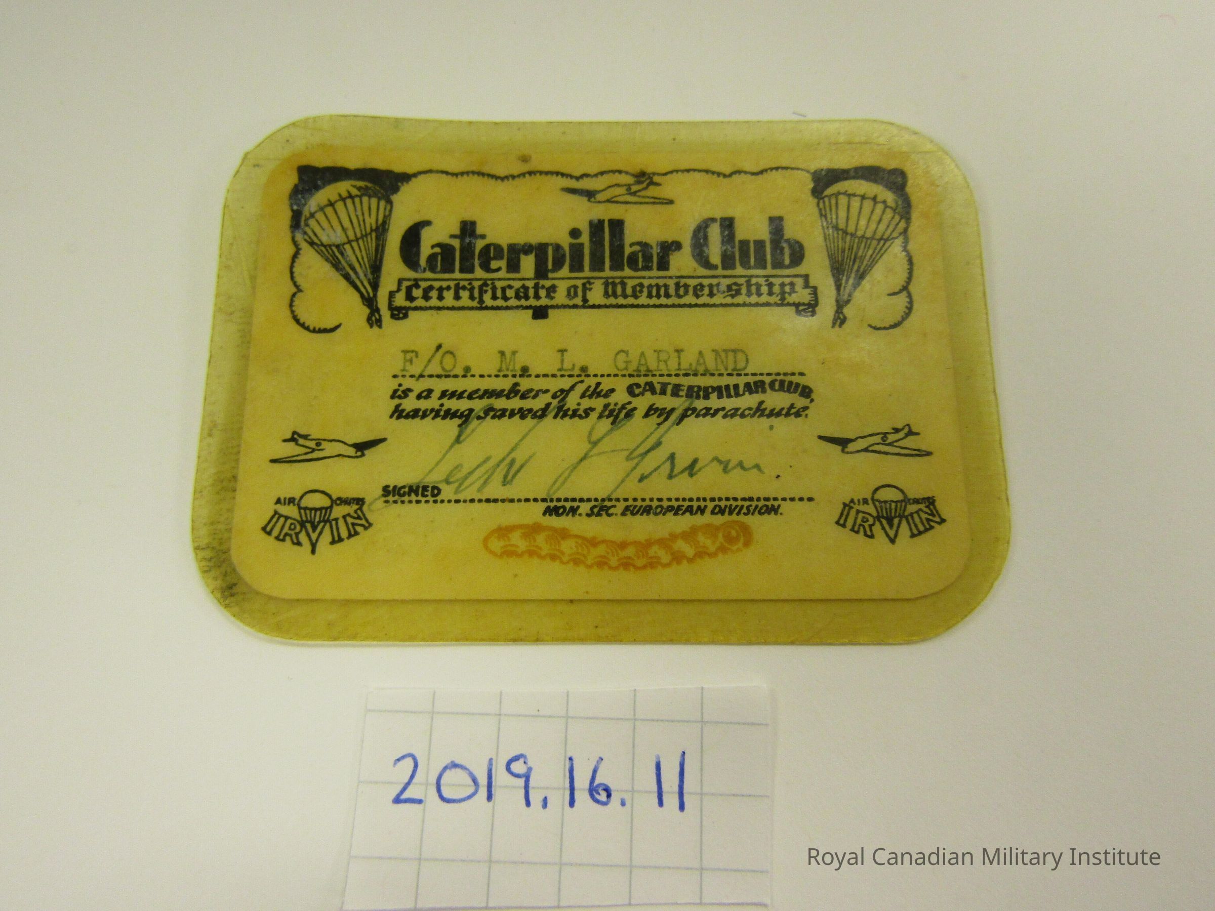 1944-1945 Irwin Parachute Company Caterpillar Club Certificate of Membership card. Rectangular tan-yellow card with black printed title CATERPILLAR CLUB CERTIFICATE OF MEMBERSHIP flanked by two open parachutes and aircraft drawing. In middle of card is typed "F/O. M.L. GARLAND" and text "is a member of the Caterpillar Club having saved his life by parachute" Signed at bottom "IRWIN" At bottom is logo of IRVIN AIR CHUTE and an orange caterpillar.Made/Created