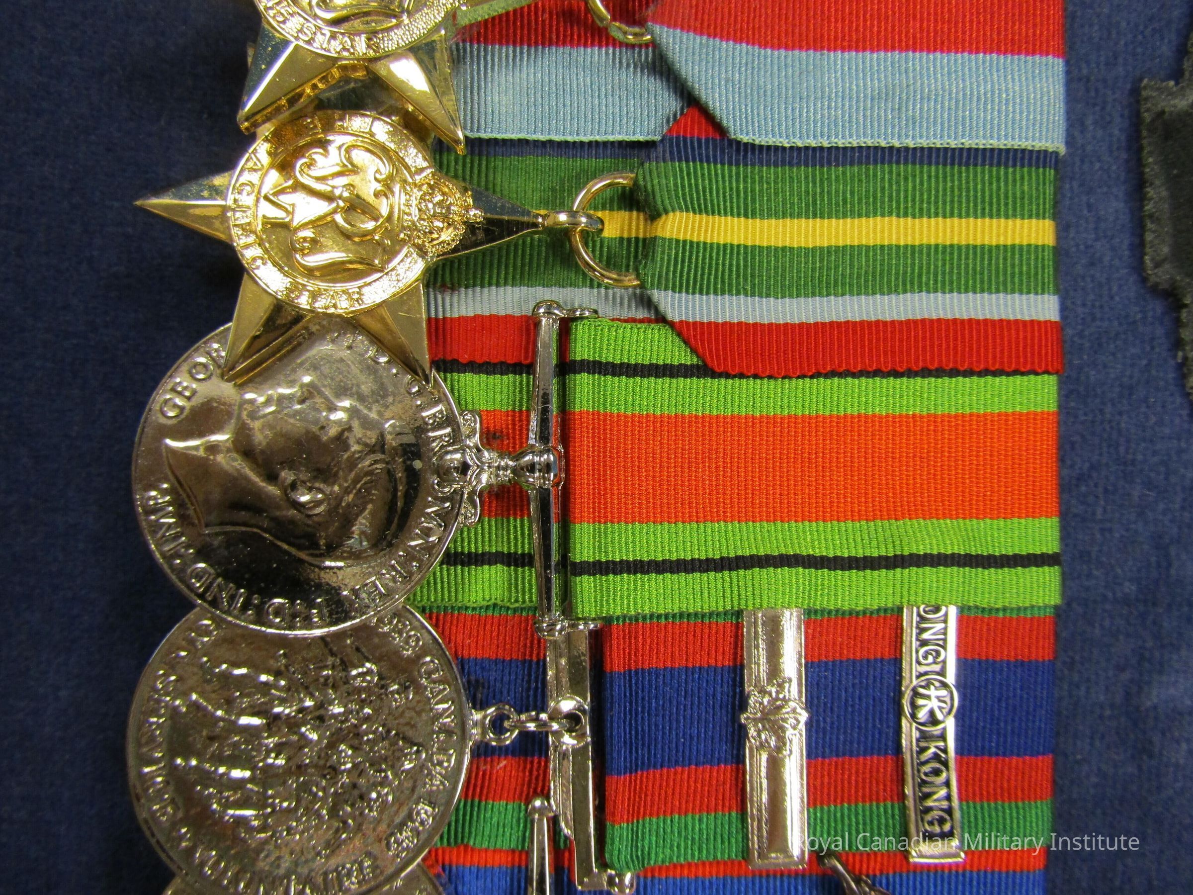 1939-1945 Defence Medal. Circular, silver. Obverse shows a bereheaded King George VI with title "GEORGIVS VI:D:G:BR OMN:REX:F:D:IND:IMP" Reverse shows Royal Crown on stump of oak tree flanked by lion and lioness, title "1939 THE DEFENCE MEDAL 1945" Medal not numbered, has been plated, court-mounted in group of six medals.Made/Created