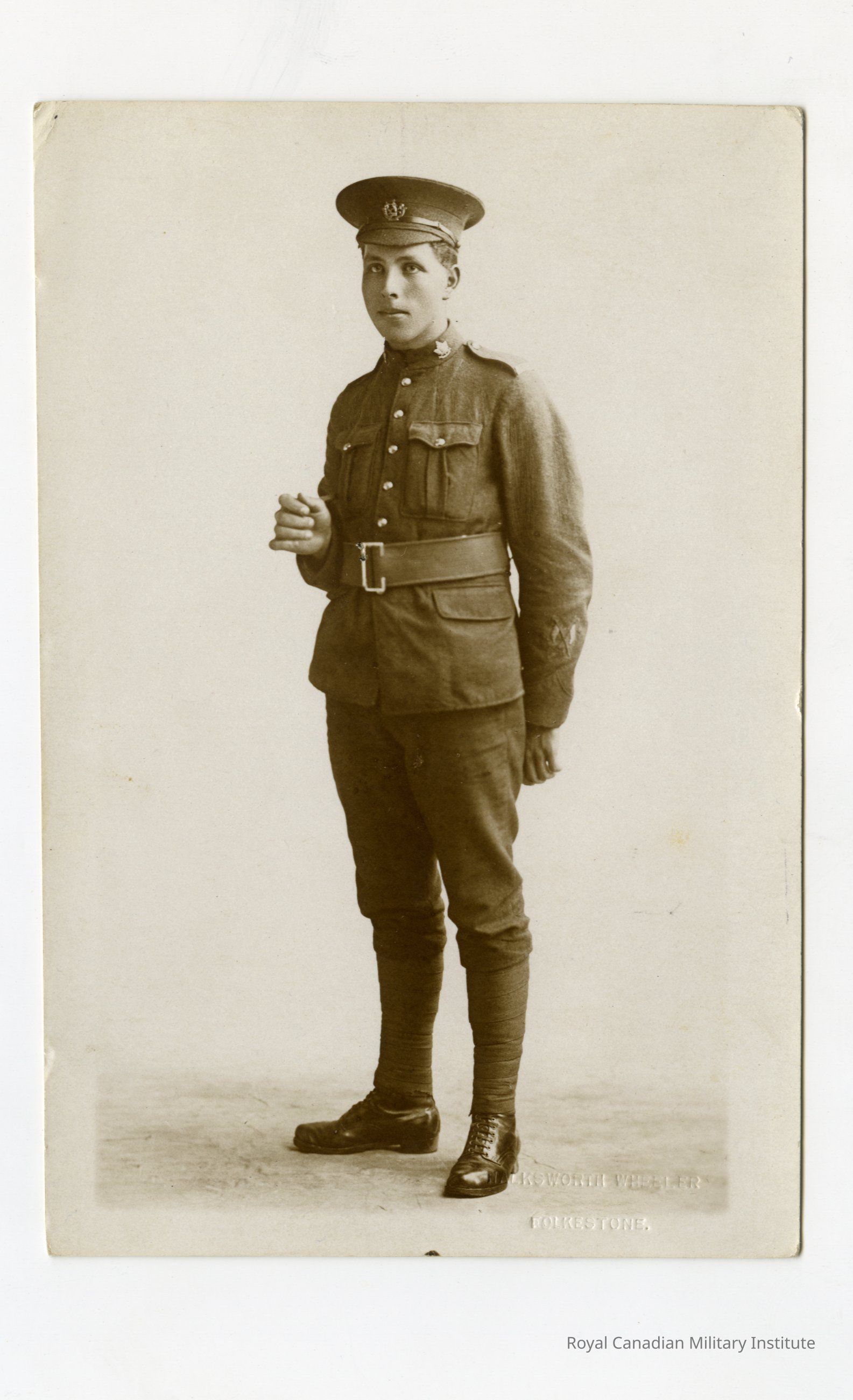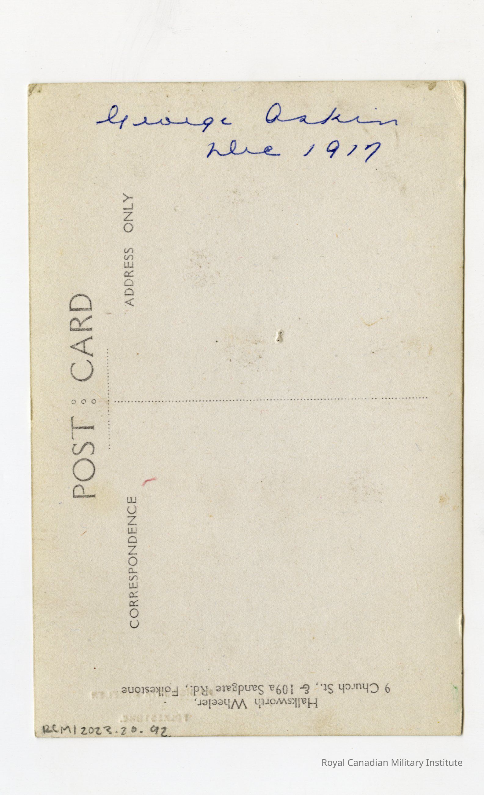 A Real Photo Postcards (RPPC) of Robert George Askin # 235008, 8th Battalion "Black Devils". Subject is standing slightly angled from the camera, his line of sight slightly above the camera. His right arm is raised slightly, while his left arm is resting at his side. The inscription on the back identifies this man as "George Askin" in "1917". Embossed on the bottom right corner of the front side, "Halksworth Wheeler / Folkstone".
