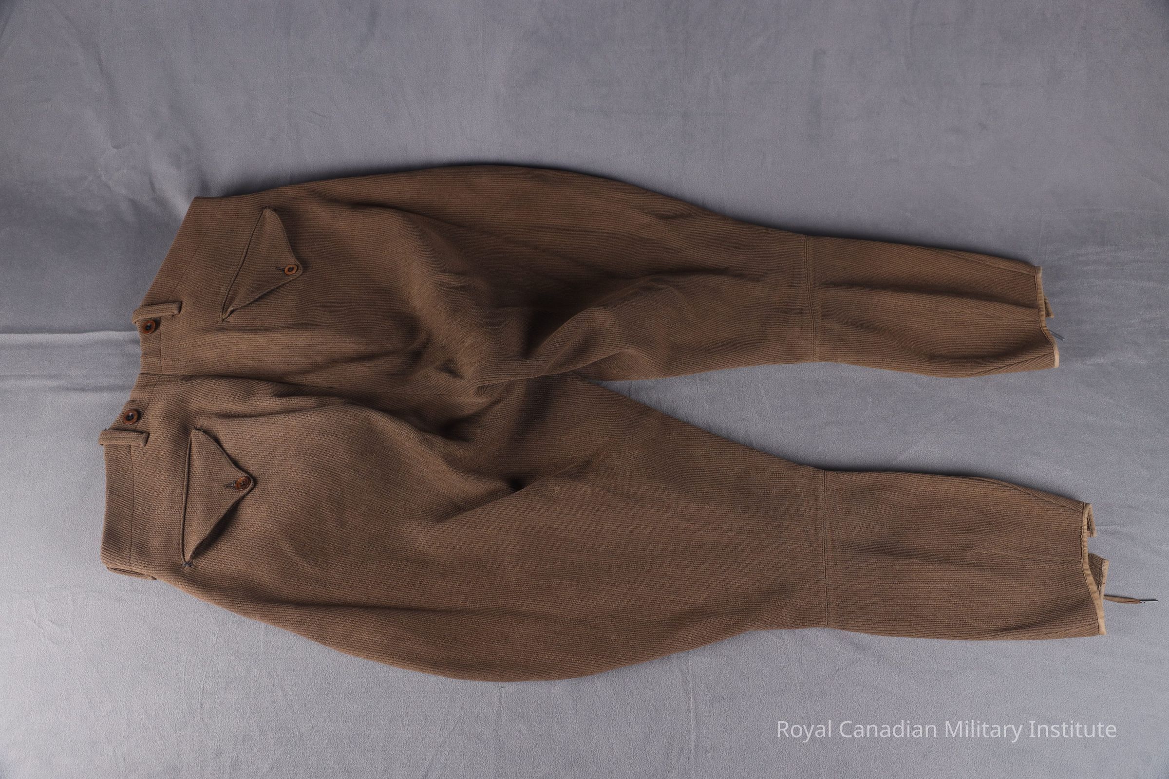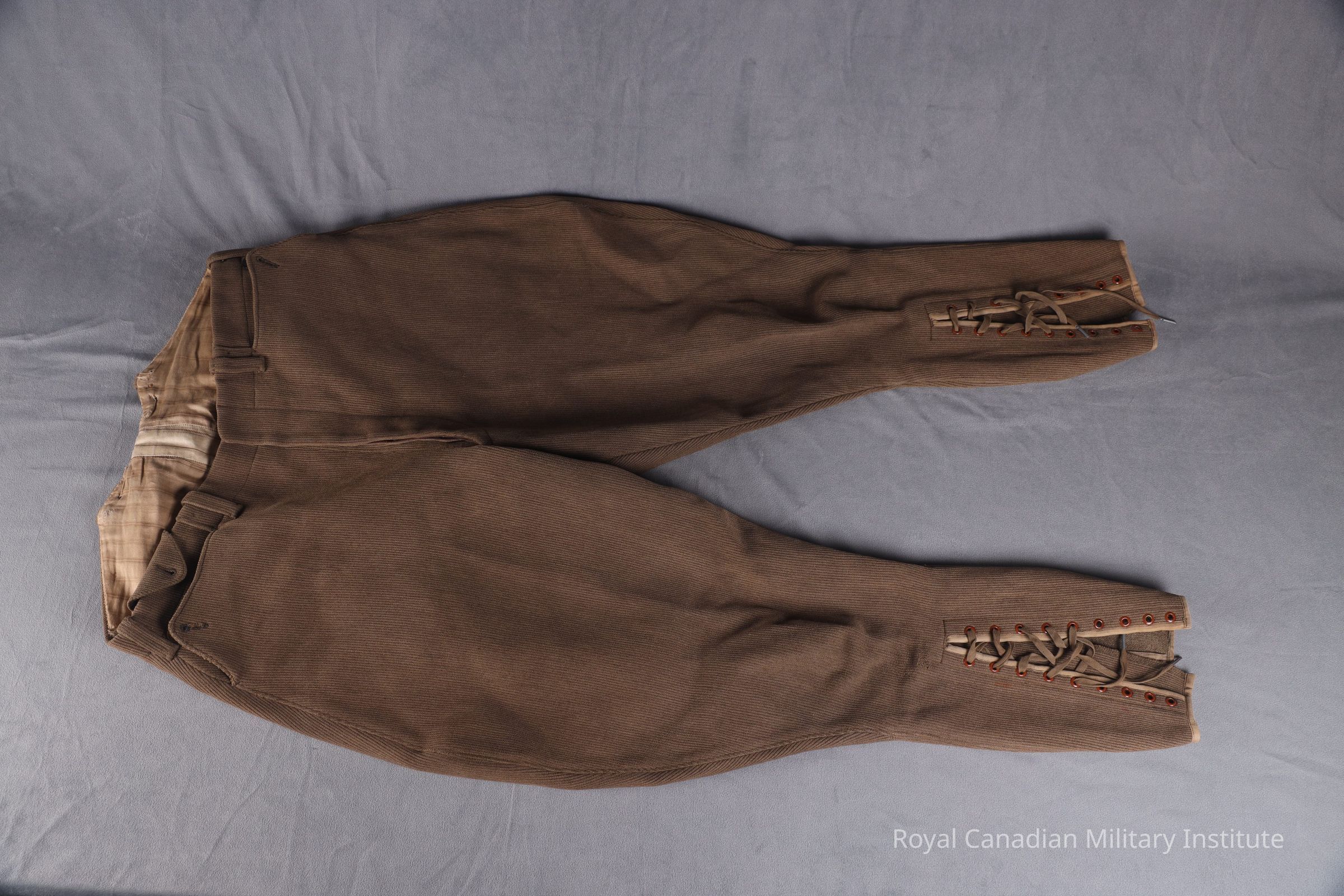 1916 Canadian Expeditionary Forces 118th Infantry Battalion Lieutenant's Breeches made of brown khaki whipcord wool. Five plastic buttons (1.5 cm) close the hidden fly. Two are black, and three are brown of various shades and patterns. The waistband (3.5 cm wide) has six belt loops (5.5 cm long x 1.5 cm wide). The back of the waistband is raised to form a double peak with two decorative brown buttons (1.5 cm) to the centre of either peak. Two reversed scalloped pockets with a brown button (1.5 cm) closure. One scalloped watch pocket on the right waistband closed with a brown button (1.5 cm). The hem of the legs are closed with a lacing placket (23 cm long) with nine brass grommets (painted brown) (1 cm) on either side. They are closed with one long, brown lacing tape fixed with a silver coloured aglet. The lacing placket and hem are finished with a contrasting tan twill tape folded to be 5 cm thick. On the back, are two scalloped pockets, each closed with a brown button (1.5 cm) of different shades of brown and patterns. The inside is unlined. Stripped brown cotton or silk is used to reenforce the waistband on the inside. A hidden pocket on the left side of the waistband is closed with a single brown button (1.5 cm). On either side of the front inner waistband are two brown buttons (1.7 cm).Context