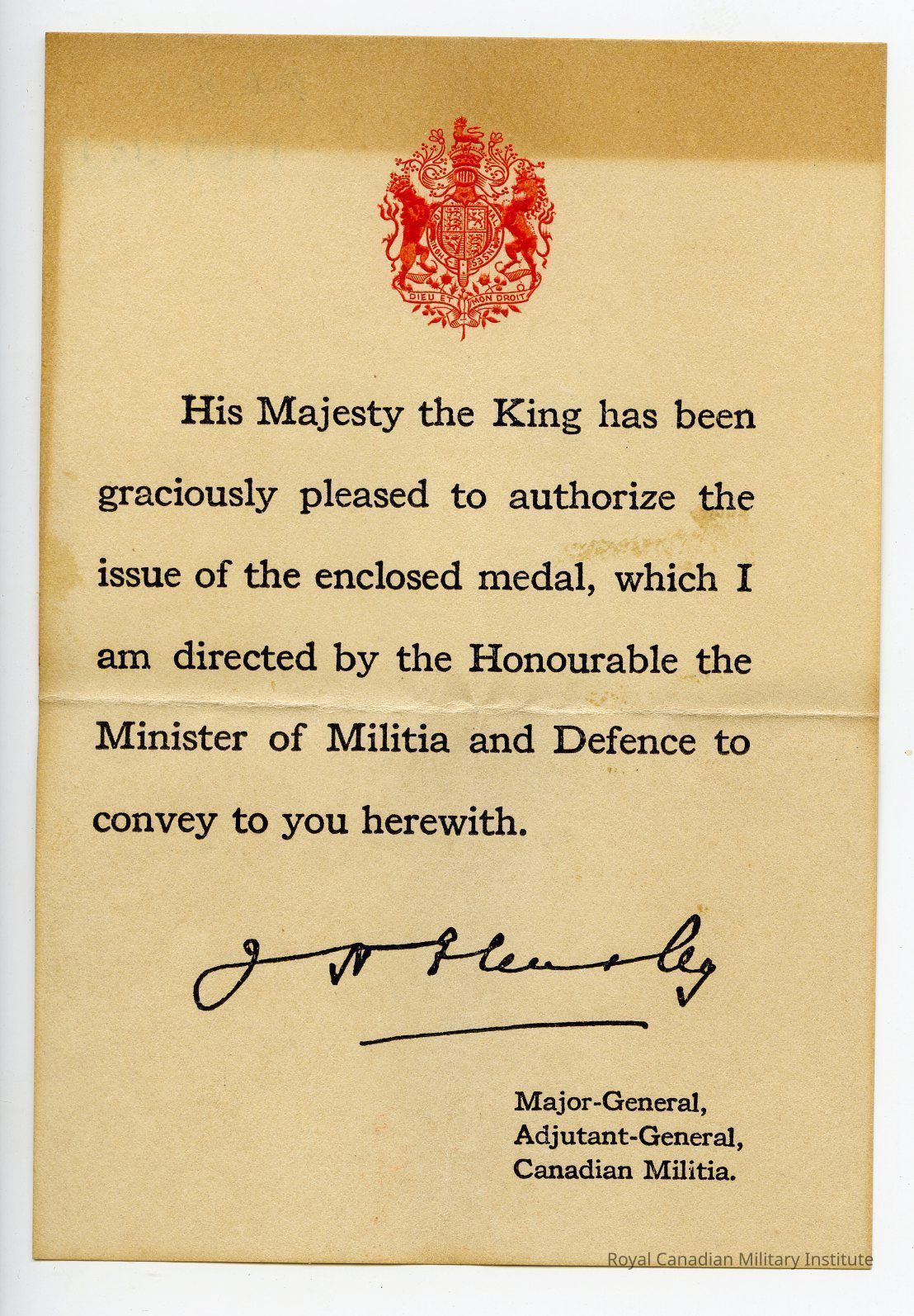 1914-1919 Allied Victory Medal authorization slip, Canadian version. Rectangular, tan paper. At top in red ink or paint is embossed British coat of arms. Below is text in black: "His Majesty the King has been graciously pleased to authorize the issue of the enclosed medal, which I am directed by the Honourable the Minister of Militia and Defence to convey to you herewith." Signed below by Adjutant-General, Canadian Militia.Dimensions