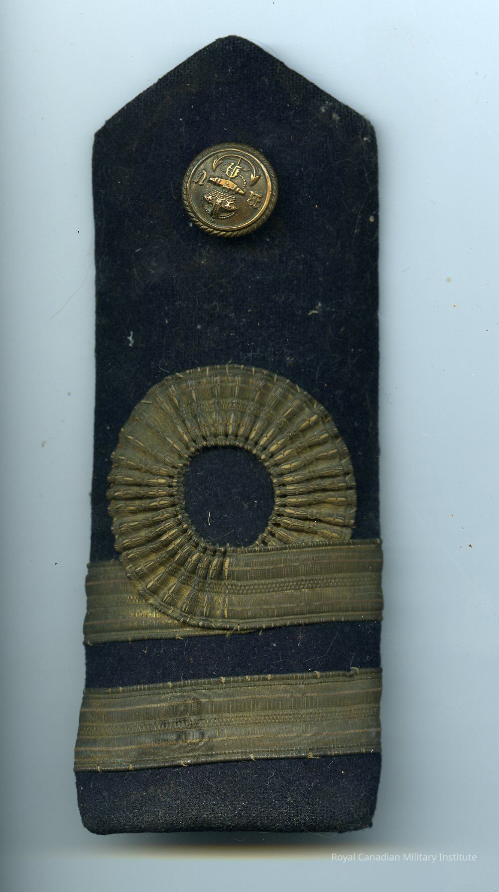 1914-1918 Royal Navy officer's shoulder board, rank Lieutenant. Curved rectangular sheet metal base with dark blue wool covered upper, underside is tan leather with 3.2 x 11.5 leather retaining strap. One end is holed, with threaded brass post holding 1 brass button 1.8 cm diameter. Button is marked with King's Crown, fouled anchor, letters "RV". Stitched to top are gold lace stipes and executive curl for rank of Lieutenant.Made/Created