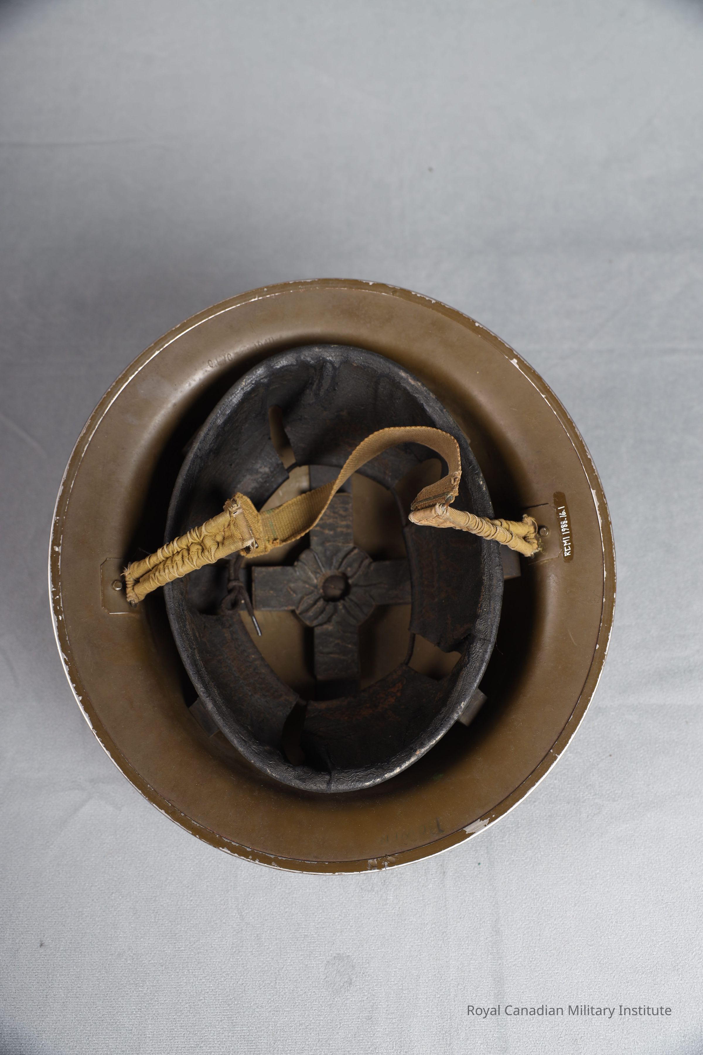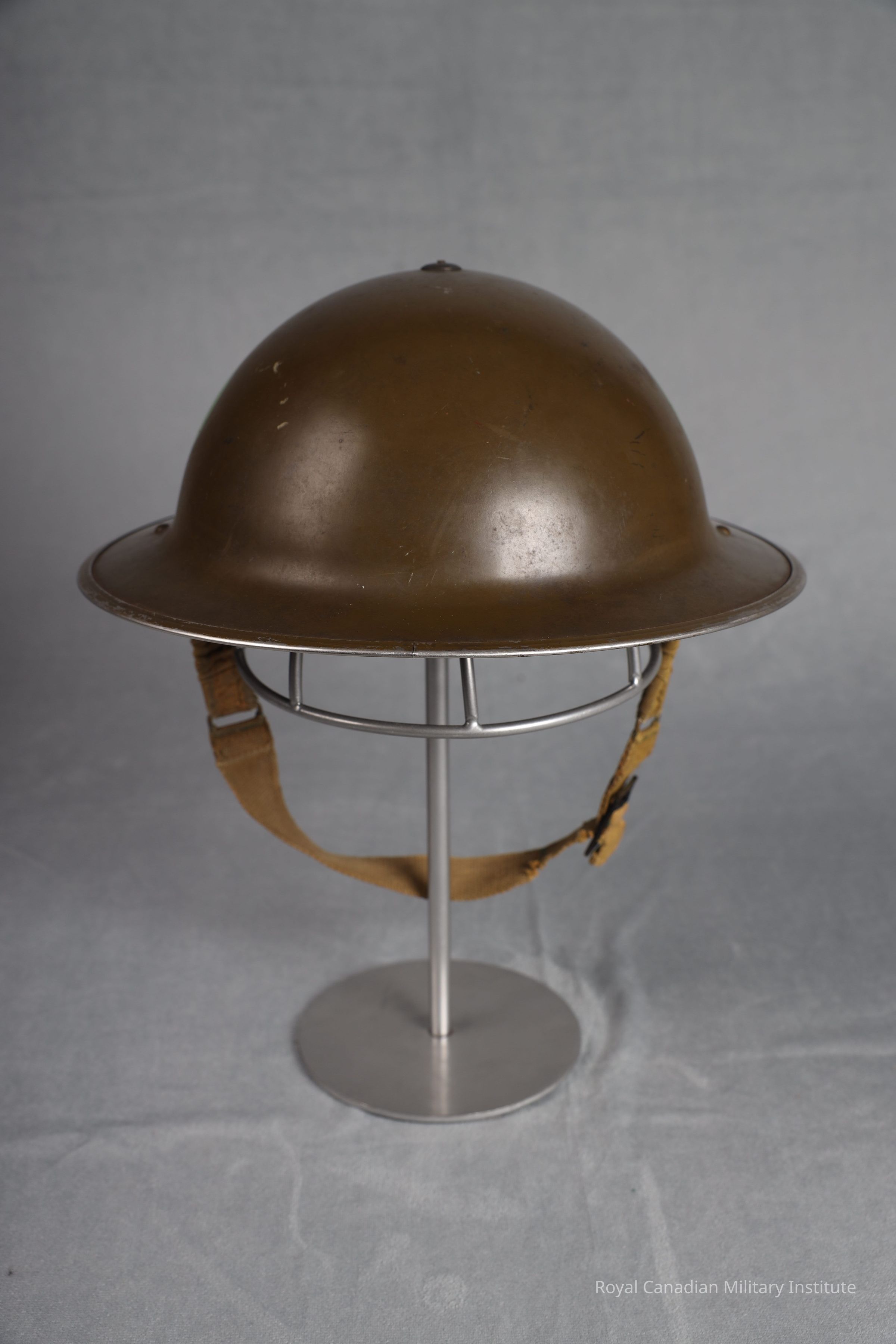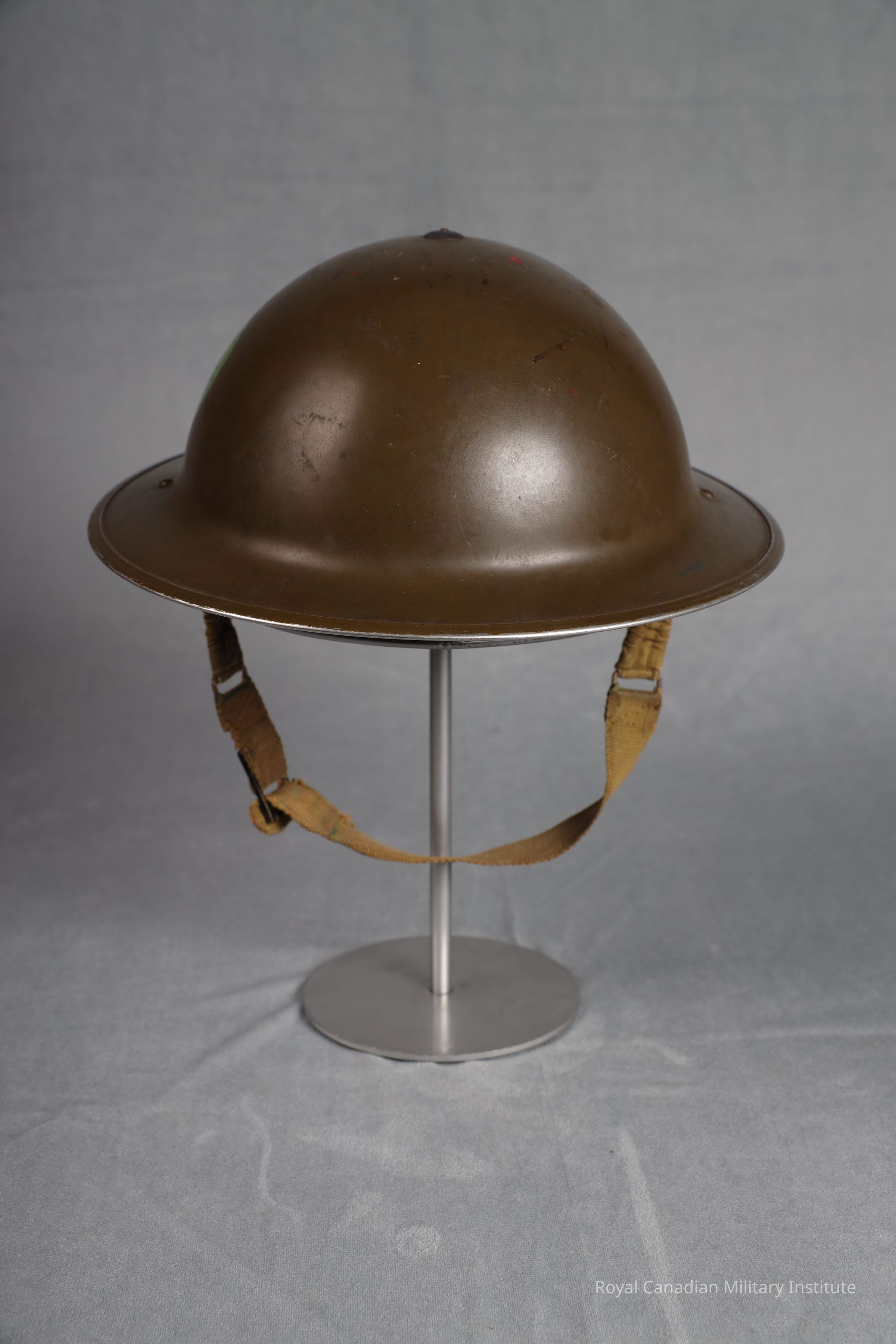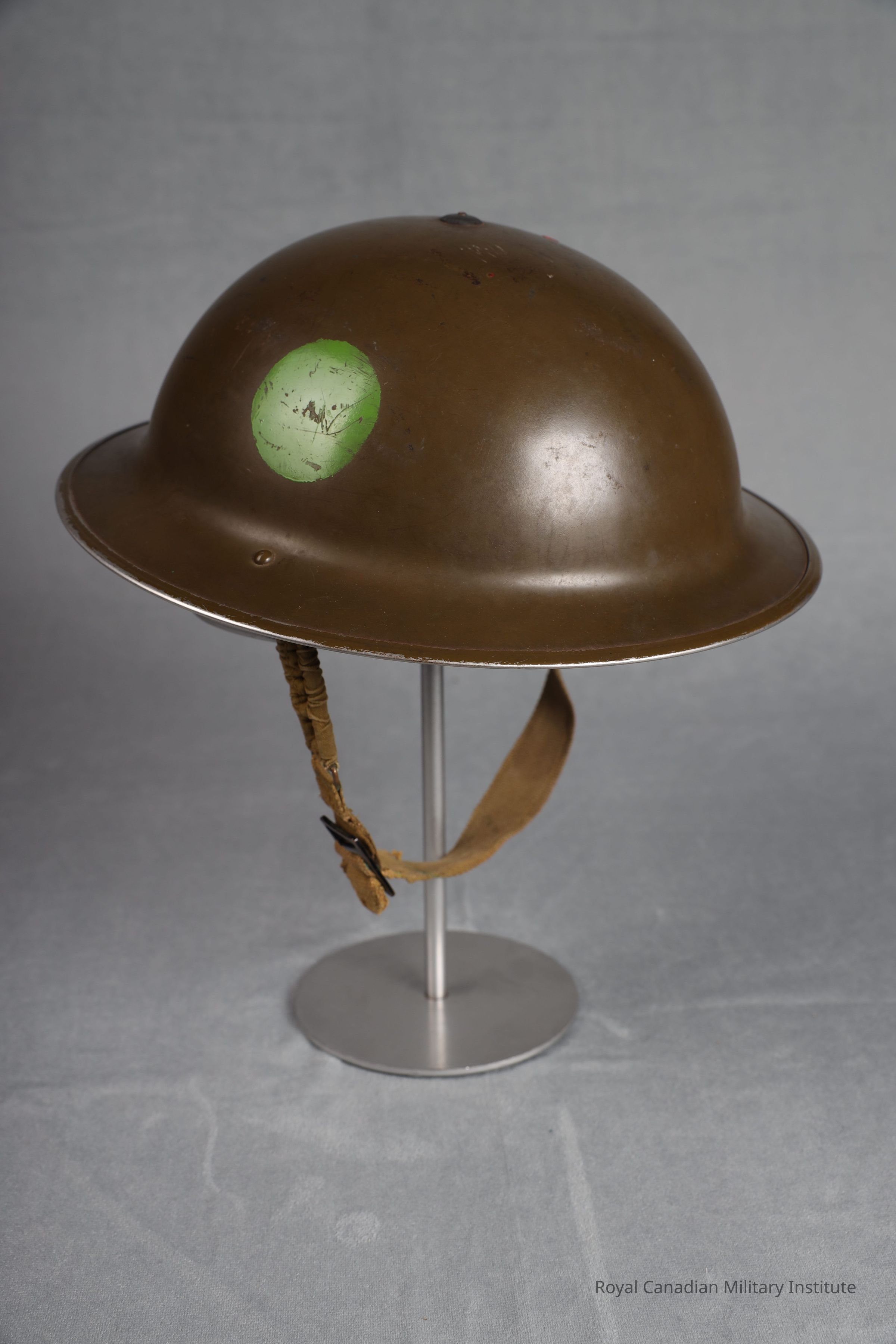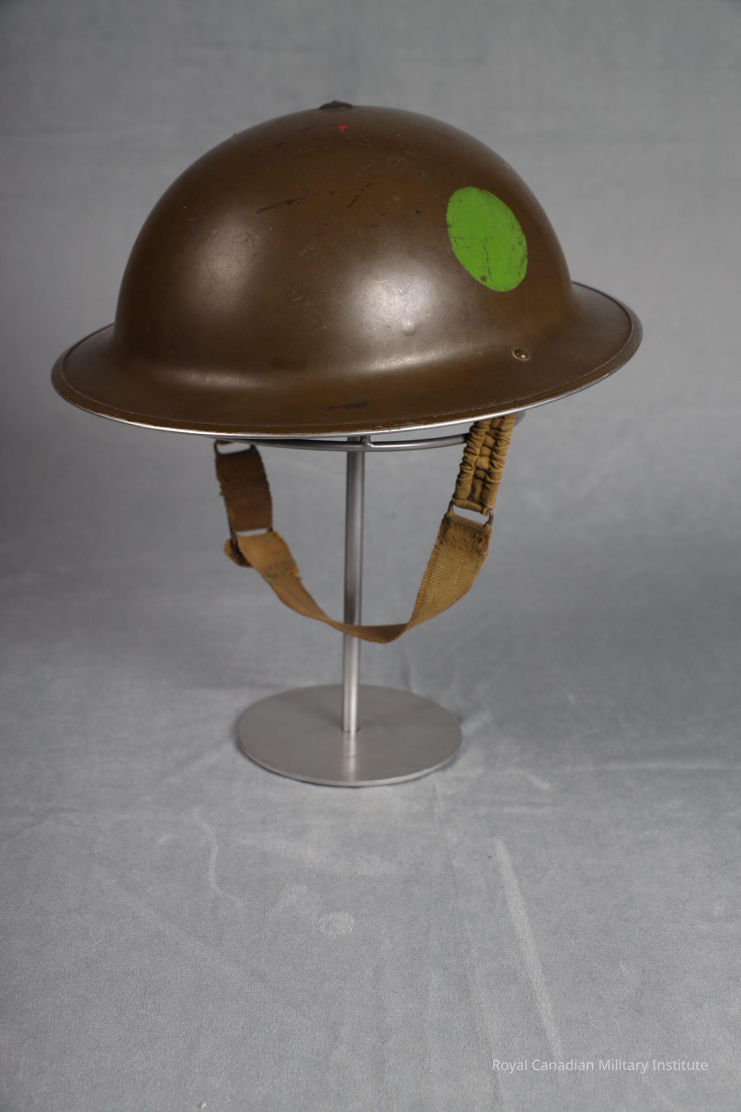 1940 Canadian Army Mark II steel helmet. Circular, basin shaped, mid-khaki green smooth painted manganese steel. Canadian Headquarters green circle (5 cm diam.) on left/right sides. Separate crimped rim. Black rubber/canvas lining fastened by top screw and two steel bands. Elasticized green cotton chinstrap fastened to two rivetted bales. Chinstrap is 2.5 x 44.5 cms.Use