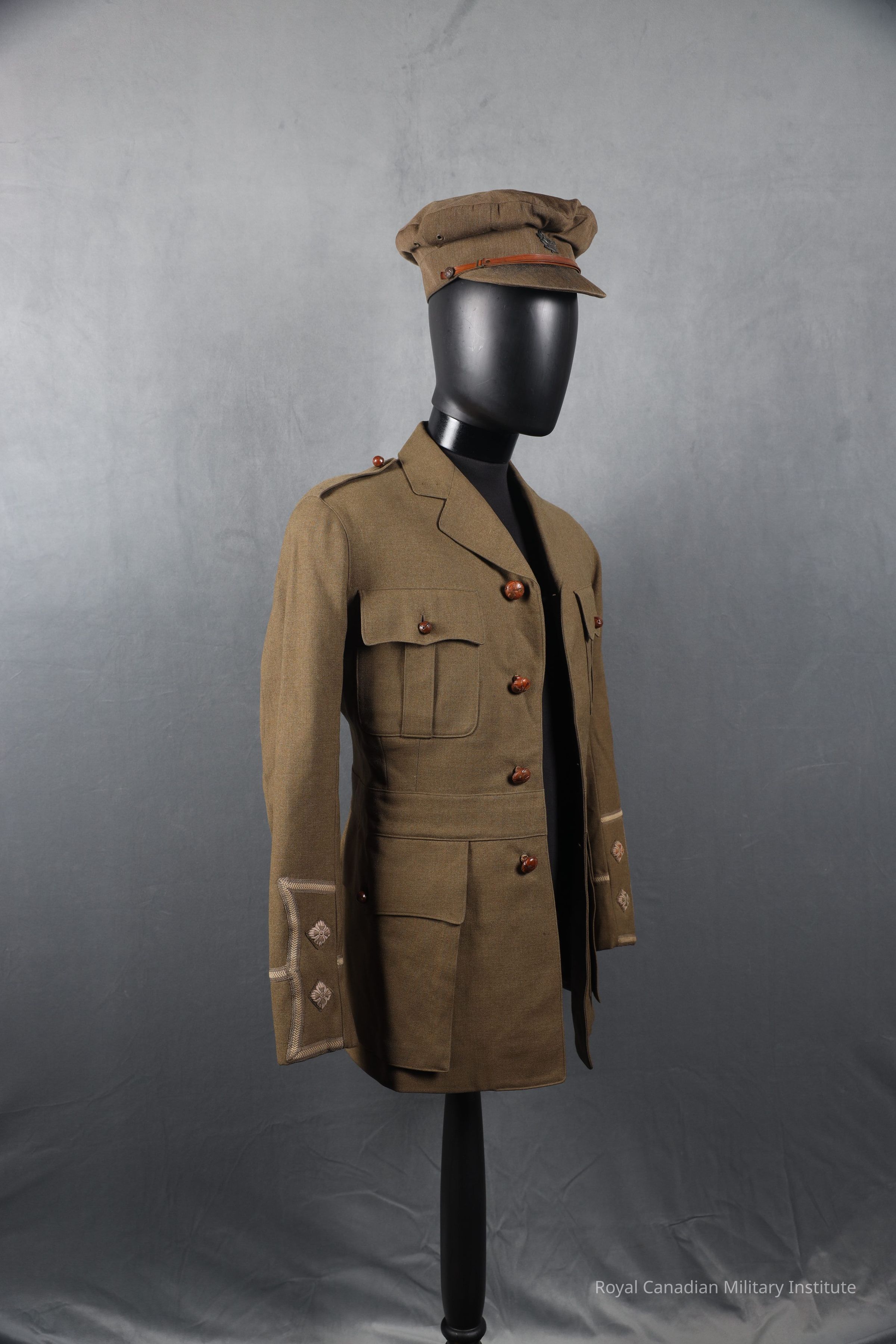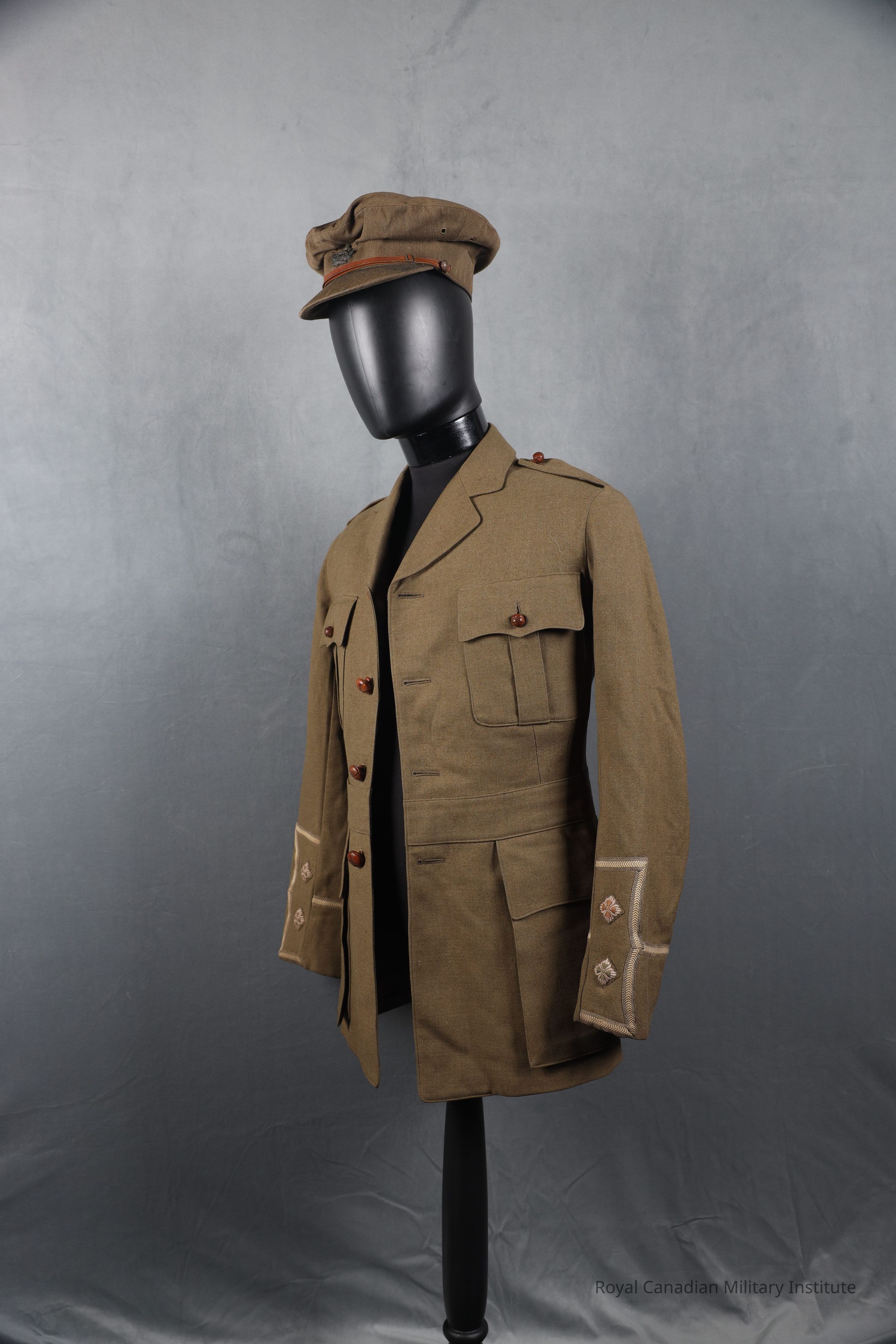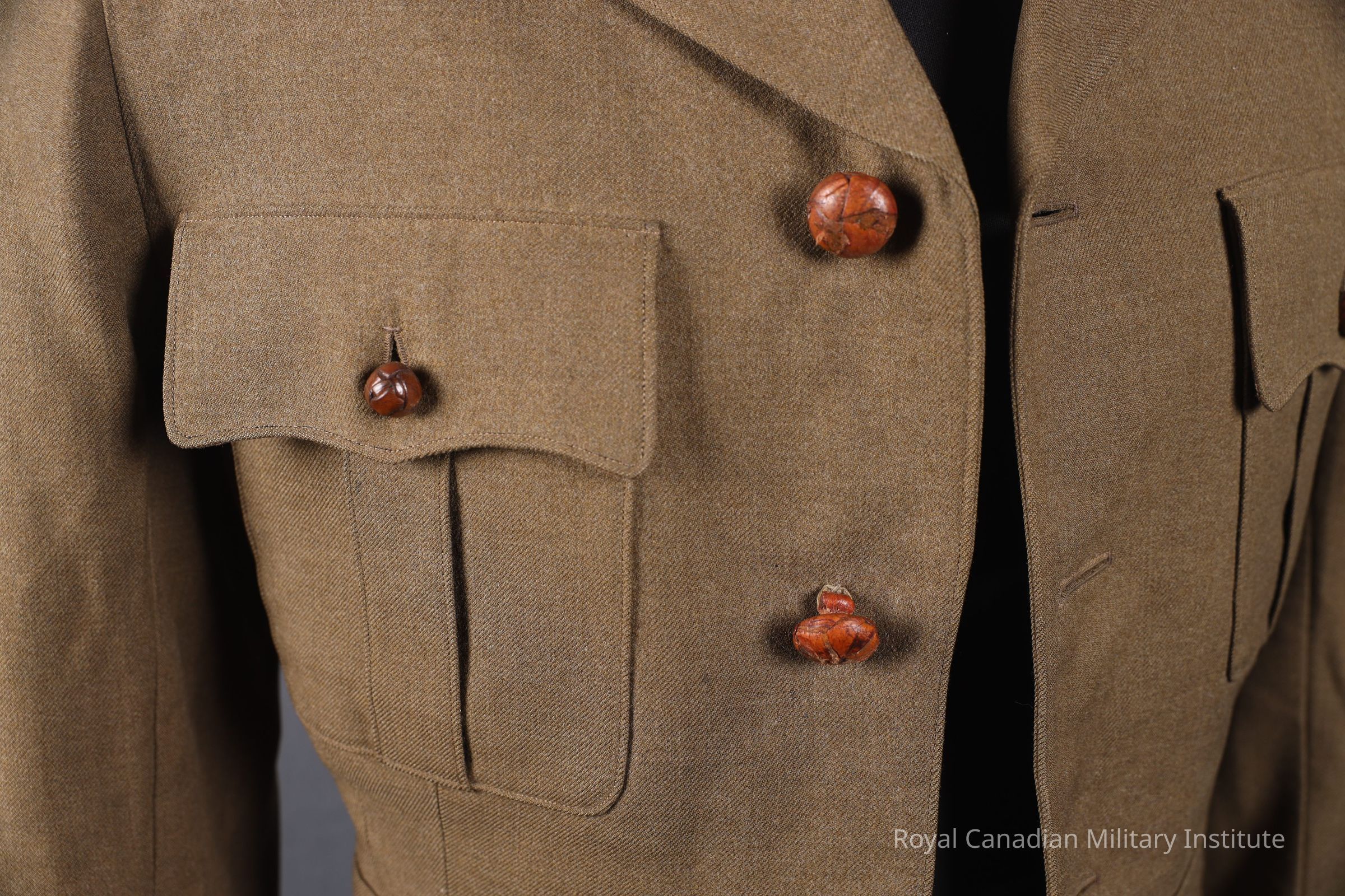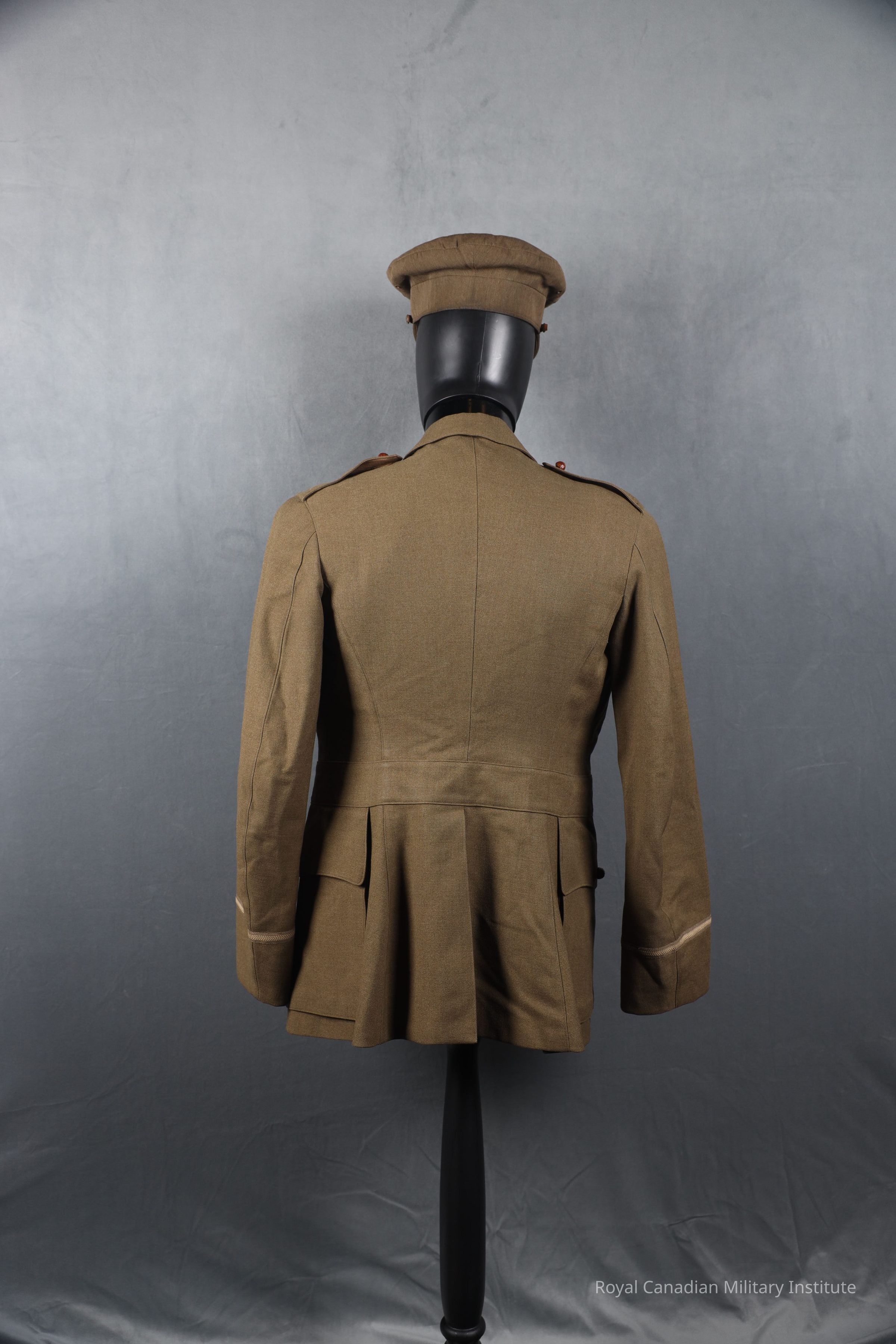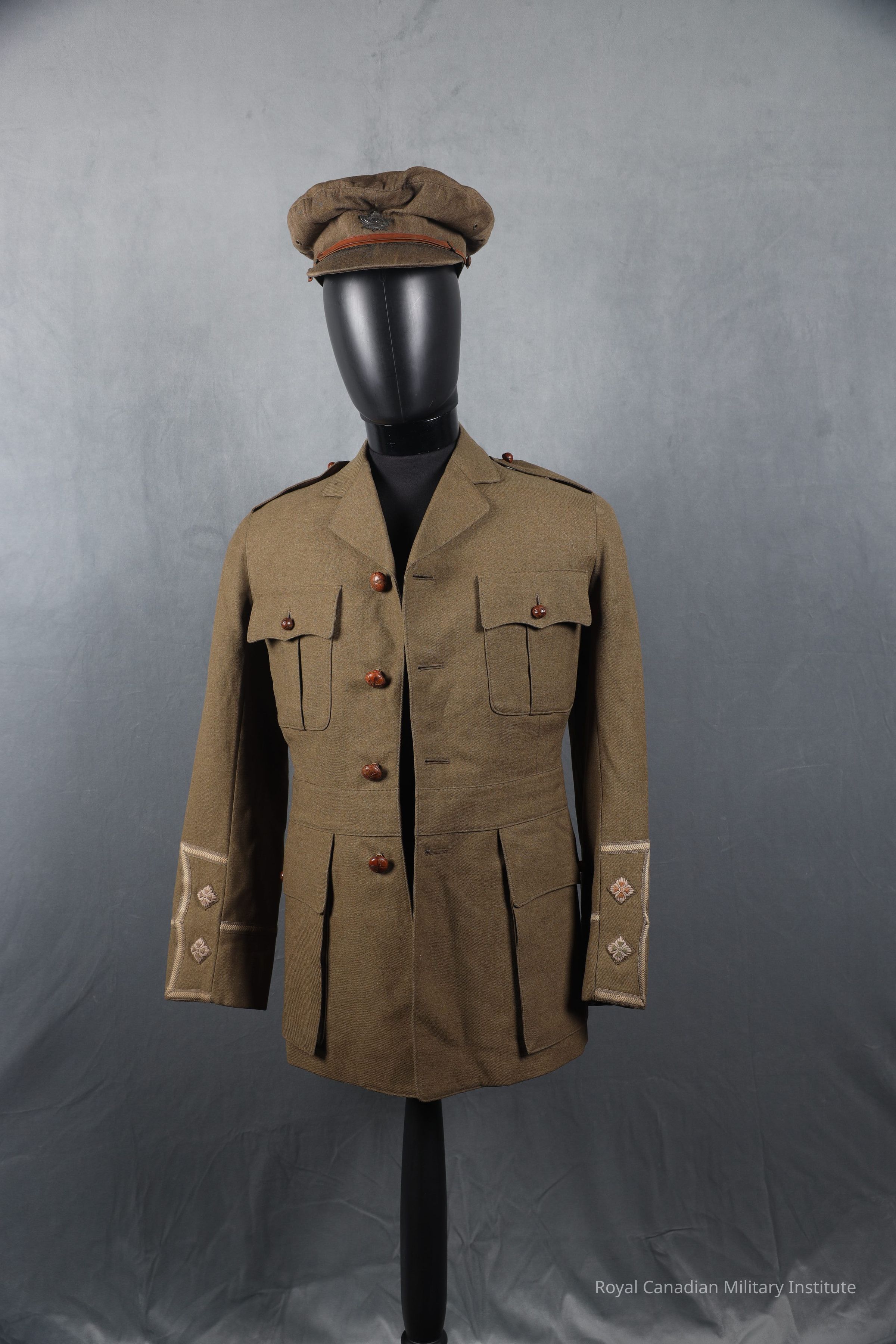 1916 Canadian Expeditionary Forces 118th (North Waterloo) Infantry Battalion Lieutenant's jacket made of green khaki twill wool. Single breasted with four brown football leather buttons (2.5 cm). Shoulder epaulettes are missing the lieutenants pips and are closed with a brown football leather button (1.5 cm). Two breast scallop pockets closed with a brown football leather button (1.5 cm). One watch fob pocket in the waist on the right side. There are two larger waist scalloped pocket also closed with a brown football leather button (1.5 cm). The sleeves decorated with a green and beige gauntlet cuff with a lieutenant's pips. Lined with a green khaki twill cotton or silk. The sleeves are lined with a striped cotton or silk. On the right inner lining of the jacket is a slash pocket.Context