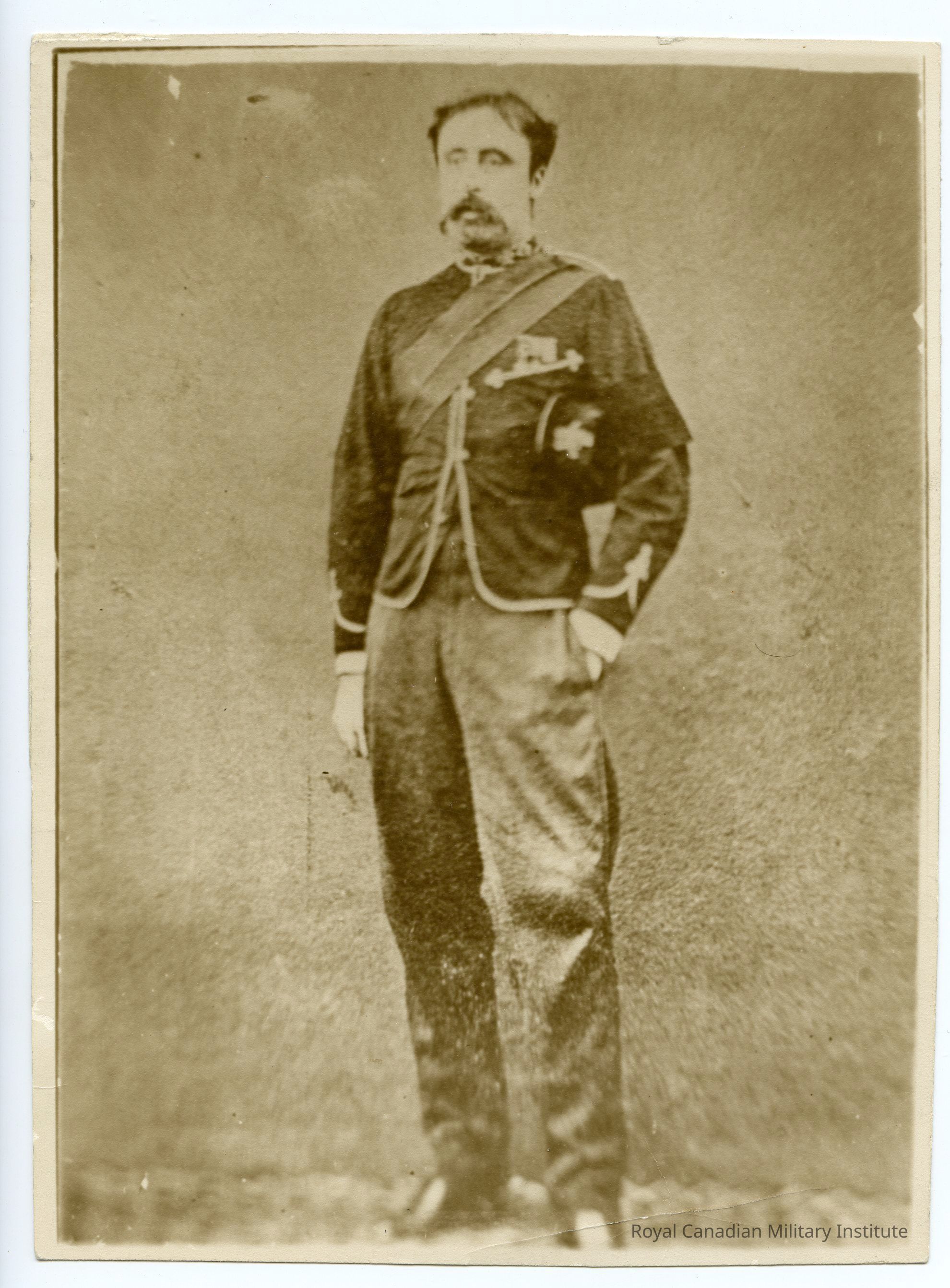 6 1/4 x 8 1/2 black/white photograph "Colonel Alexander Roberts Dunn, V.C., 1868." Detail shows Dunn standing bareheaded, carrying a forage cap. He wears Wellington boots, blue overall trousers, red undress jacket with blue cuffs. Red Officers sash from left shoulder to right waist.Context