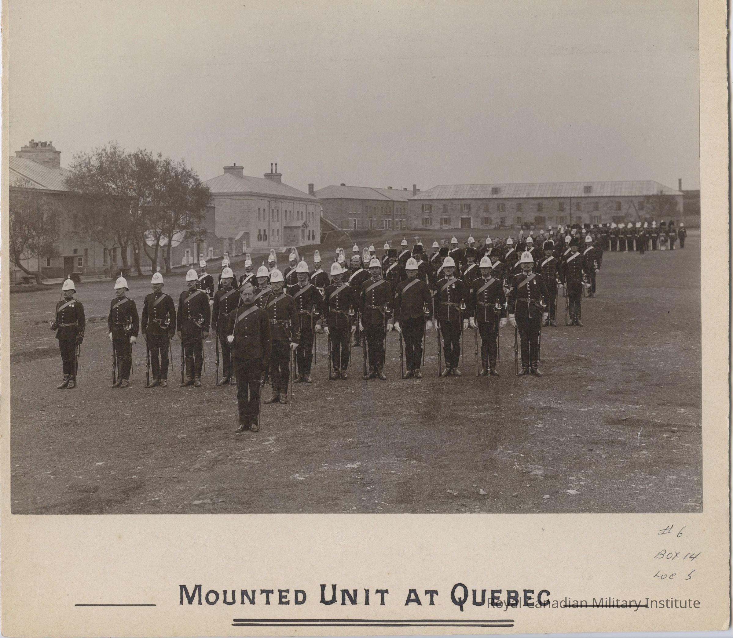 6 1/2 X 8 1/4 inch sepia-toned black/white photograph "Mounted Unit at Quebec (June 1897). Detail shows at least 100 Cavalry men, Non-commissioned Officers, Officers drawn up in at least 7 ranks. Brick barracks buildings in background, left and centre.