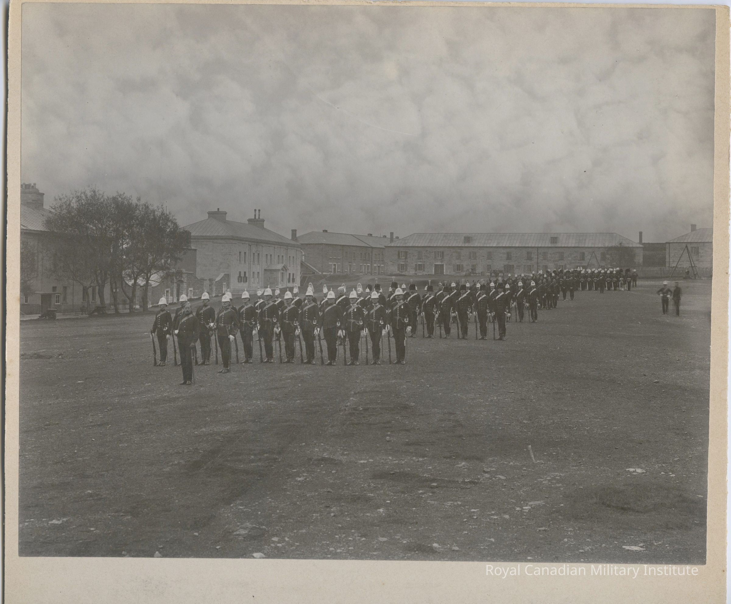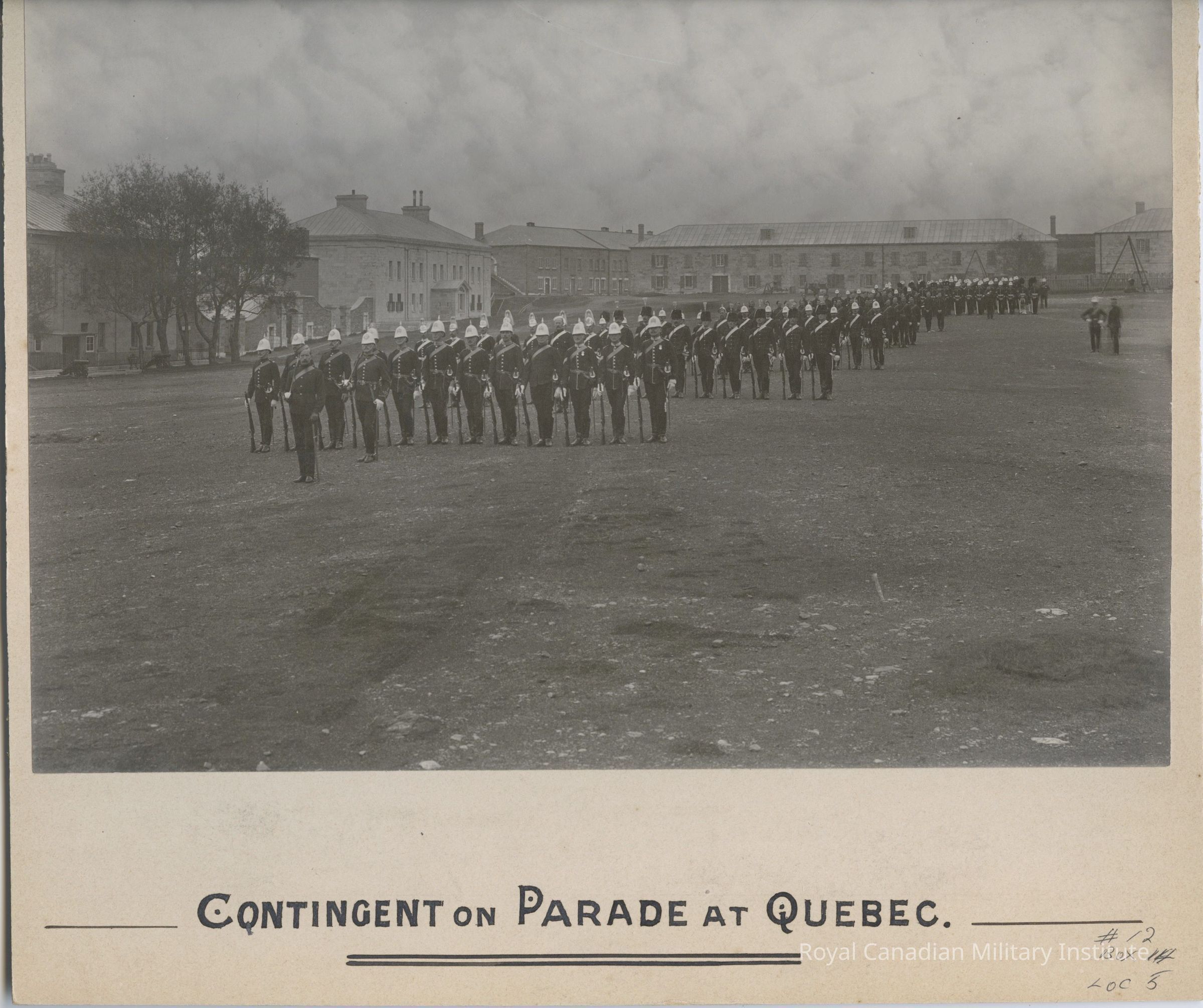 7 1/4 X 9 1/4 inch sepia-toned black/white photograph "Contingent on parade at Quebec (June 1897)." Detail shows at least 150 men, Non-commissioned Officers, Officers in 10 ranks open order standing to attention in Quebec Citadel Parade ground.