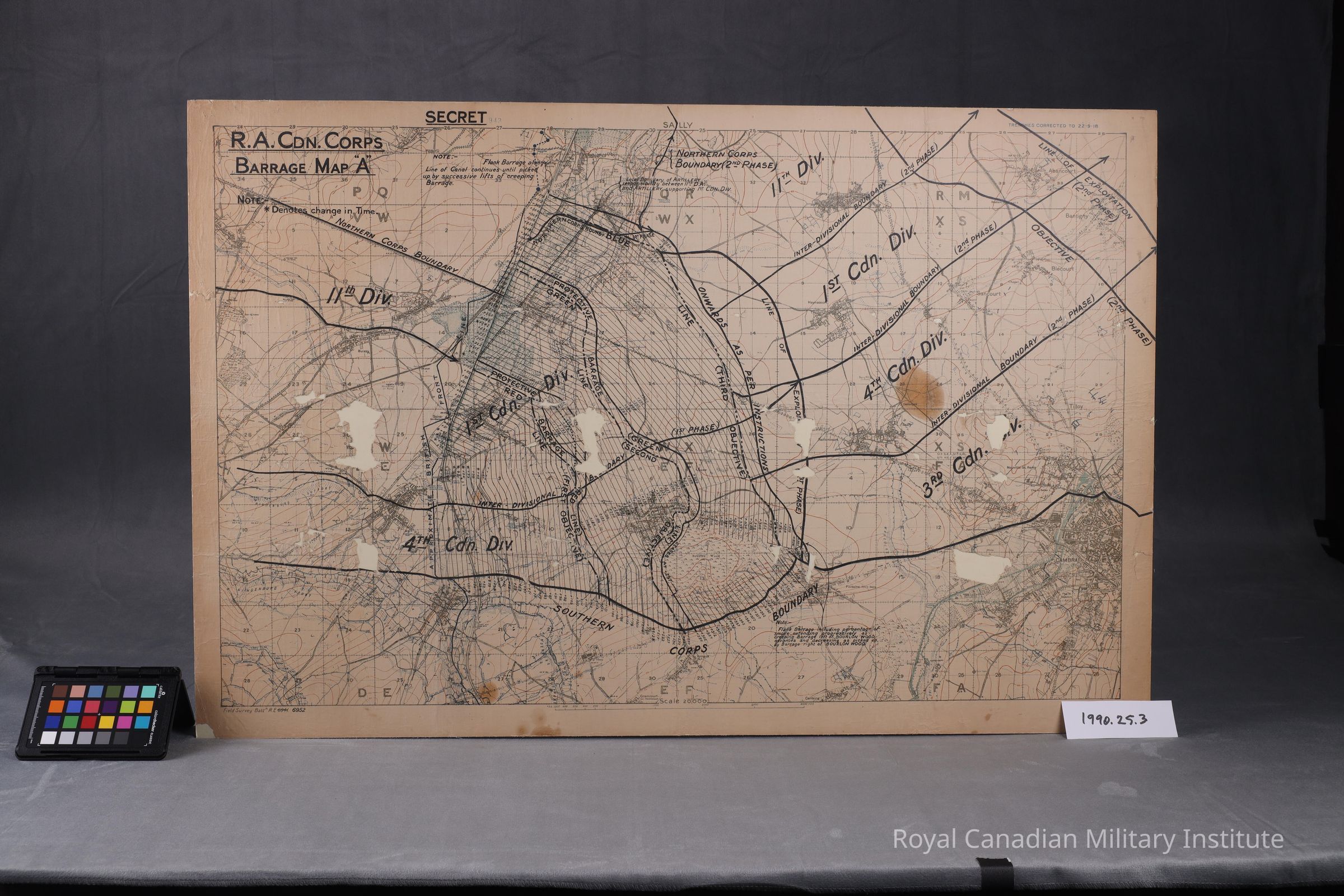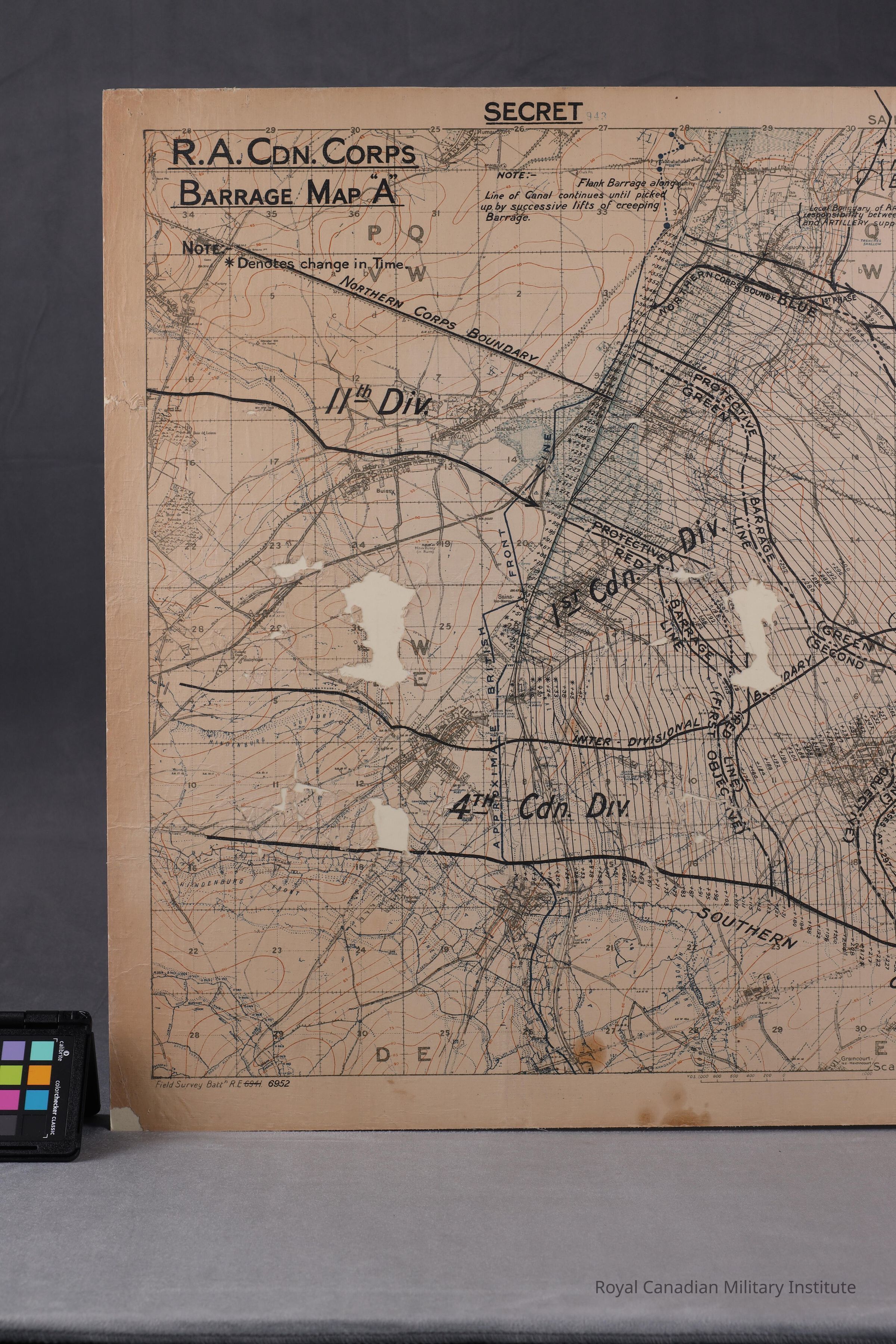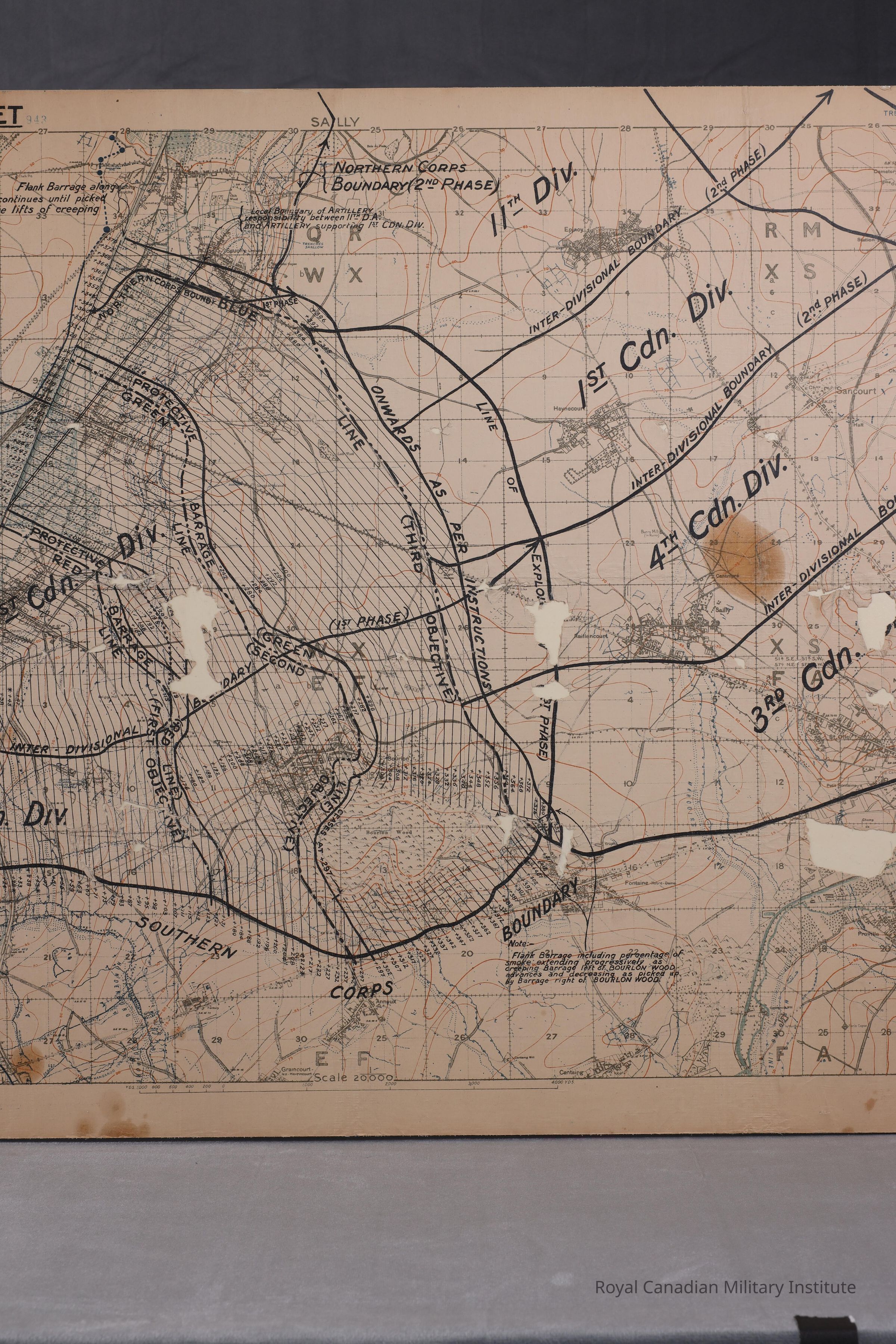 Barrage map shows features of city, road, canal outlines, trench and barbed wire lines, natural features, with map grid squares, marking Divisional/Corps frontage/barrage lines for 1-3-4 Canadian Divisions and 11th British Division, scale of 1: 20,000. An original, used-marked war map.Made/Created