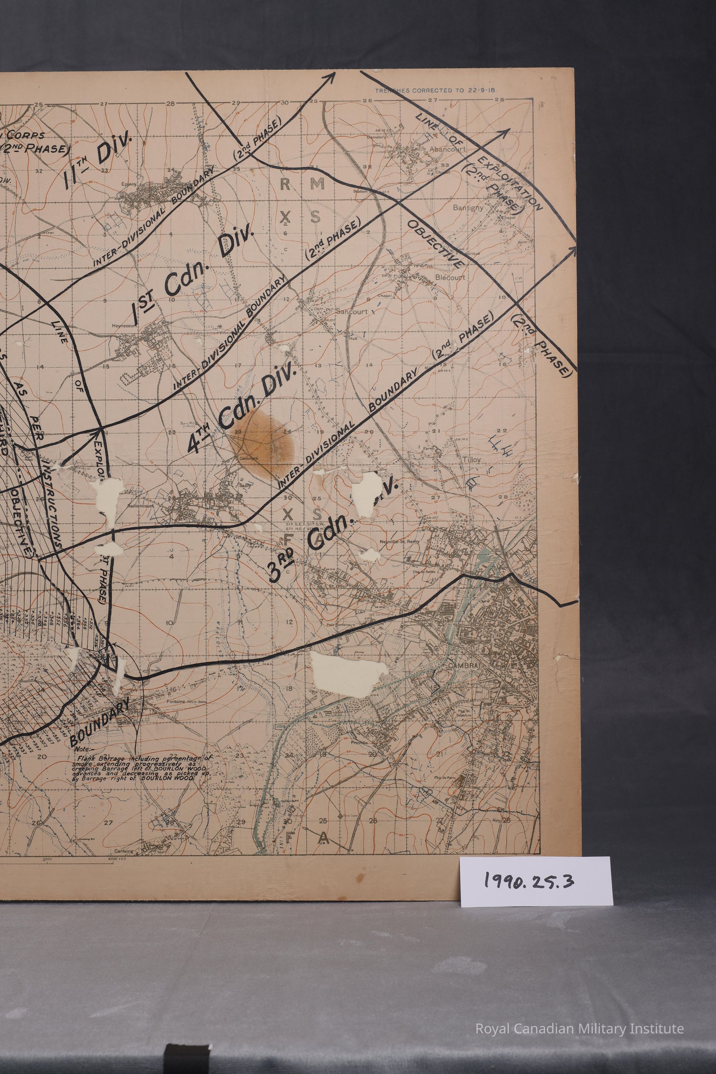 Map produced in the field at Sailly, France, by Royal Engineers, for Canadian Corps operations at Bourlon Wood, 22-9-1918.Context