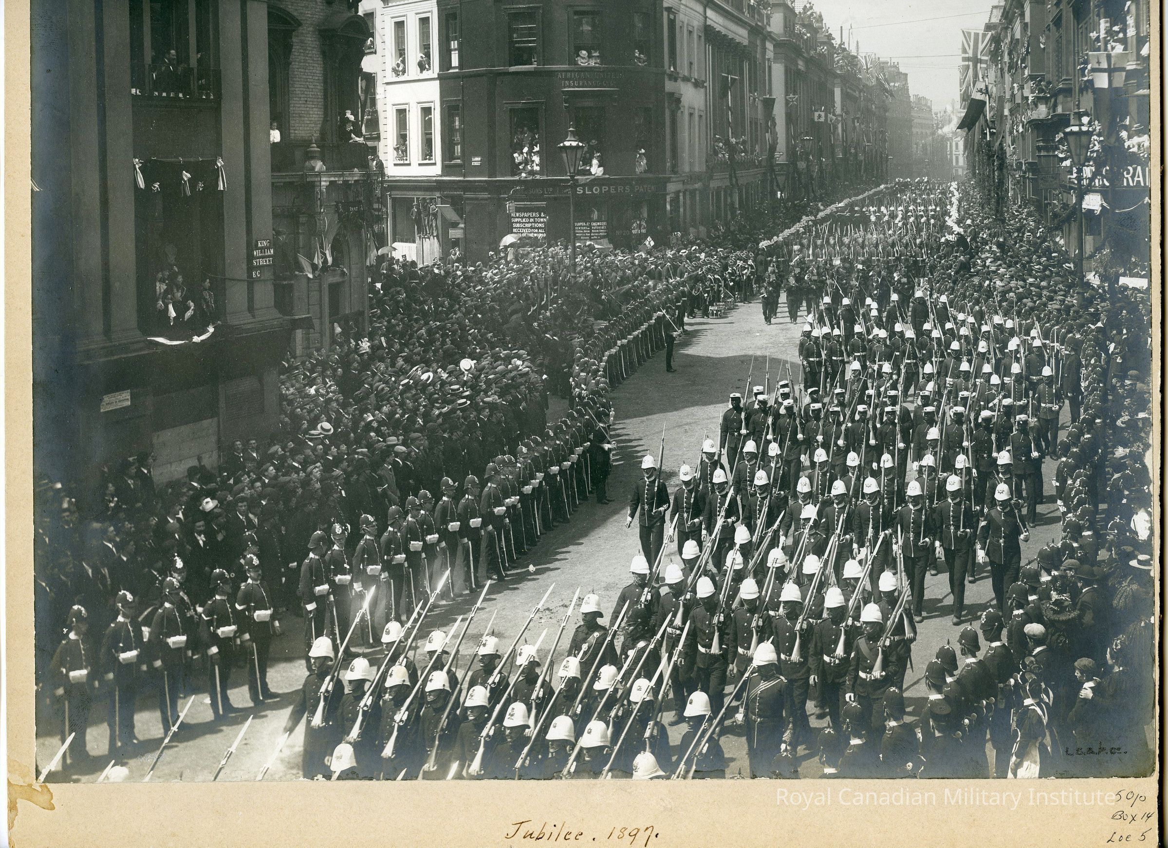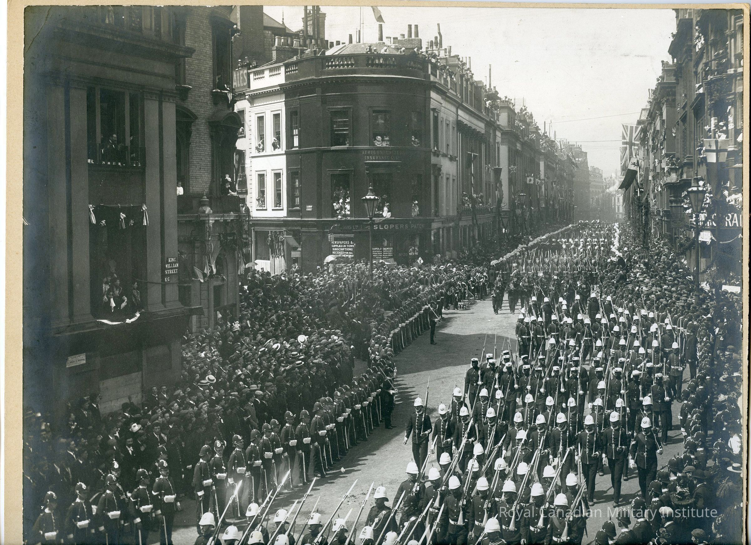 10 X 11.5 inch black/white photograph "Canadian and Colonial soldiers marching in column of route, Queen Victoria's Jubilee, King William Street, London, England, June 1897." Detail shows storefronts (insurance, general supplier, etc.)