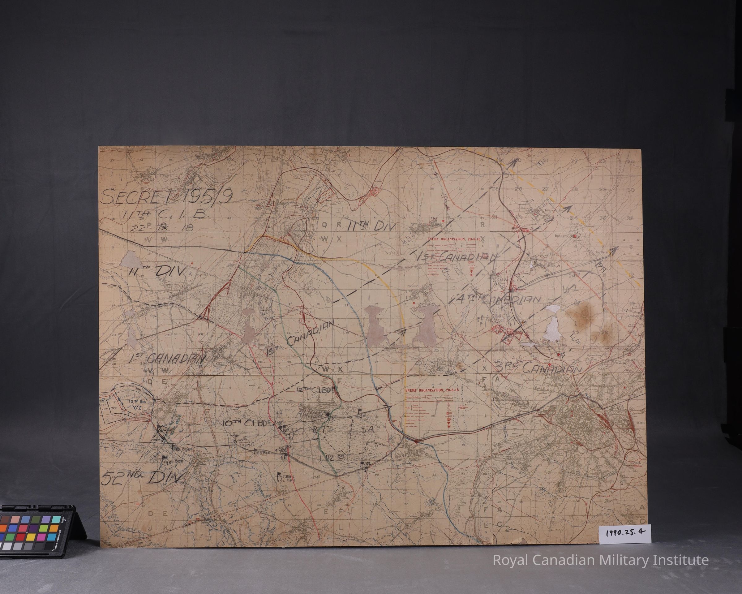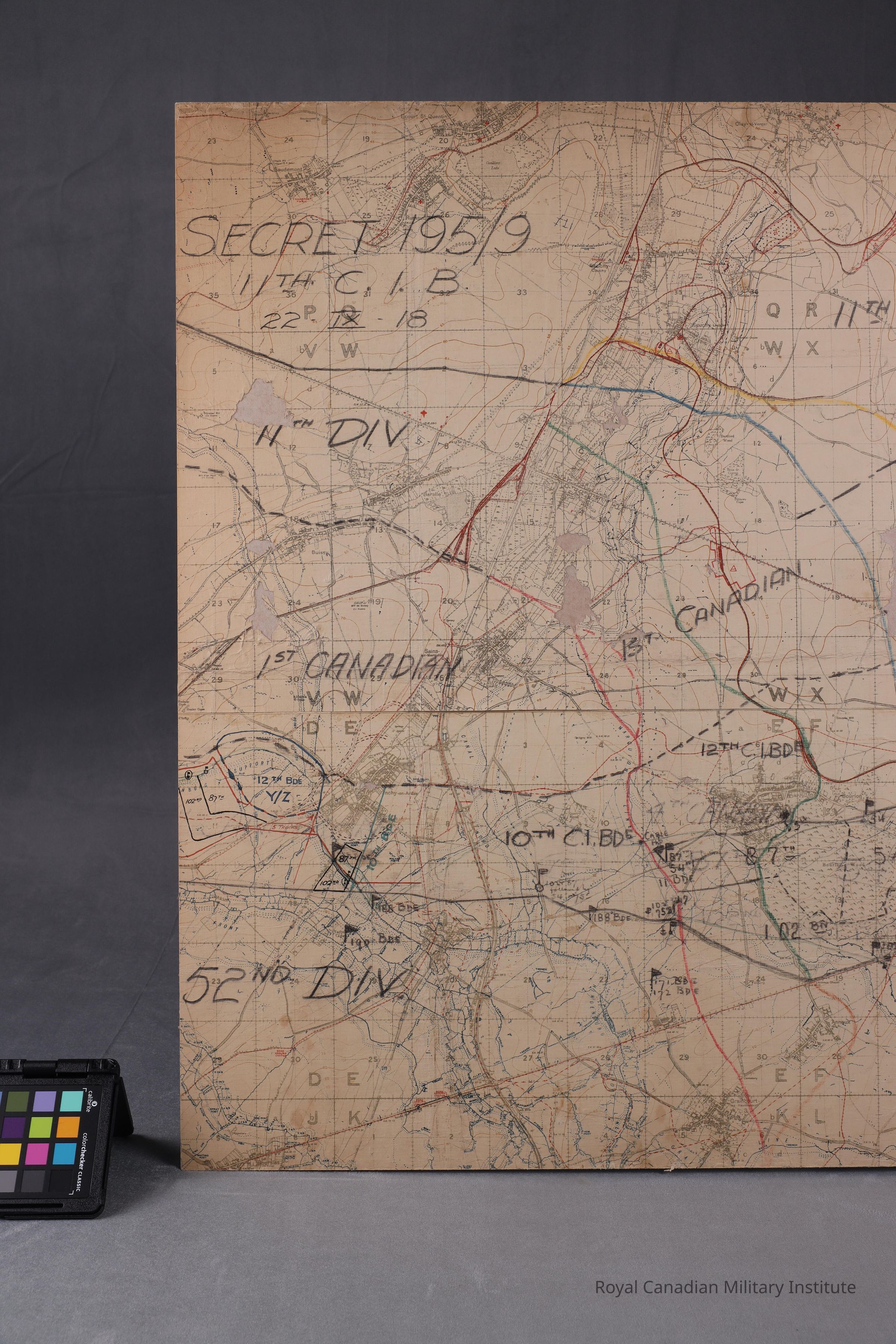 Map used by 11th C.I.B. (54/75/87/102 Battalions) to mark planned advances of British 11th Division, Canadian 3rd/4th Divisions: demarcations in red, green, blue, yellow, black crayon: this is example of a used, marked battle map.Made/Created