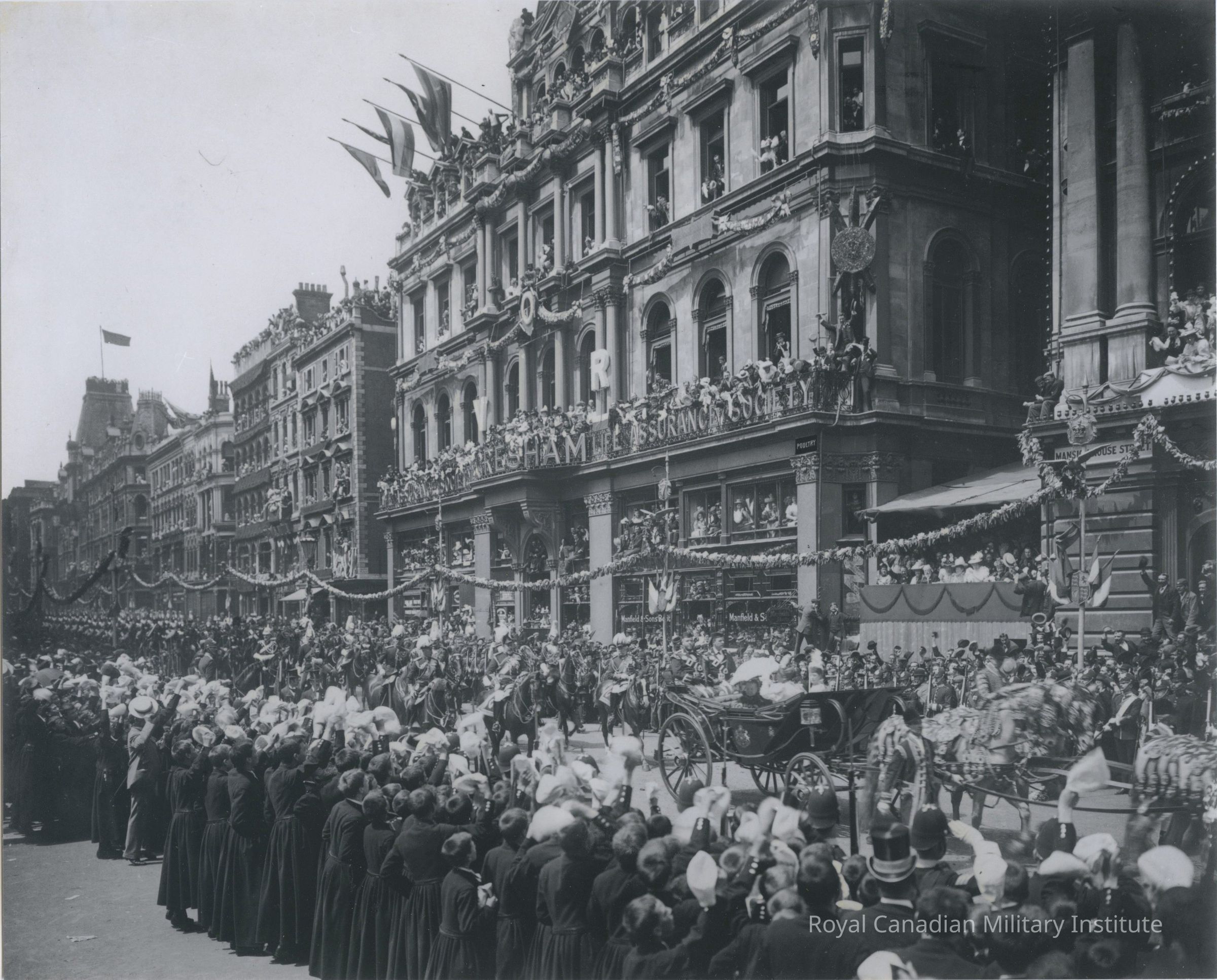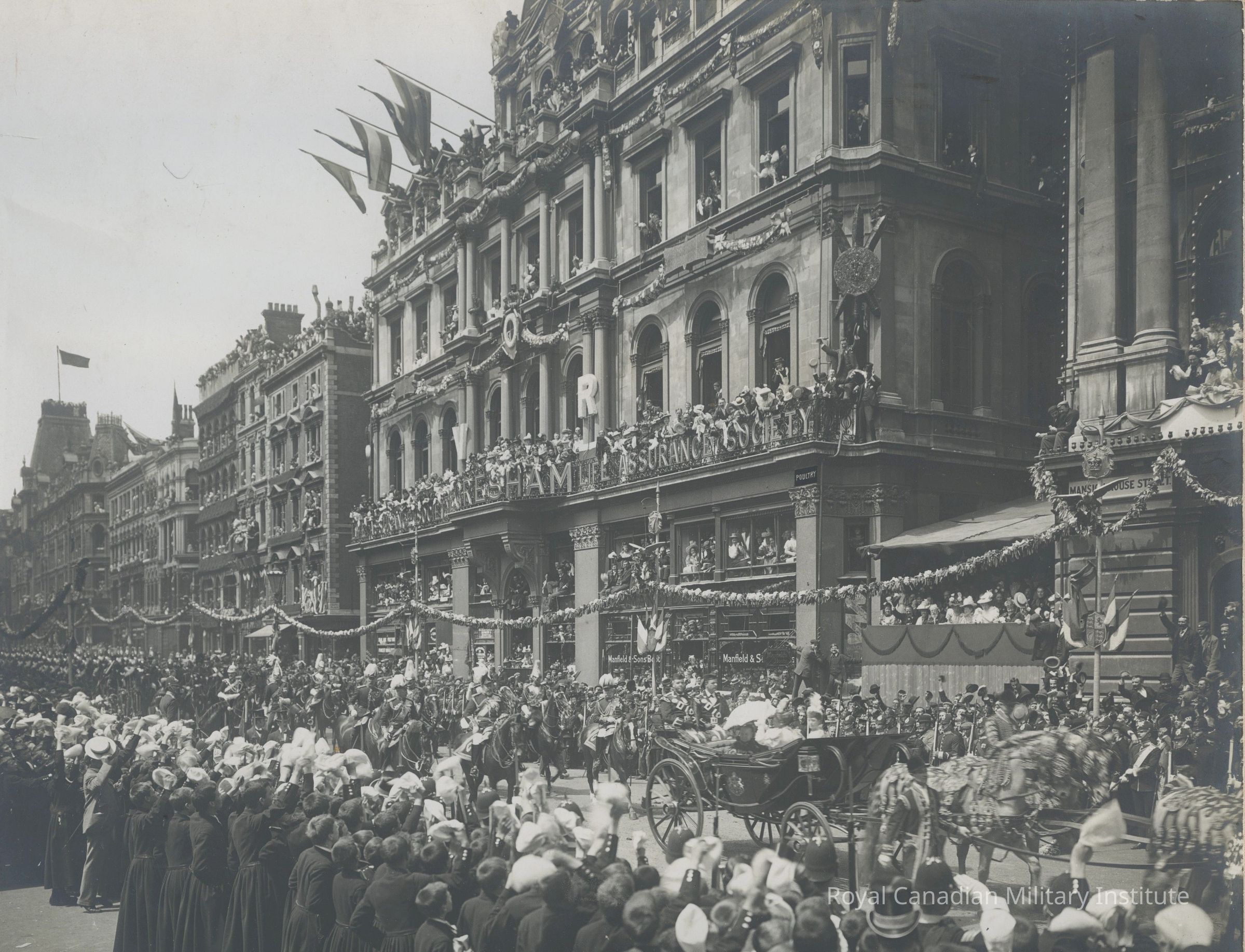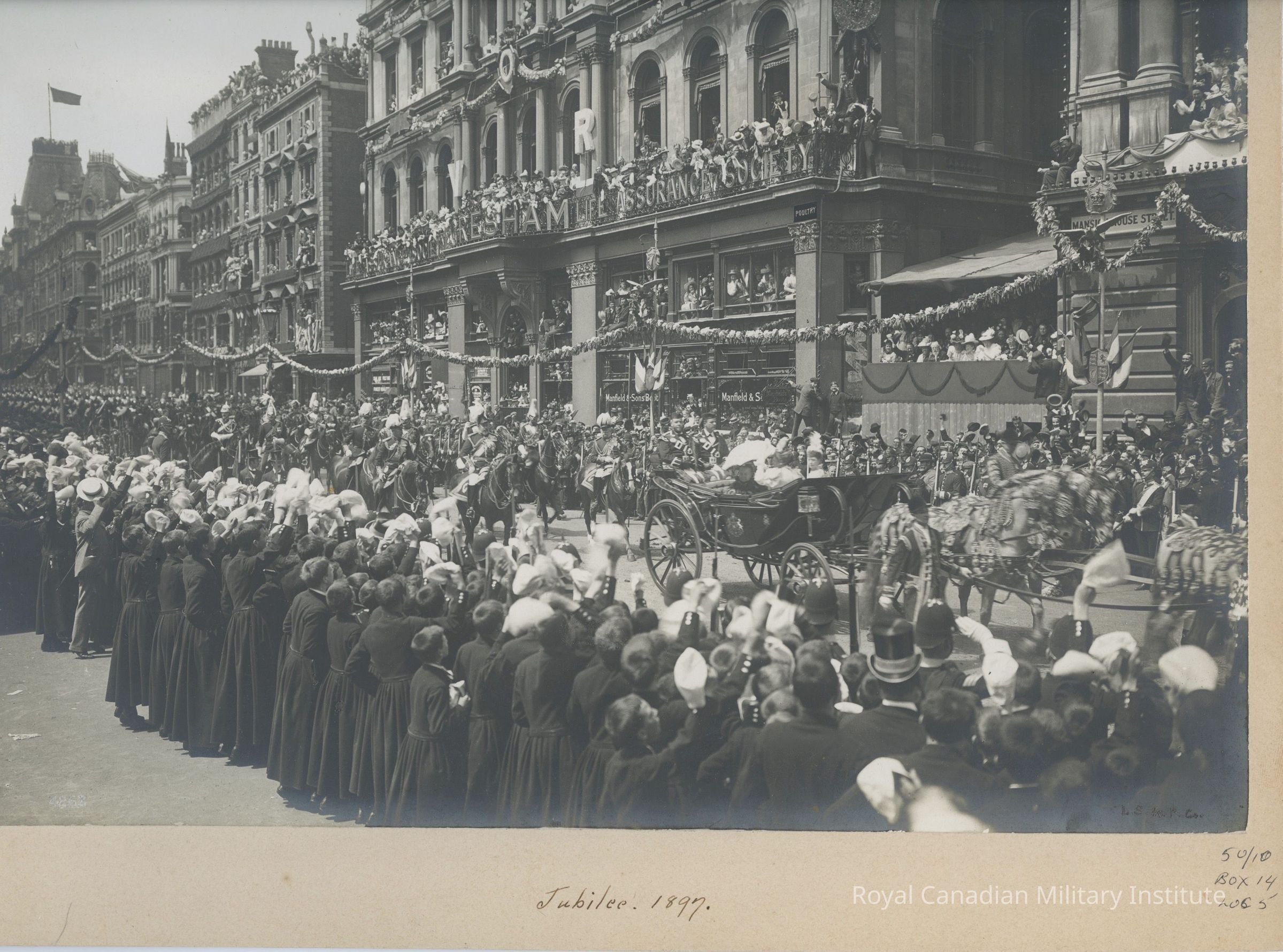 9 1/4 X 11 1/4 inch black/white photograph "Jubilee 1897." Detail shows Queen Victoria under white umbrella in horse-drawn landau moving through London Street. Buildings "Mansion House", "Moresham Life Assurance Society."