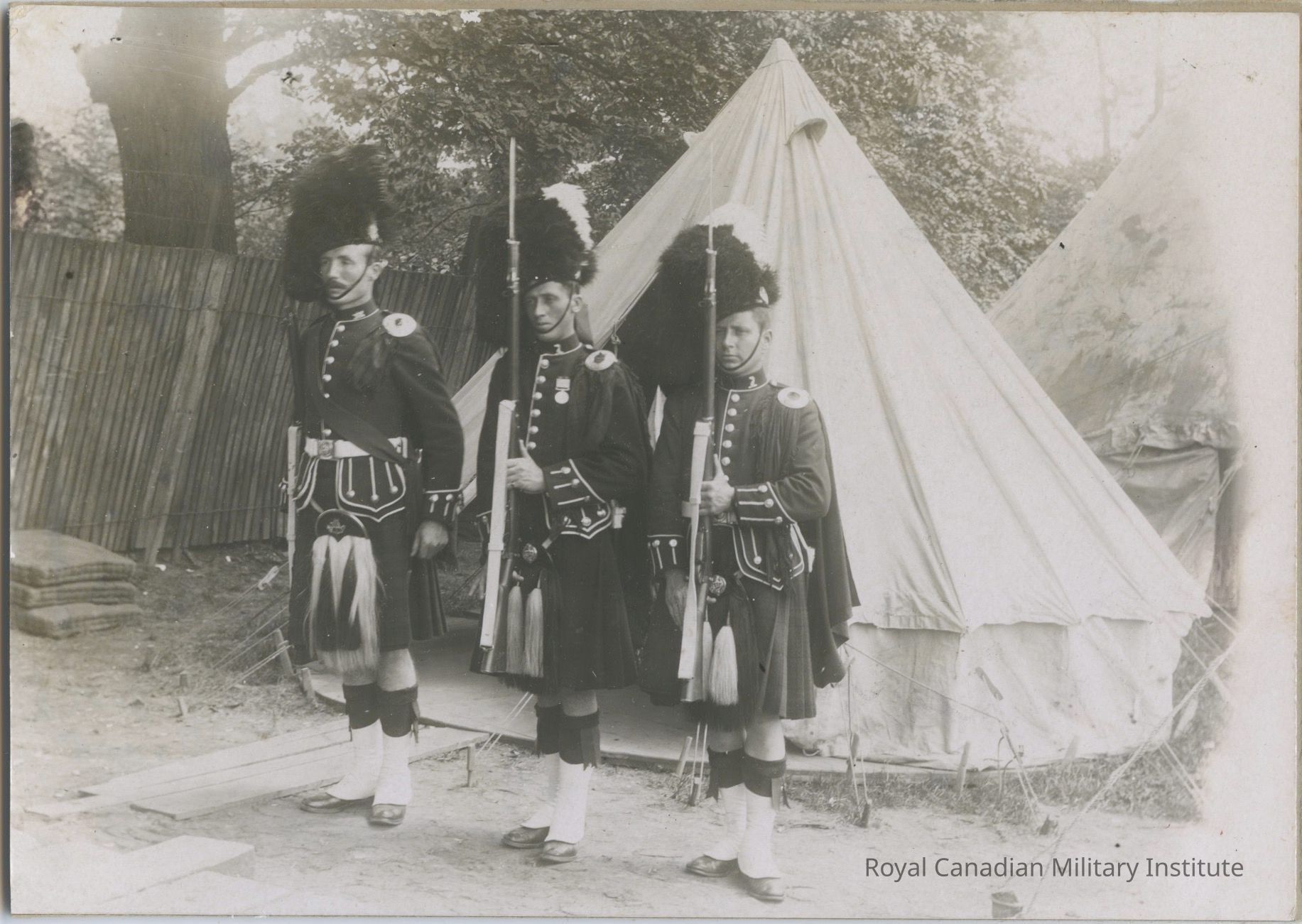 All wear shoulder plaid, plaid badge, white buff leather pattern 1888 waistbelts. Centre soldier wears 1899-1901 South Africa War Medal. Two soldiers present arms, third shoulder arms. Two canvas bell tents in backgroundDimensions
