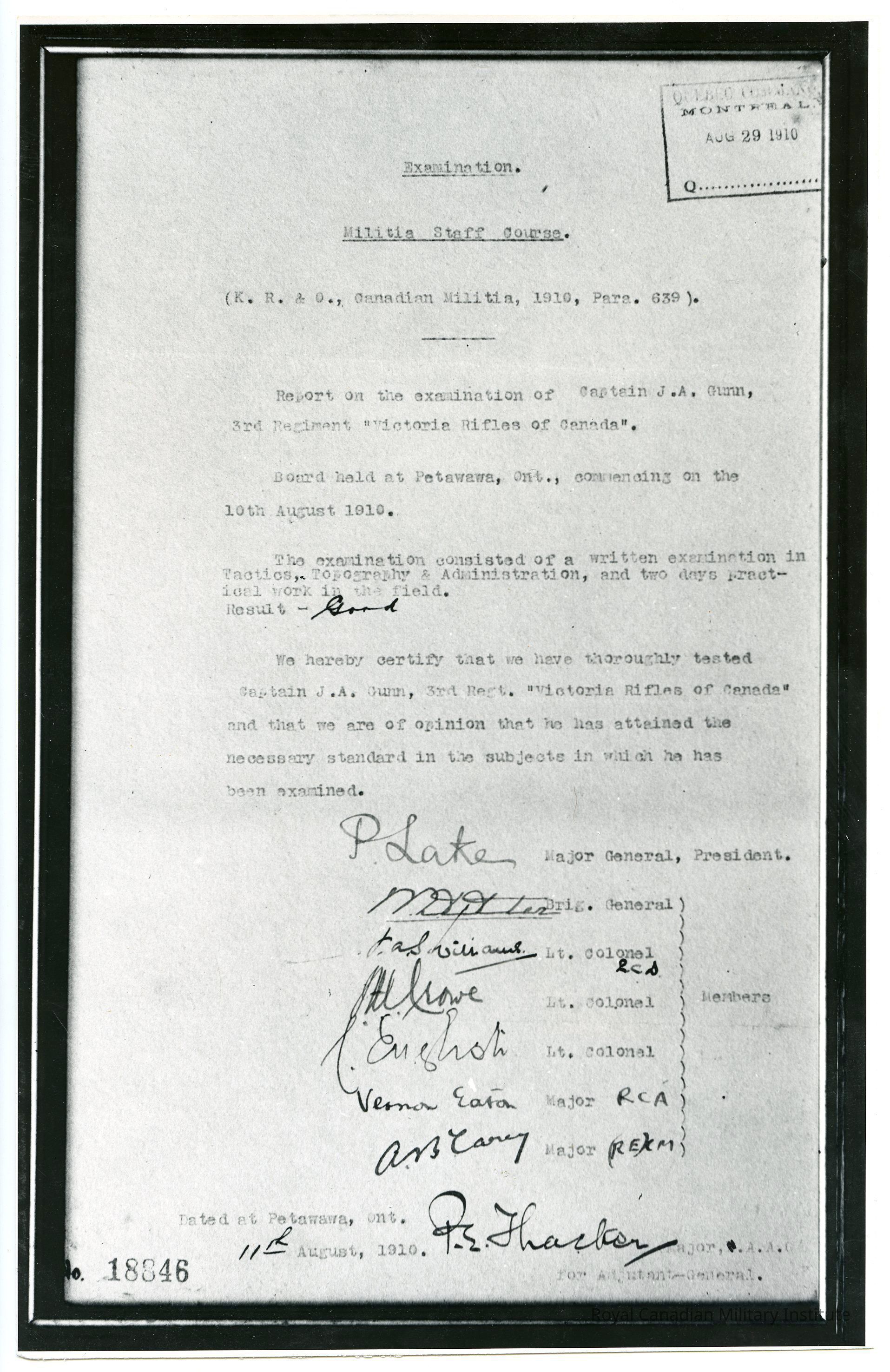 Photograph "Militia Staff Course Exam Results Captain J.A. Gunn, 29th August 1910."Entry/Object ID
