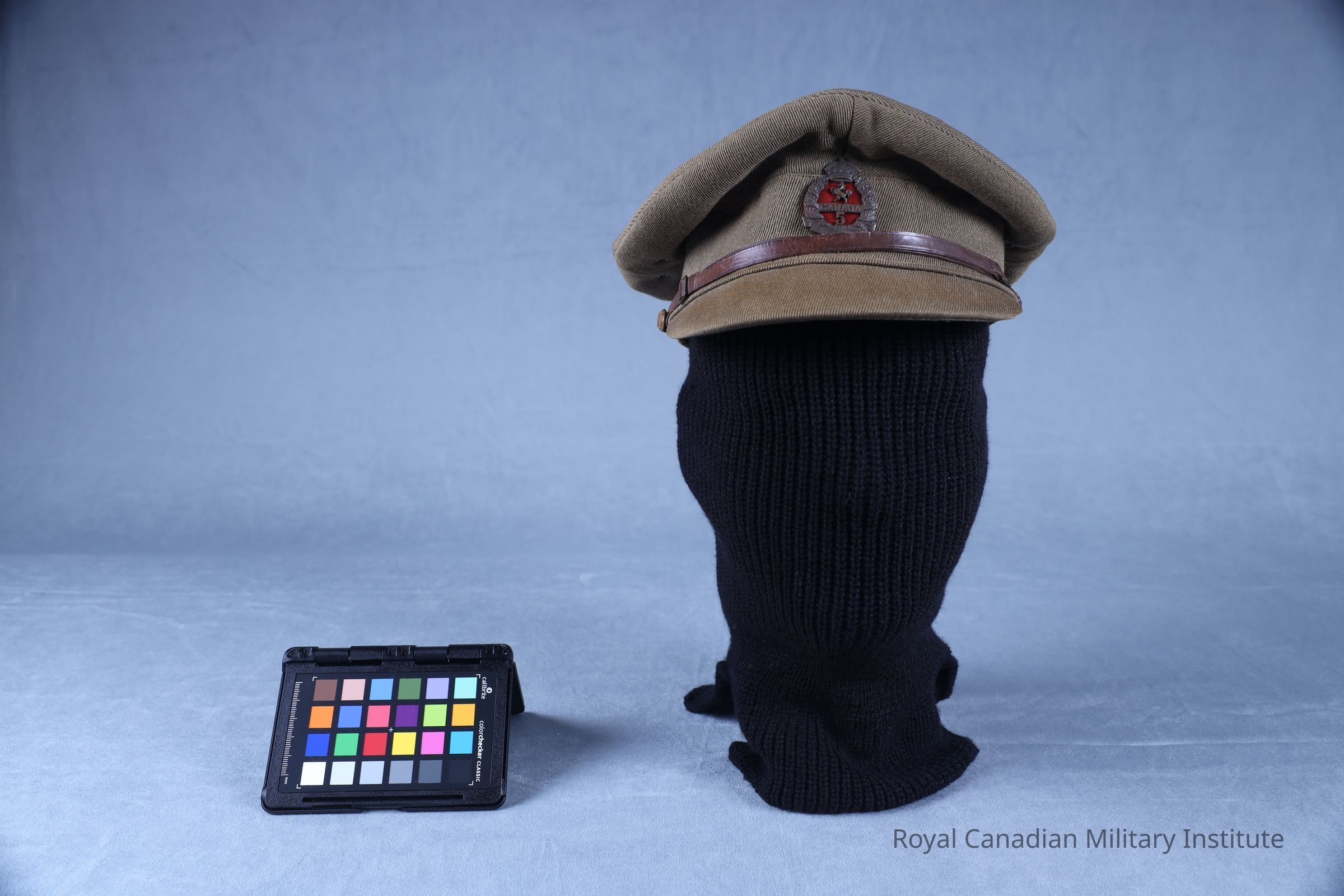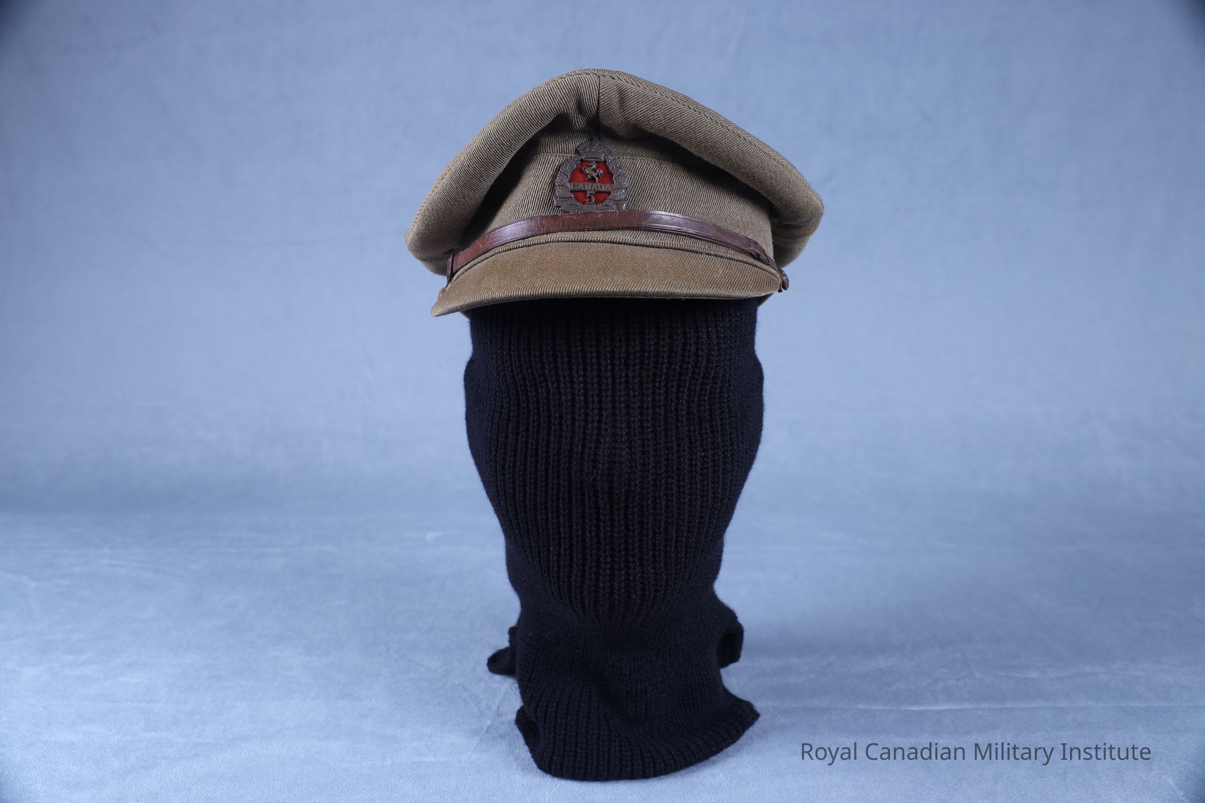 1918-1919 5th Battalion Western Cavalry officer's cap. The officer's cap is made from a khaki green wool twill. On the sides are two khaki-painted metal grommets. The top of the cap is flattened and has a stiffened front peak. The leather chinstrap (27 cm long x 1 cm wide) is made adjustable with two brass buckles and secured with two brass British Royal coat of arms buttons (1.1 cm diameter). The cap badge denotes the 5th Battalion Western Cavalry. The badge is made from darkened copper with the King's crown on top of a wreath with a red felt backing. Over the red backing is a rampant horse, "CANADA", and a "5".