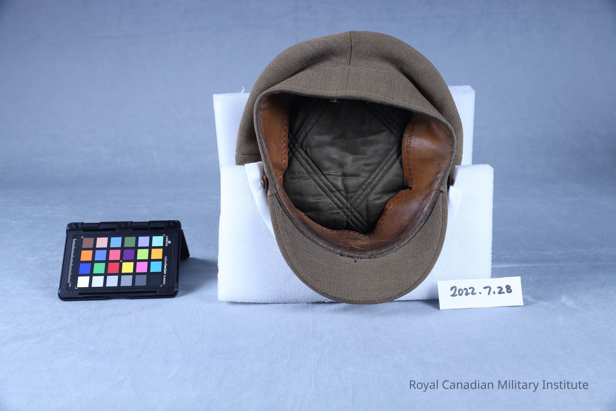 The interior of the cap has a leather sweatband with a silk ribbon strap. The crown and body are lined with a quilted dark green cotton or linen material. The crown has a liner stiffener of semi-soft rolled cotton.Context