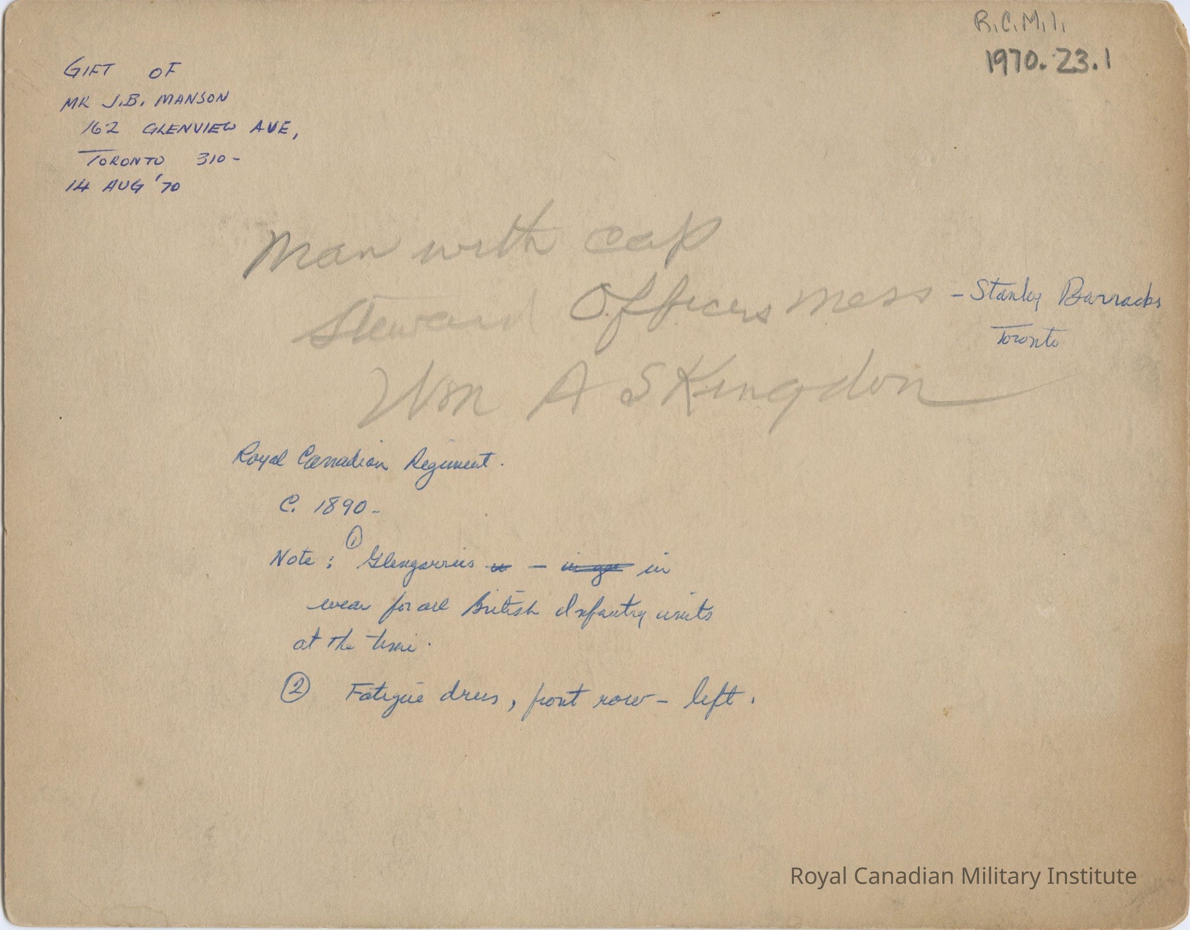Photograph "Royal Canadian Regiment fatigue dress, Toronto, 1890."Entry/Object ID