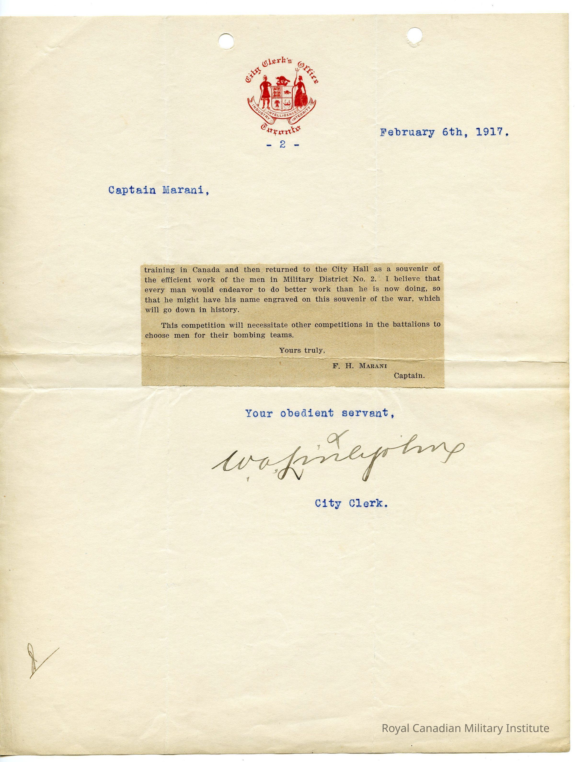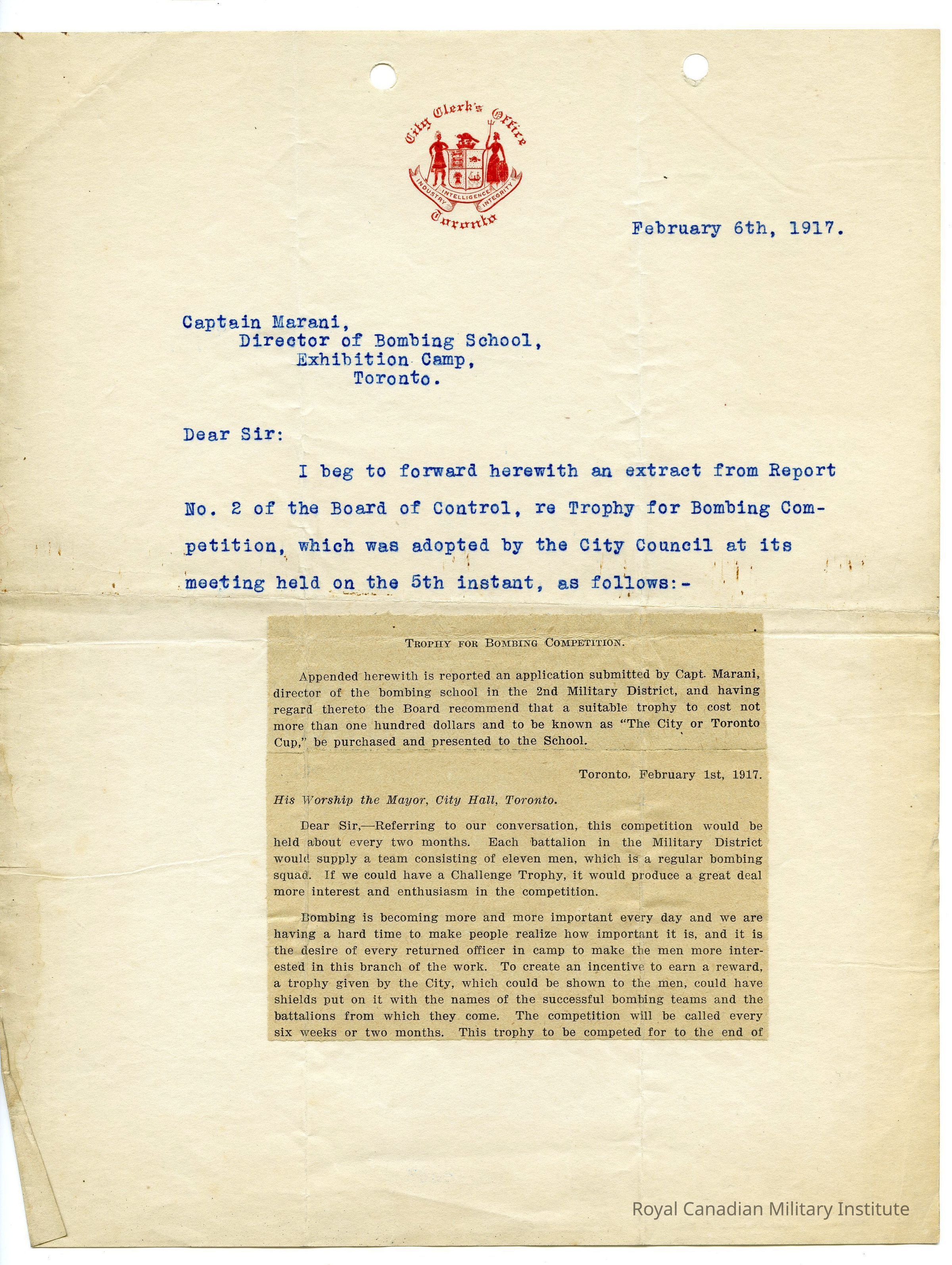 1917 Toronto City Clerk Letter to Military District No.2 Bombing School.