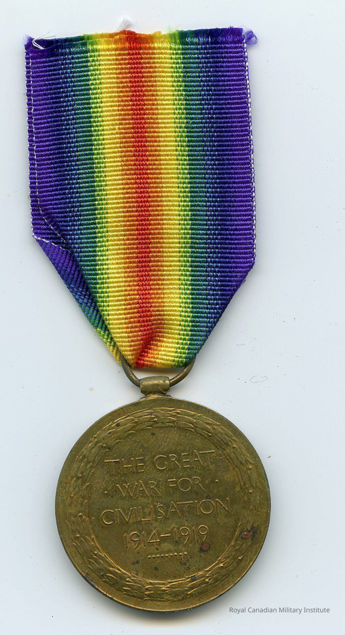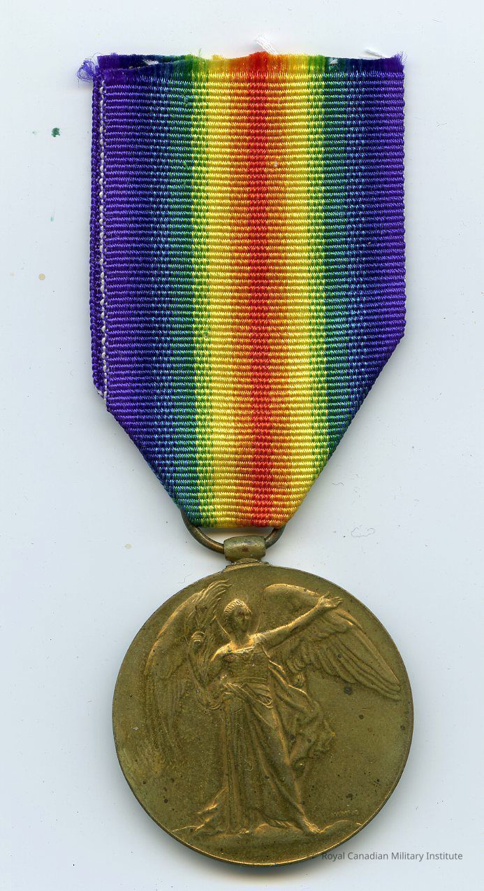 1914-1919 Allied Victory Medal 420771. CPL. A.H. Newman .43.CAN.Inf. A circular bronze medal with a rainbow patterned ribbon fastened through a loop at the top of the medal. The ribbon colours are as follows: violet, blue, green, yellow, orange, and red, which are then repeated in the inverse order. The obverse side of the medal depicts the figure of Victory, or often referred to as "Victoria," the Greek and Roman personification of her namesake. The reverse side reads "THE GREAT / WAR FOR / CIVILISATION / 1914-1919."