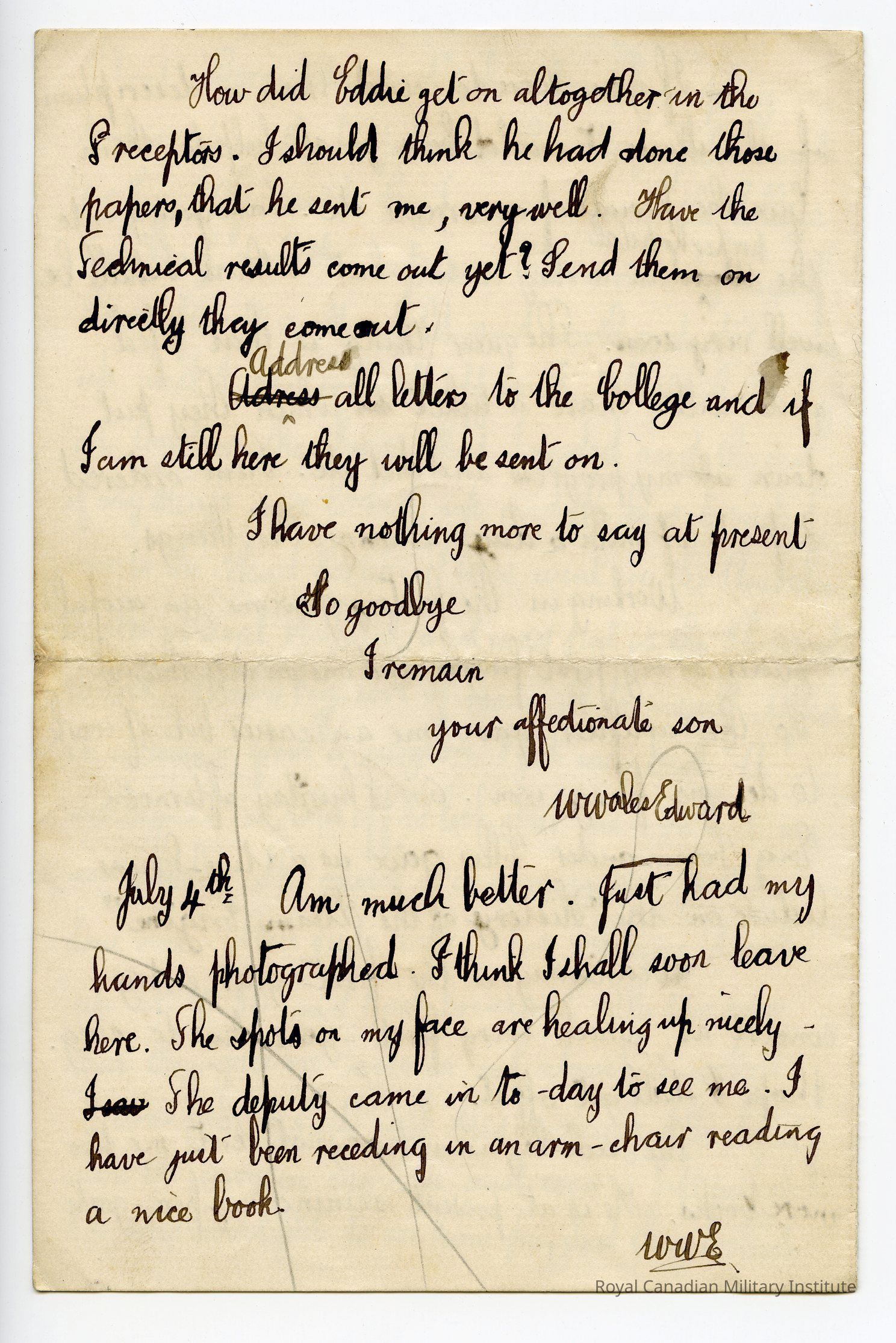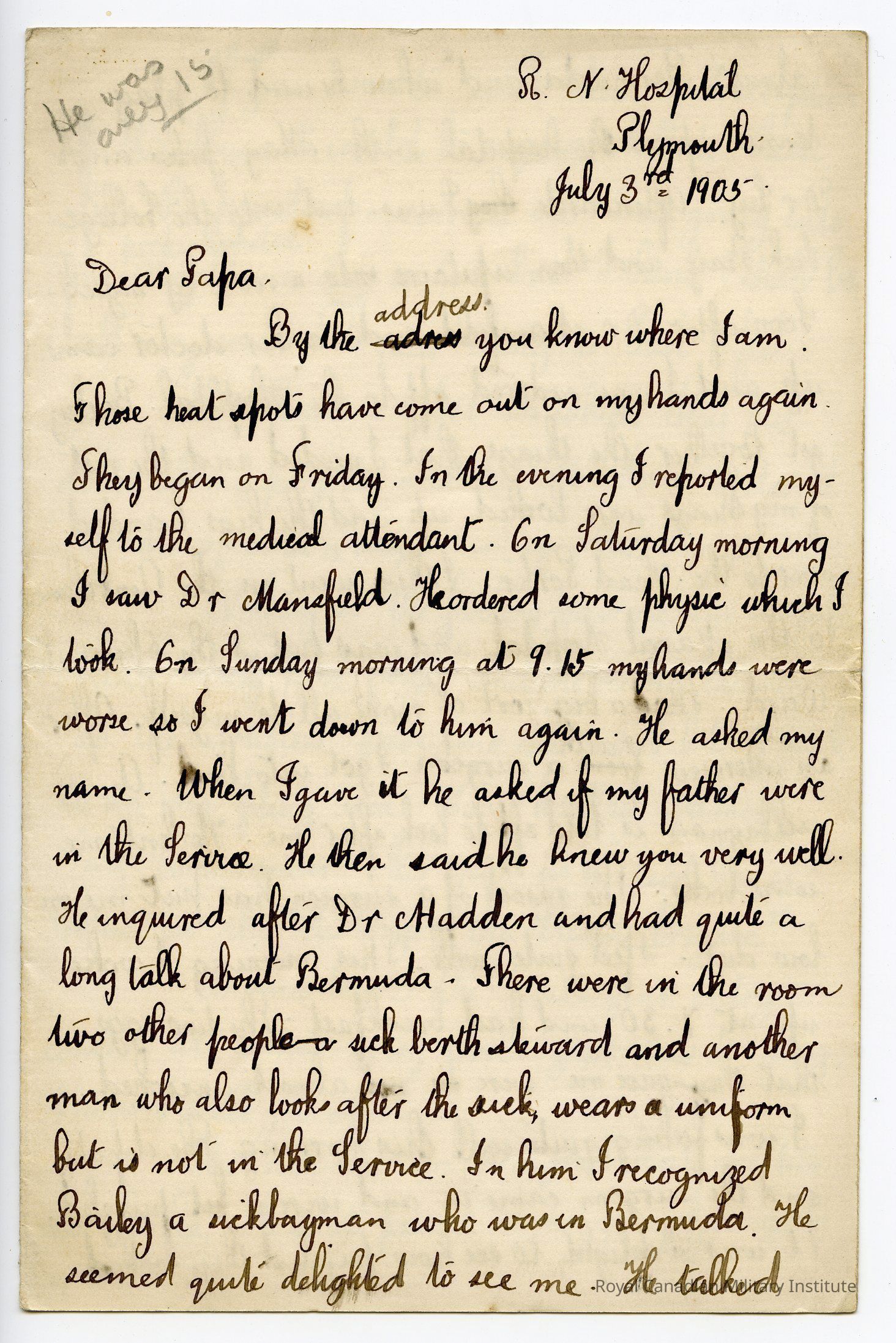 Letter “William Wales Edward RN College Plymouth 03 July 1905”