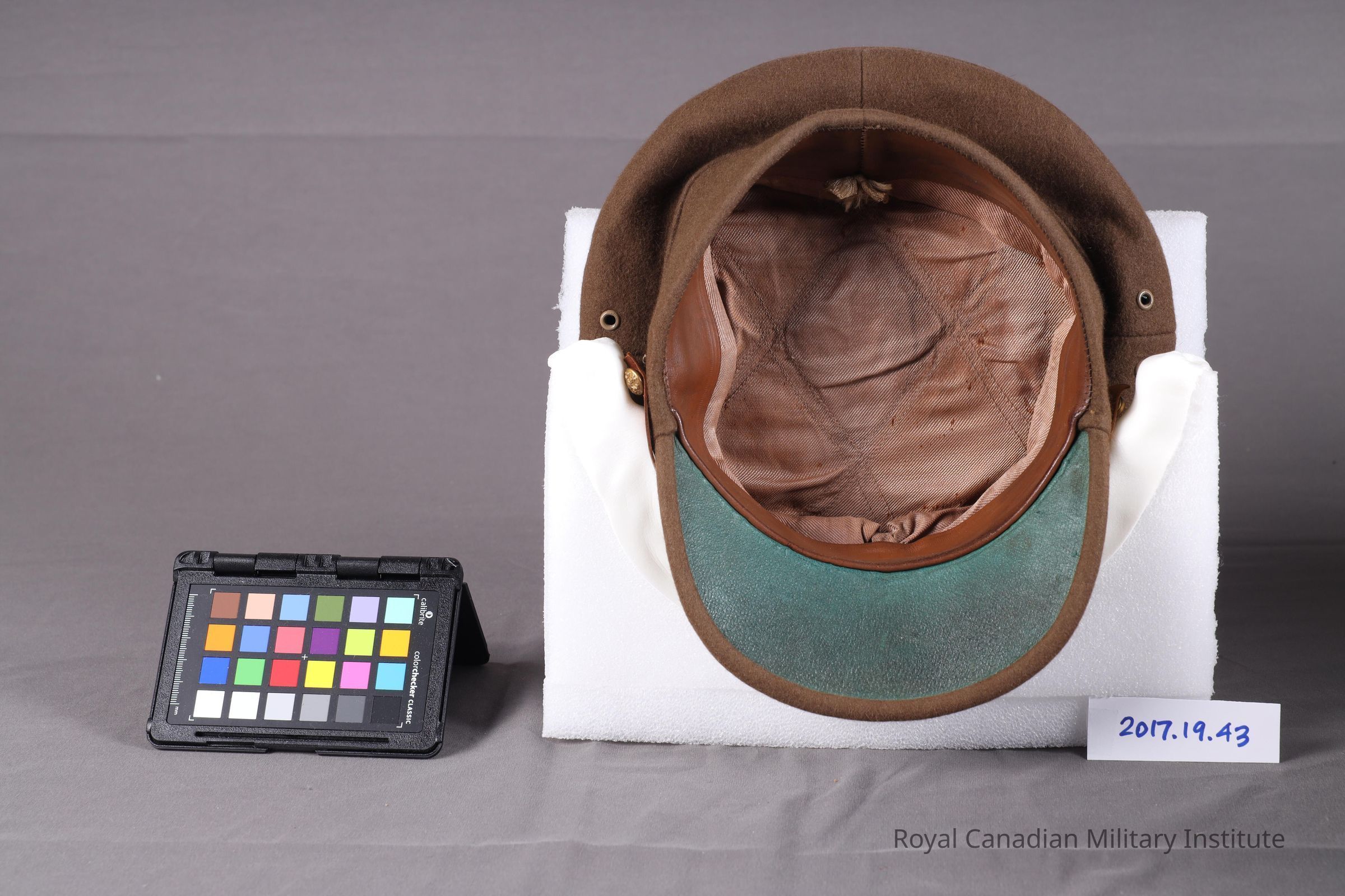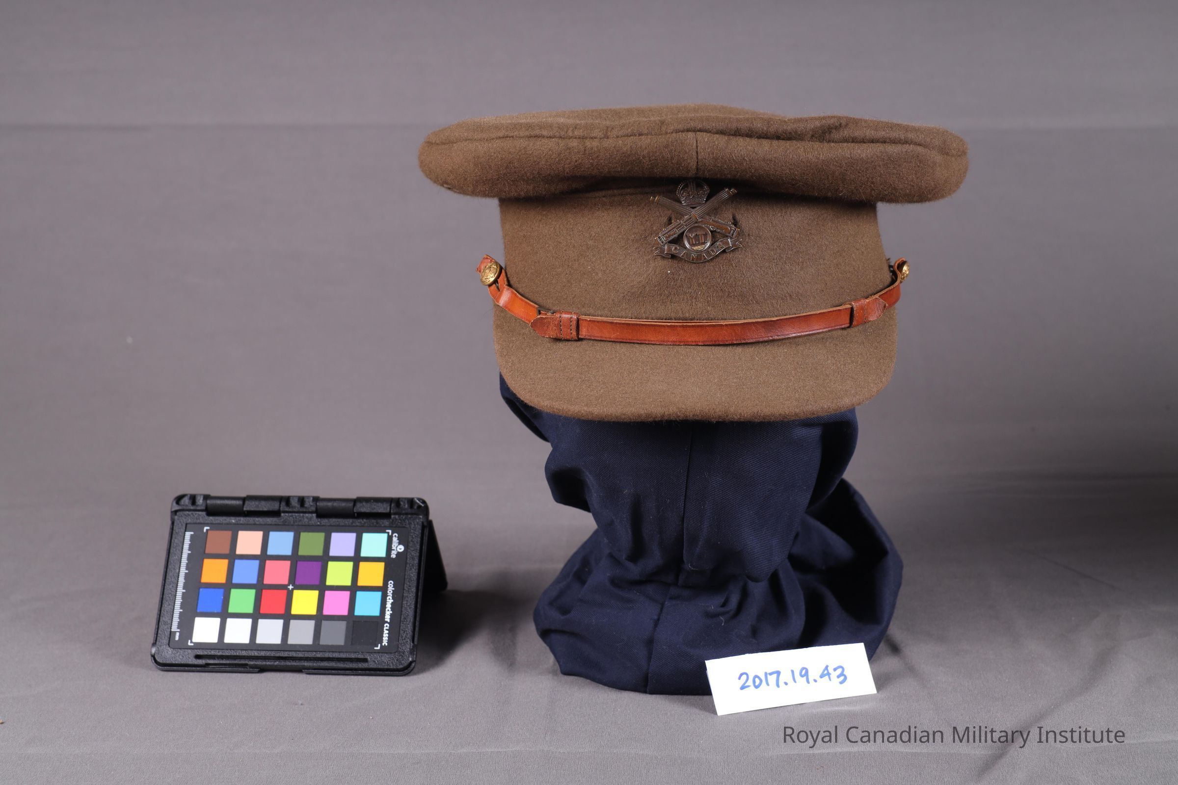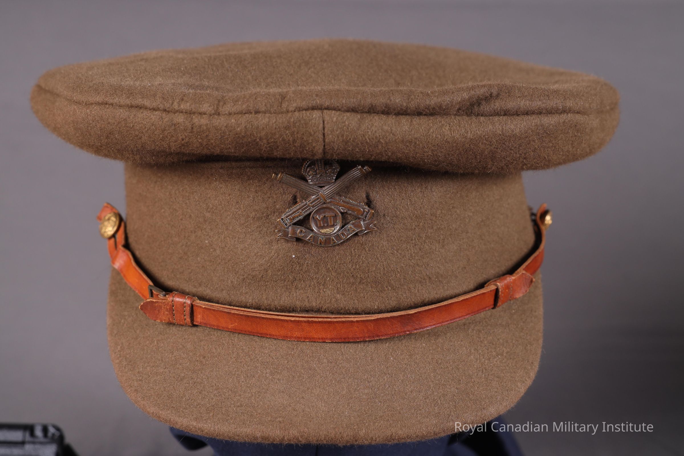 A Great War service khaki cap made from drab wool material. The top is flattened and has a front visor. An adjustable leather chin is connected to two chinstrap bottoms on both sides of the cap. In the center of the cap is a Canadian Machine Gun cap badge. It appears to be made of copper or gilding metal, crossing one another are Vickers M.G., several jewels are in the central band of the Crown, and the word "Canada" is written at the bottom of the cap badge. The interior contains a mahogany sweatband and lining.Context