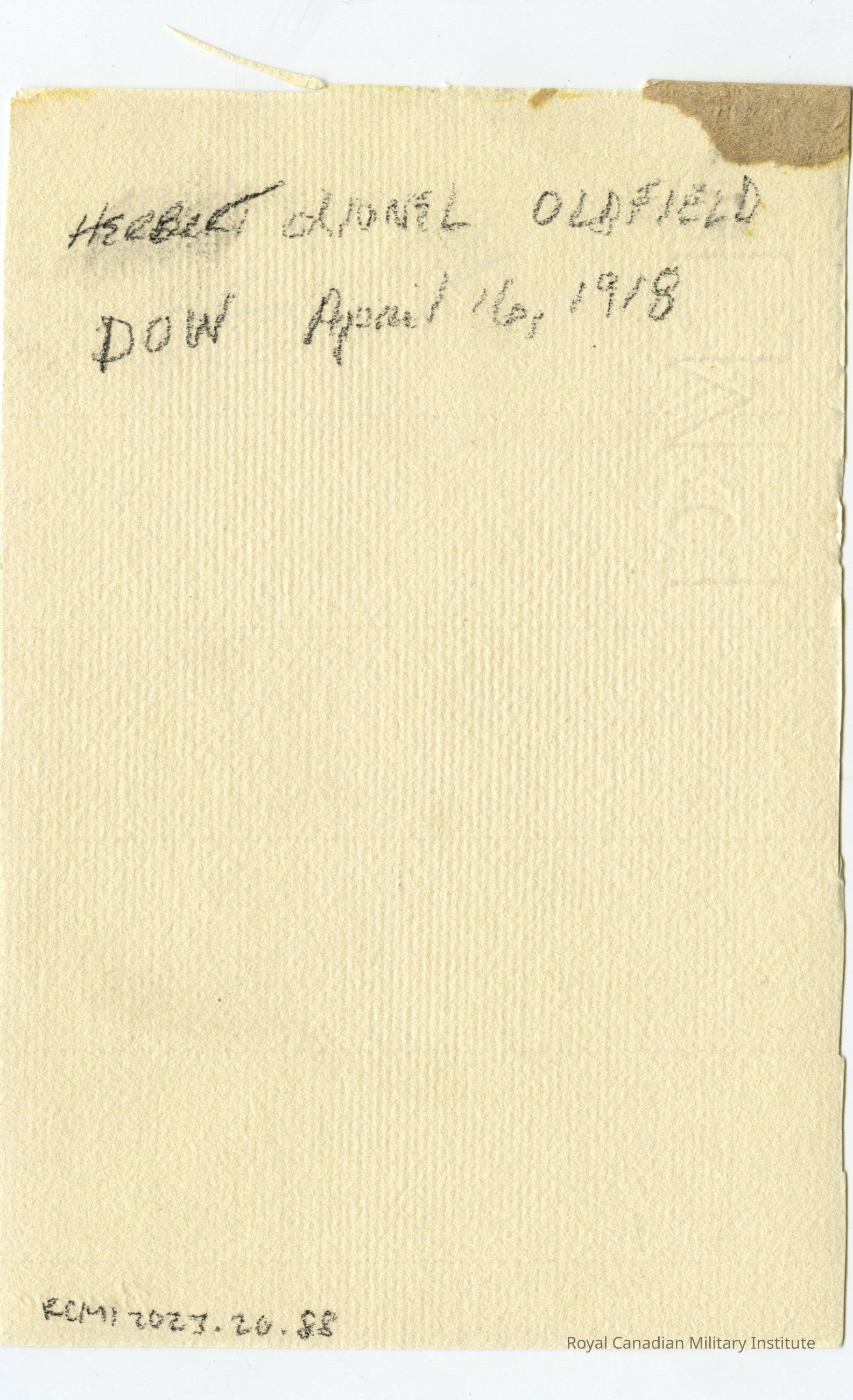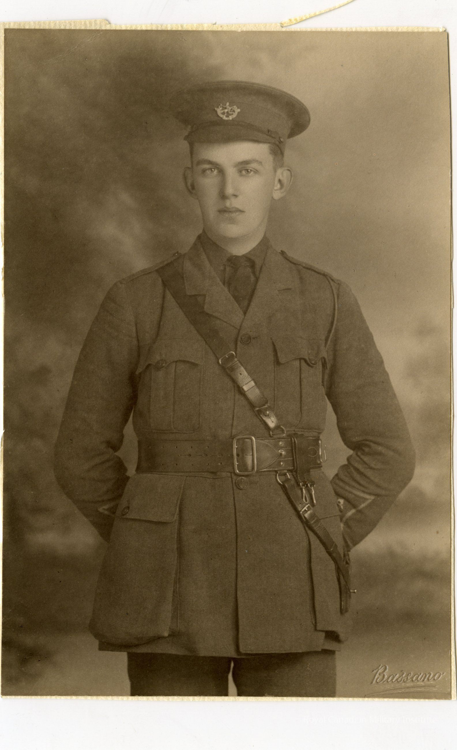 A trimmed down studio portrait of Major Herbert Lionel Oldfield of the 8th Battalion. According to the inscription on the back, he died of wounds (DOW) on April 16th, 1918. Subject is photographed from the waist up, his hands behind his back. He is wearing his full military uniform, including the cap. "Bassano" is embossed in the bottom right corner. The sides of the photograph are fraying, obviously trimmed down from a larger photo.