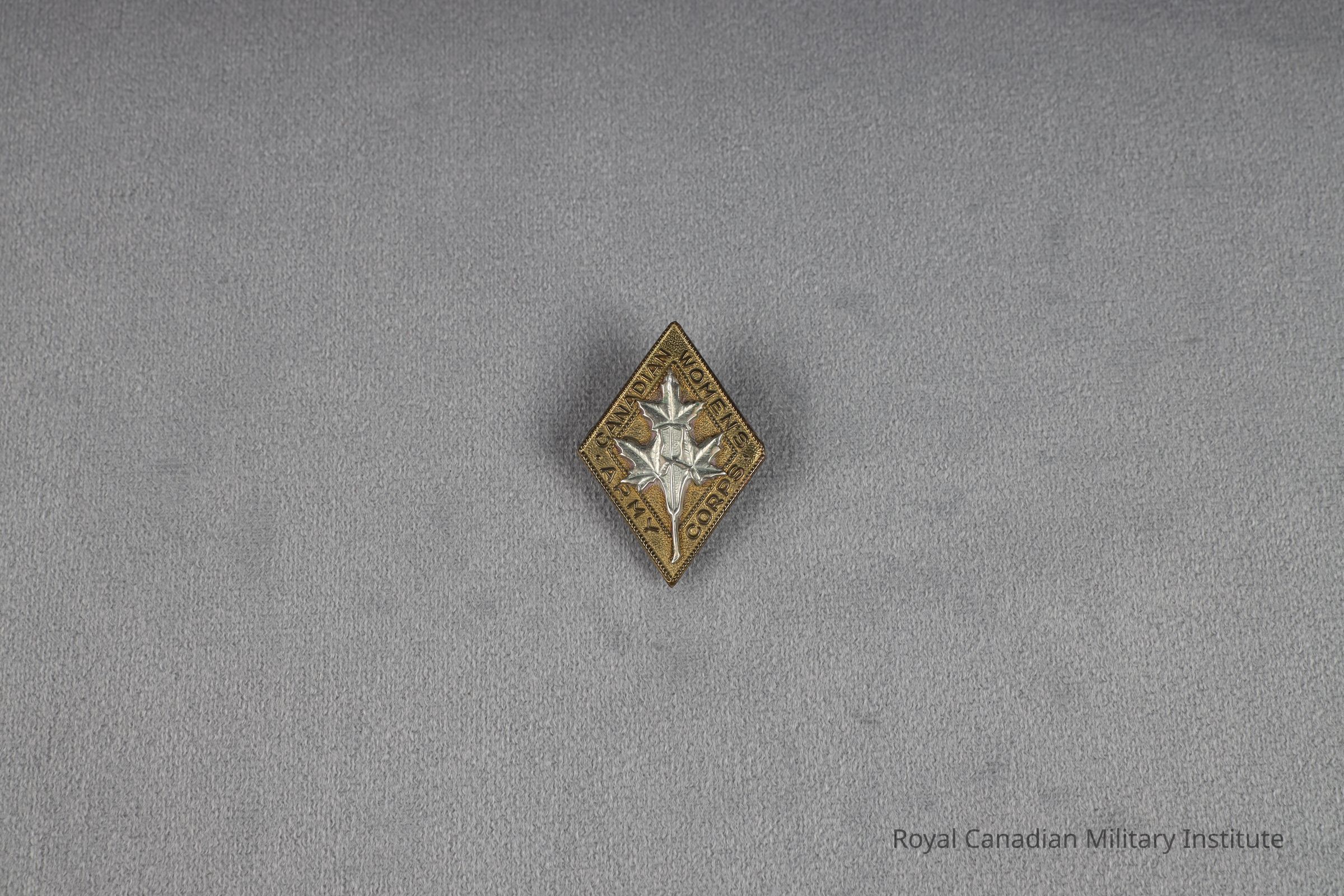 1942-1945 Canadian Women's Army Corps cap badge, other ranks. Brass diamond shaped, solid. Border title "Canadian Women's Army Corps" In centre are three white metal maple leaves. Rear is flat with two brass lugs.Made/Created