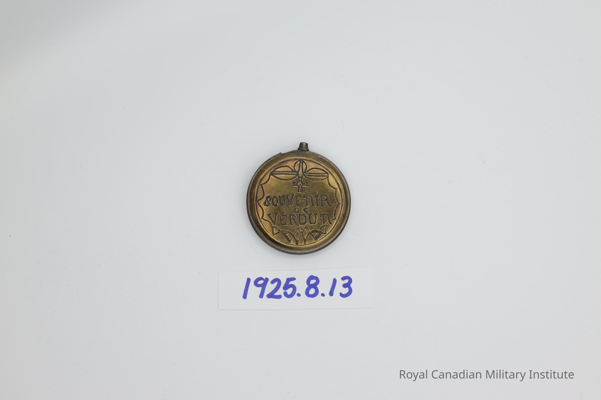 Inscribed on front: "Souvenir de Verdun" (Maltese Cross at top). Accession number on back.Dimensions