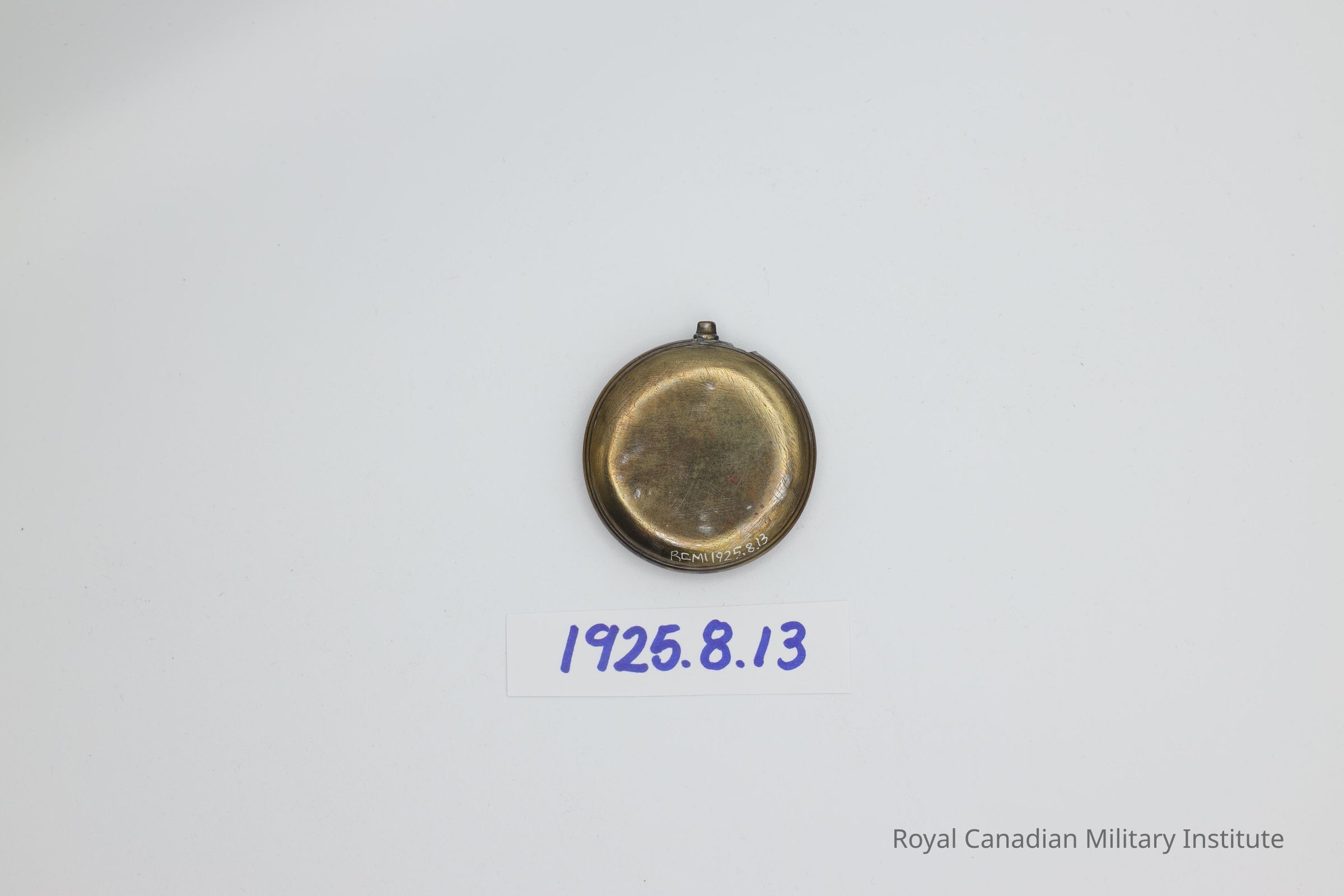 1916-1919 French civilian "Verdun" souvenir pocketwatch. Circular, brass. Hinged guard. Inscribed on front: "Souvenir de Verdun." Maltese Cross at top. A 4 mm. high mount for winding spring knob is at top.Made/Created