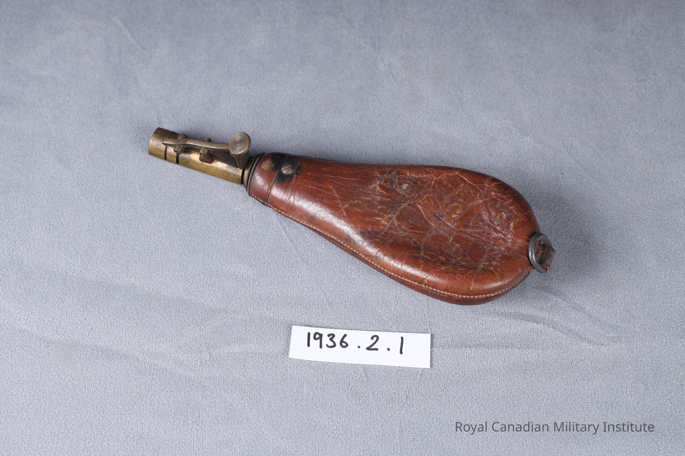 1850-1890 British civilian shot flask. Tapered pear-shaped brown cowhide body, two piece stitched down seam. At base is stitched leather loop holding steel "D" ring. At top is knurled