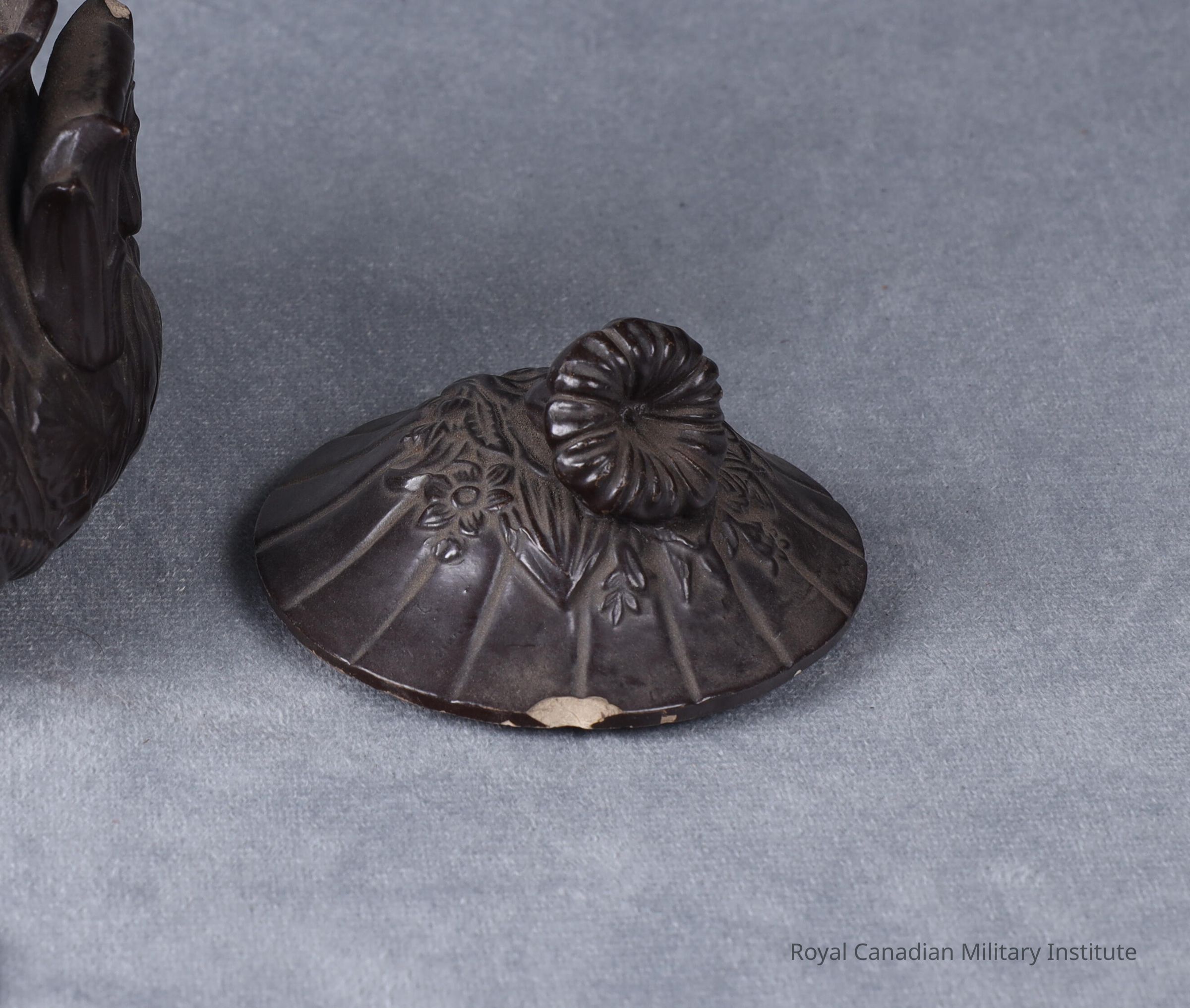 1880-1885 Canadian civilian sugar bowl lid. Dome-shaped dark brown stoneware sugarbowl lid.