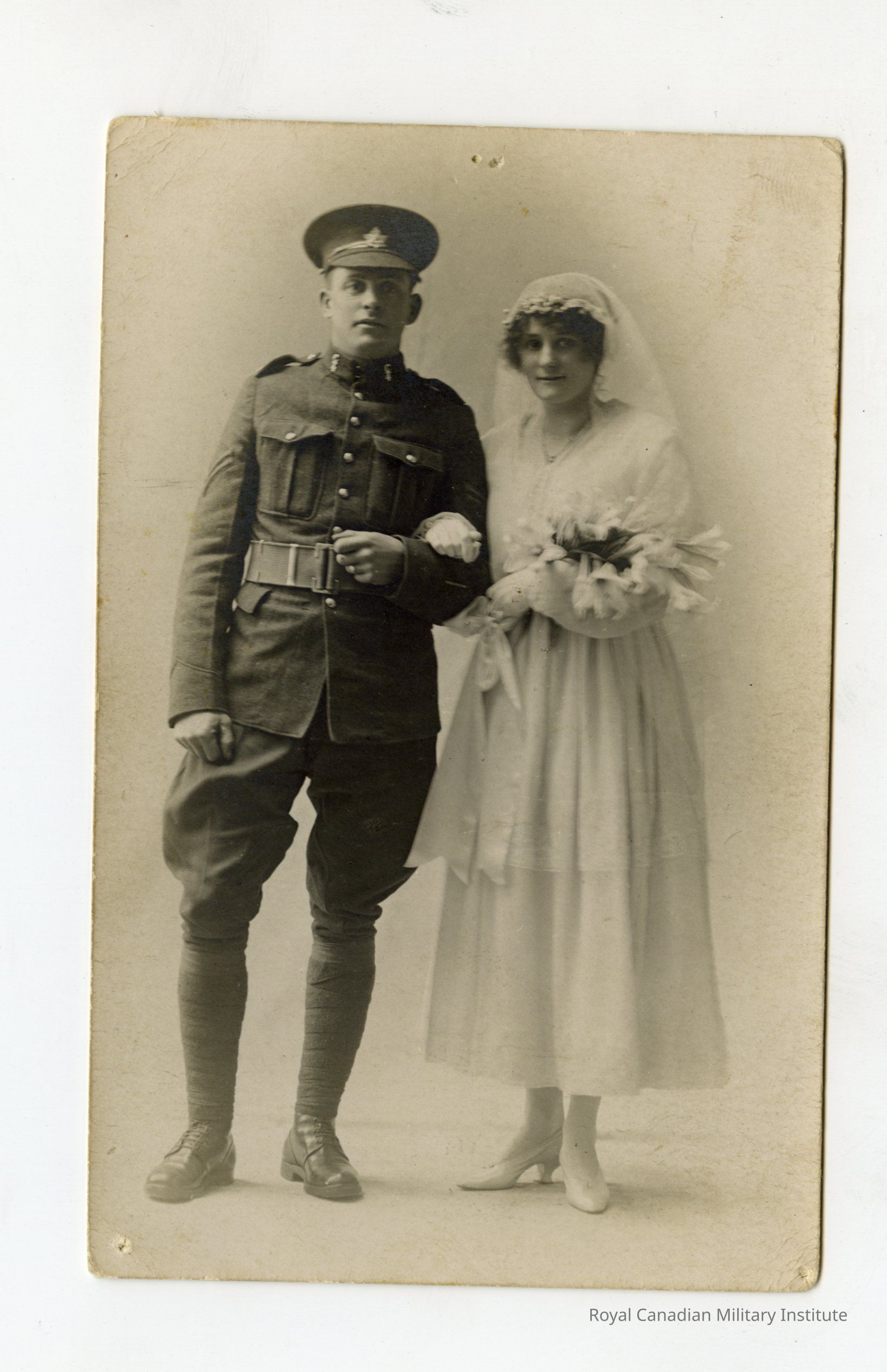 A Real Photo Postcard (RPPC) of Stanley White of the 4th Battalion and his wife Lewis on their wedding day. February 6th, 1918. The bride is depicted in her white dress and veil, holding a bouquet of flowers in her left hand. Her right arm is slung around her husband's left arm. The groom, Stanley White, is wearing his military uniform, including the cap.