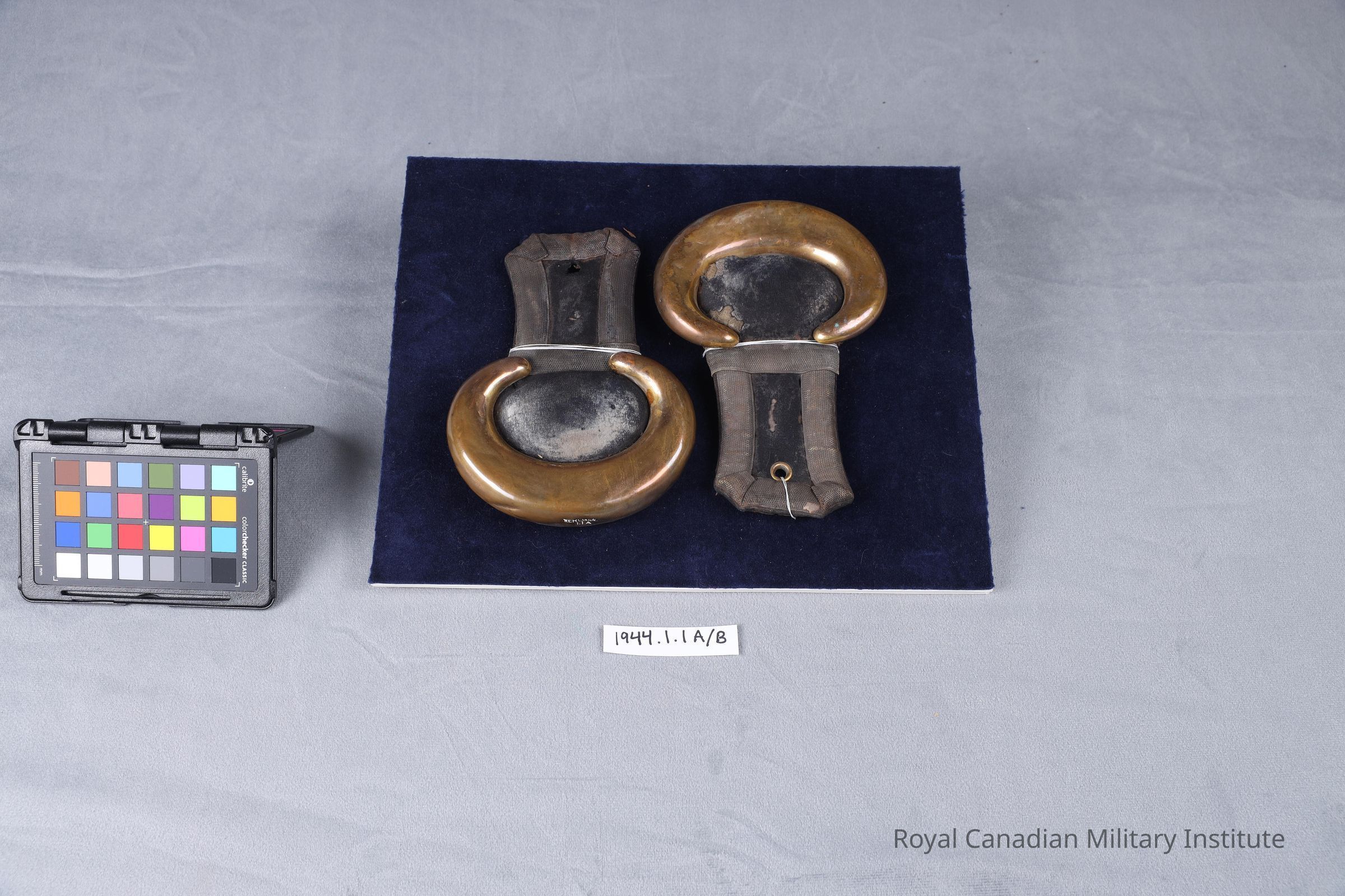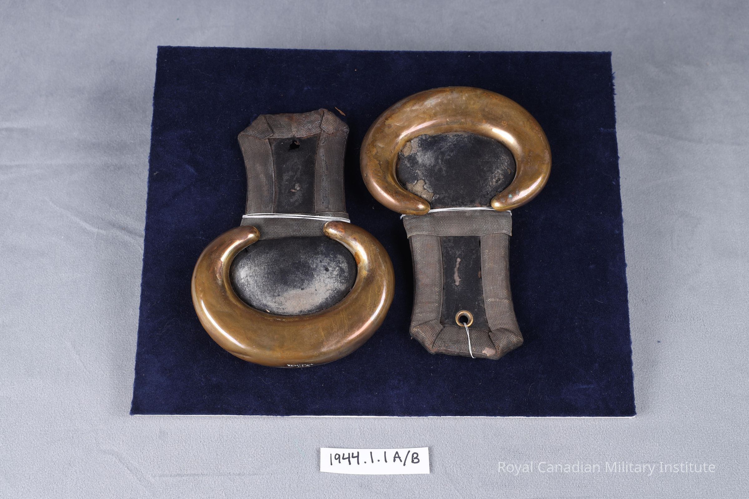 1820-1839 British Army/Canadian Militia Officer's epaulet. "T" shaped sheet metal plate padded/covered with dark blue wool, edged with 1.8 cm. wide silver lace. At shoulder end is a brass crescent with dark blue wool padding inside arms of the crescent. One lace stripe joins the arms of the crescent. At the neck end of the epaulete is a hole for a button.Made/Created