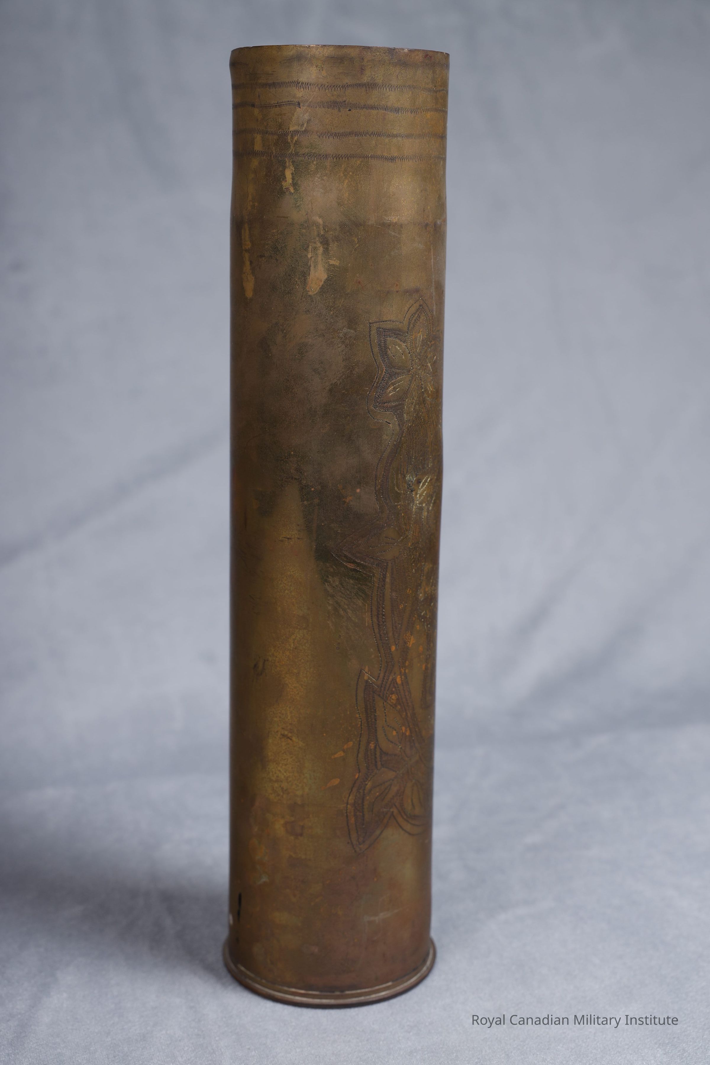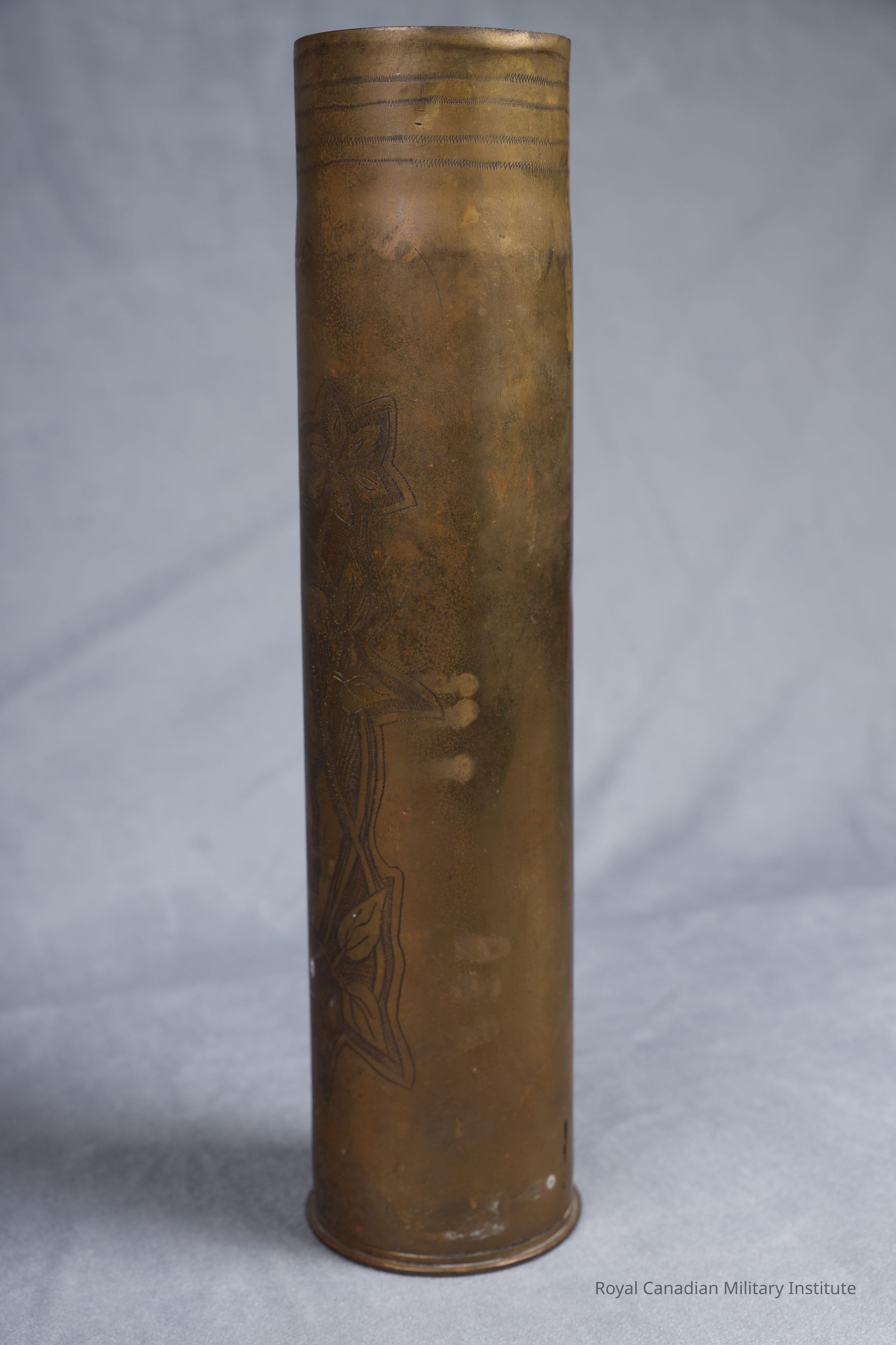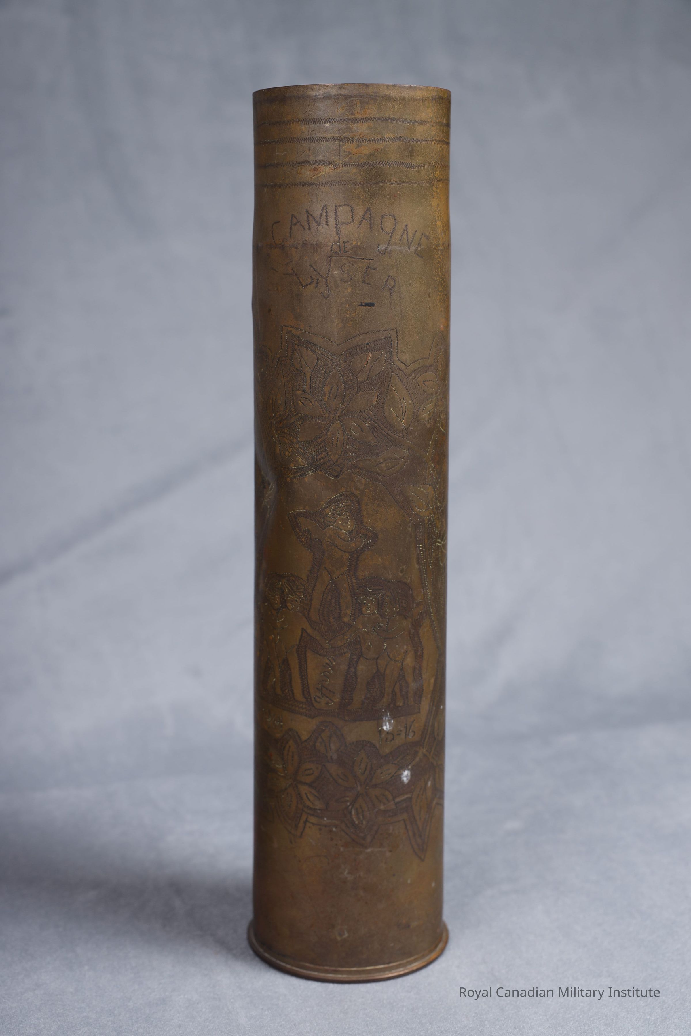 1914-1918 French Army Model 1897 75 mm. field artillery gun shell casing. Cylindrical, brass, fired primer. Converted into "trench art" souvenir: hundreds of dots, grooves, stipples form an oval pattern of leaves, vines surrounding five angels around shield "St.Eloi". Bottom of shield are dates "1914", "1918". At top is title "Campagne de Lyser".Made/Created