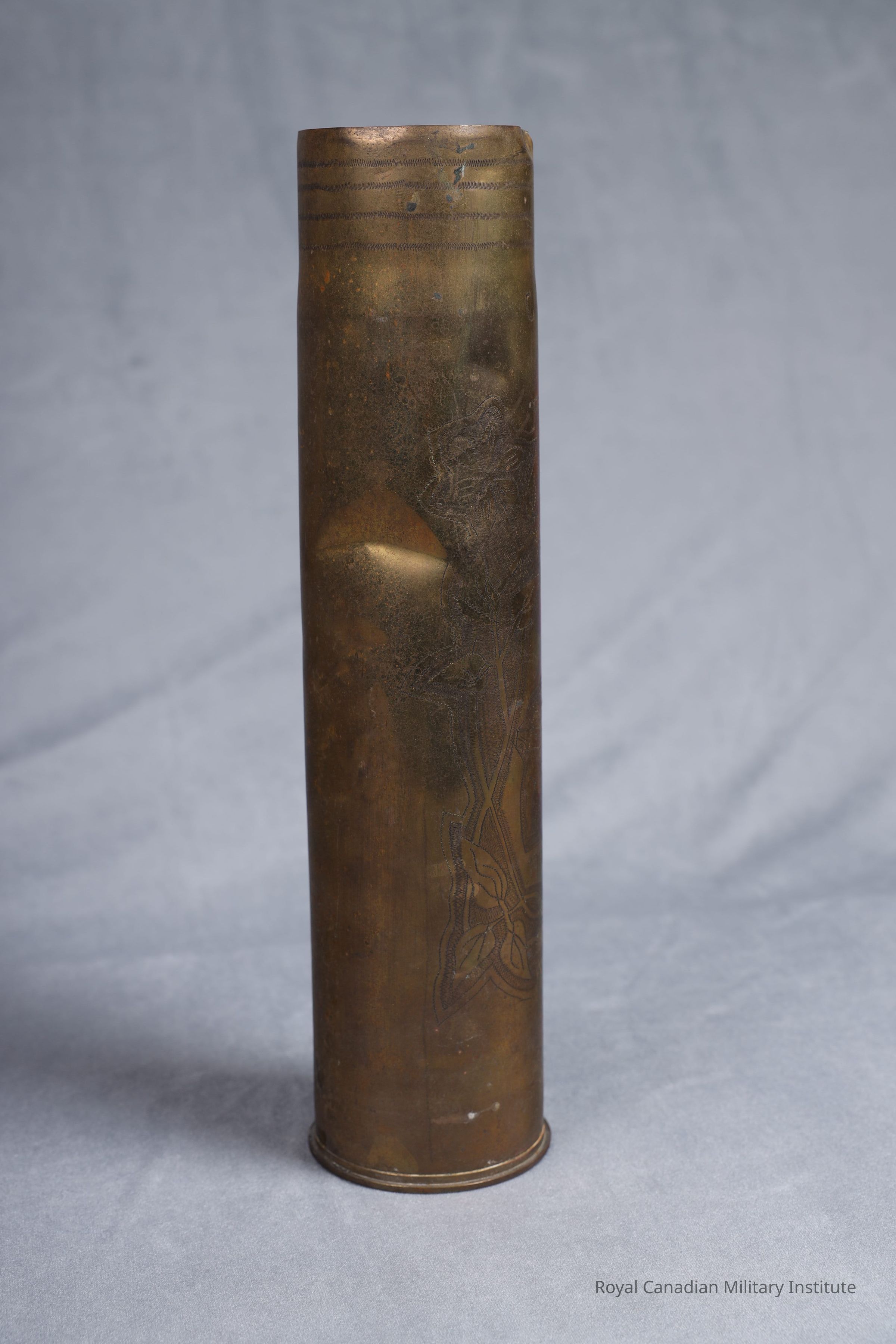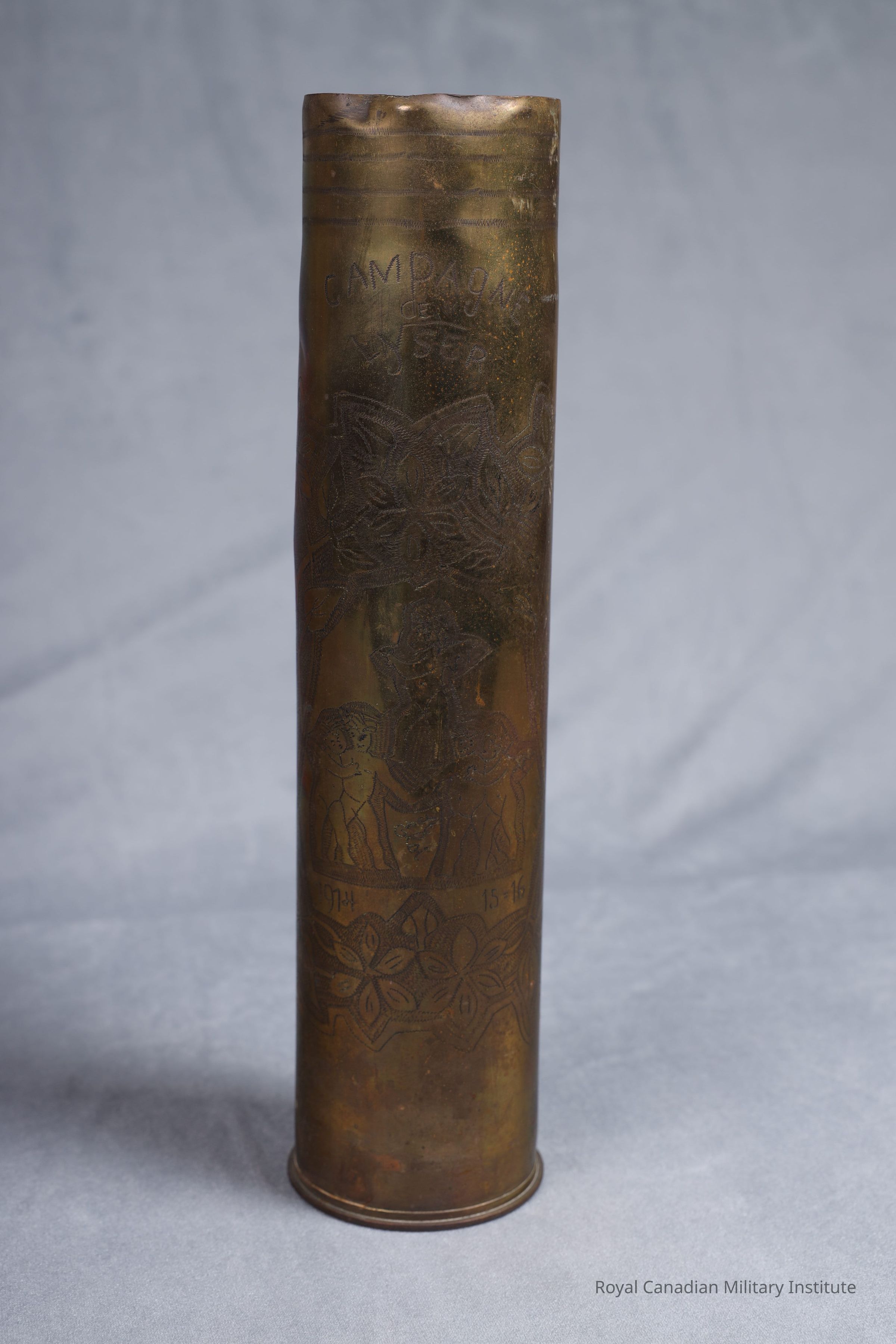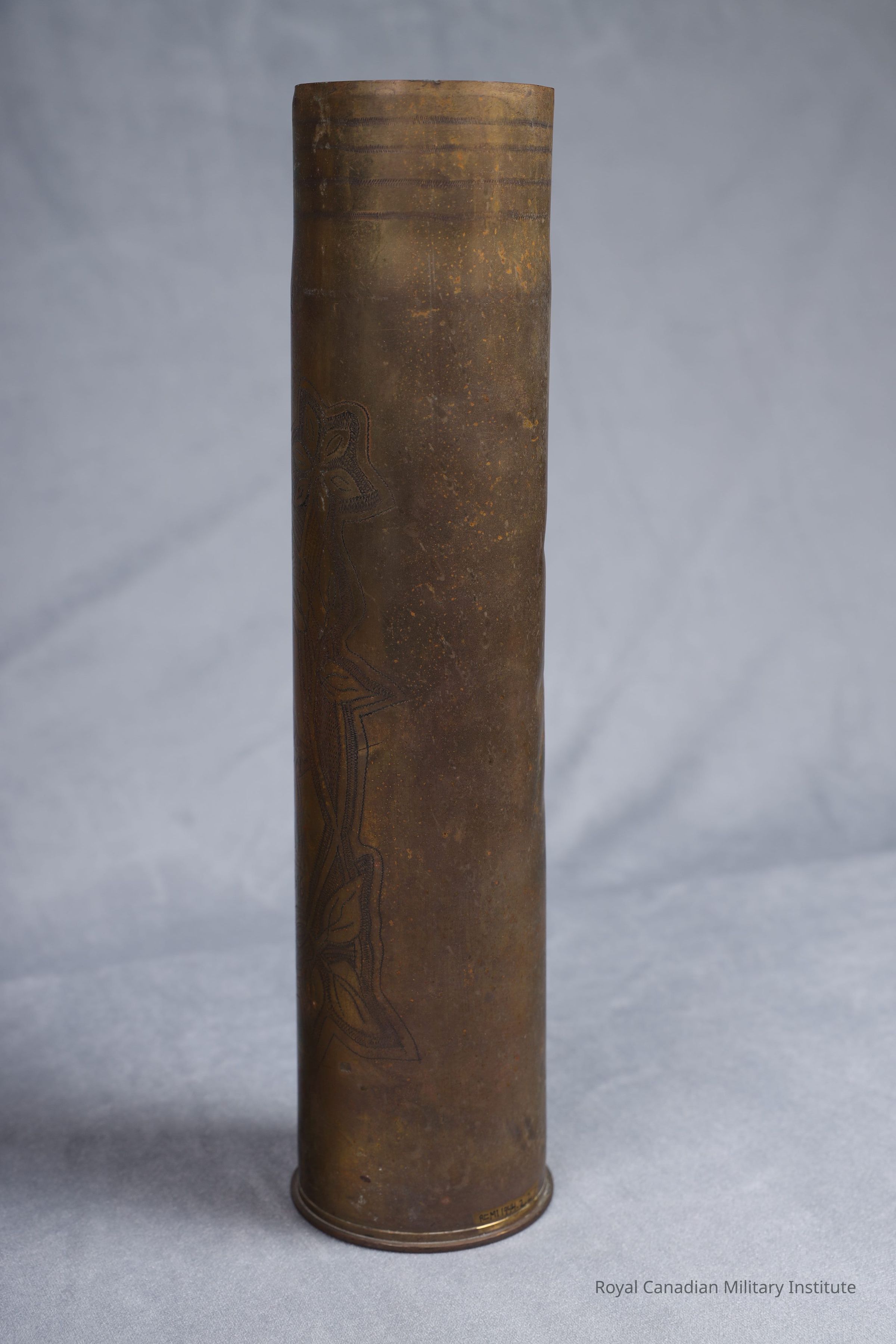 1914-1918 French Army Model 1897 75 mm. field artillery gun shell casing. Cylindrical, brass, fired primer. Converted into "trench art" souvenir: hundreds of dots, grooves, stipples form an oval pattern of leaves, vines surrounding five angels around shield "St.Eloi". Bottom of shield are dates "1914", "1918". At top is title "Campagne de Lyser".Made/Created