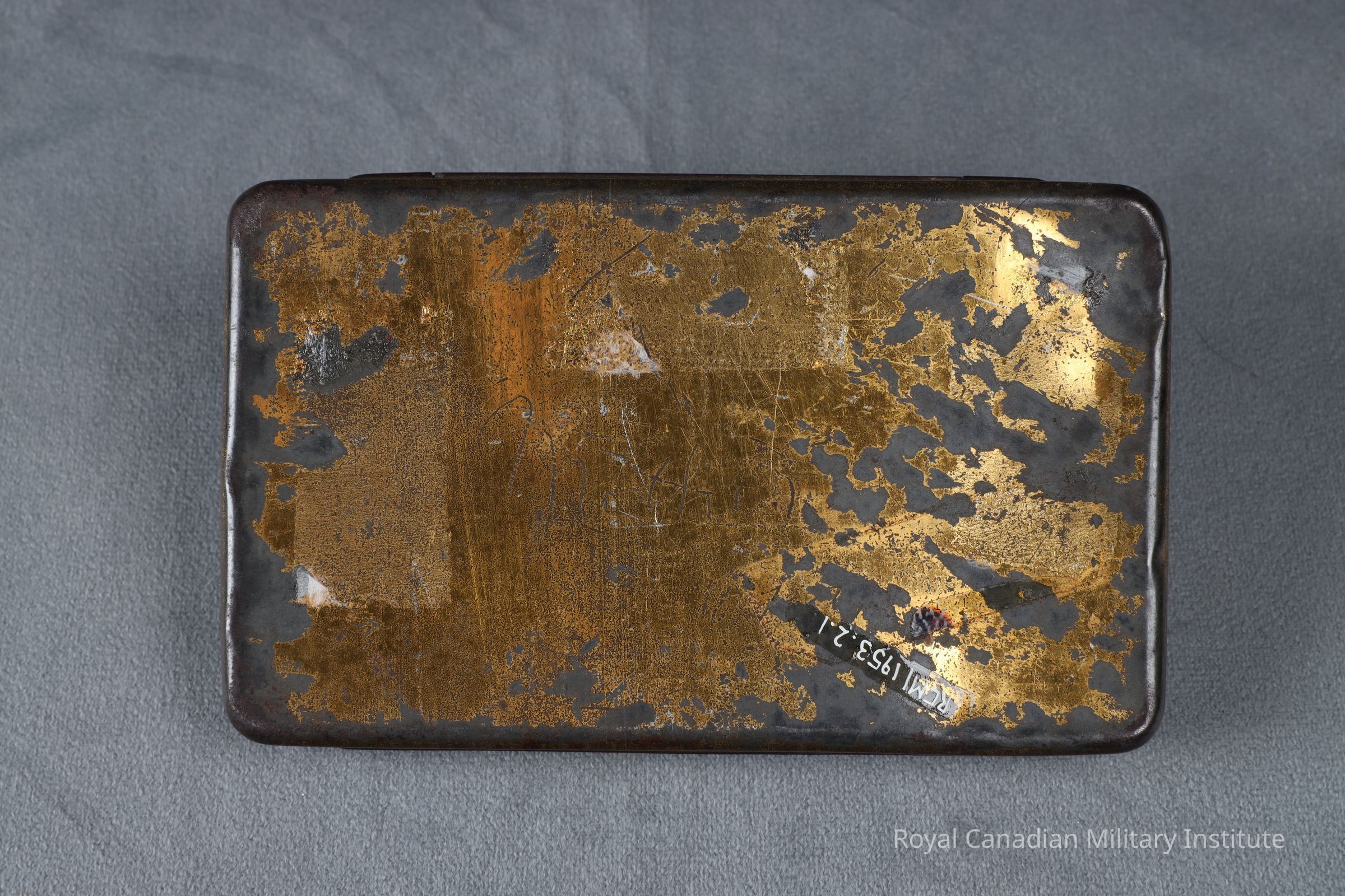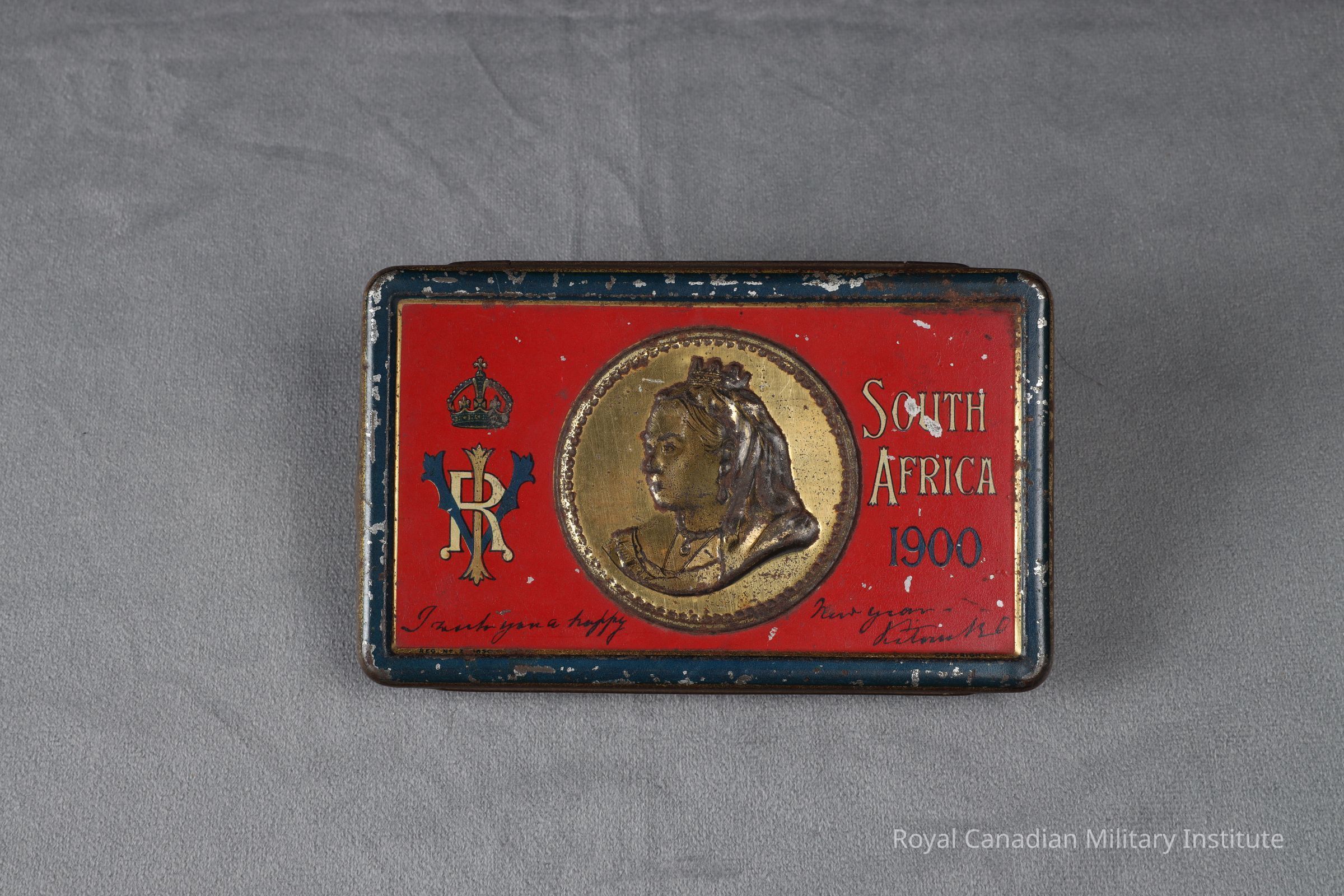 steel sheet. Hinged top lid. Stamped into centre lid in relief is bust of Queen Victoria with blue lacquered script "I Wish You A Happy New Year, Victoria R.I." In white and blue lacquer above bust of Queen Victoria: "South Africa 1900", "VR I" crown and cypher.Made/Created
