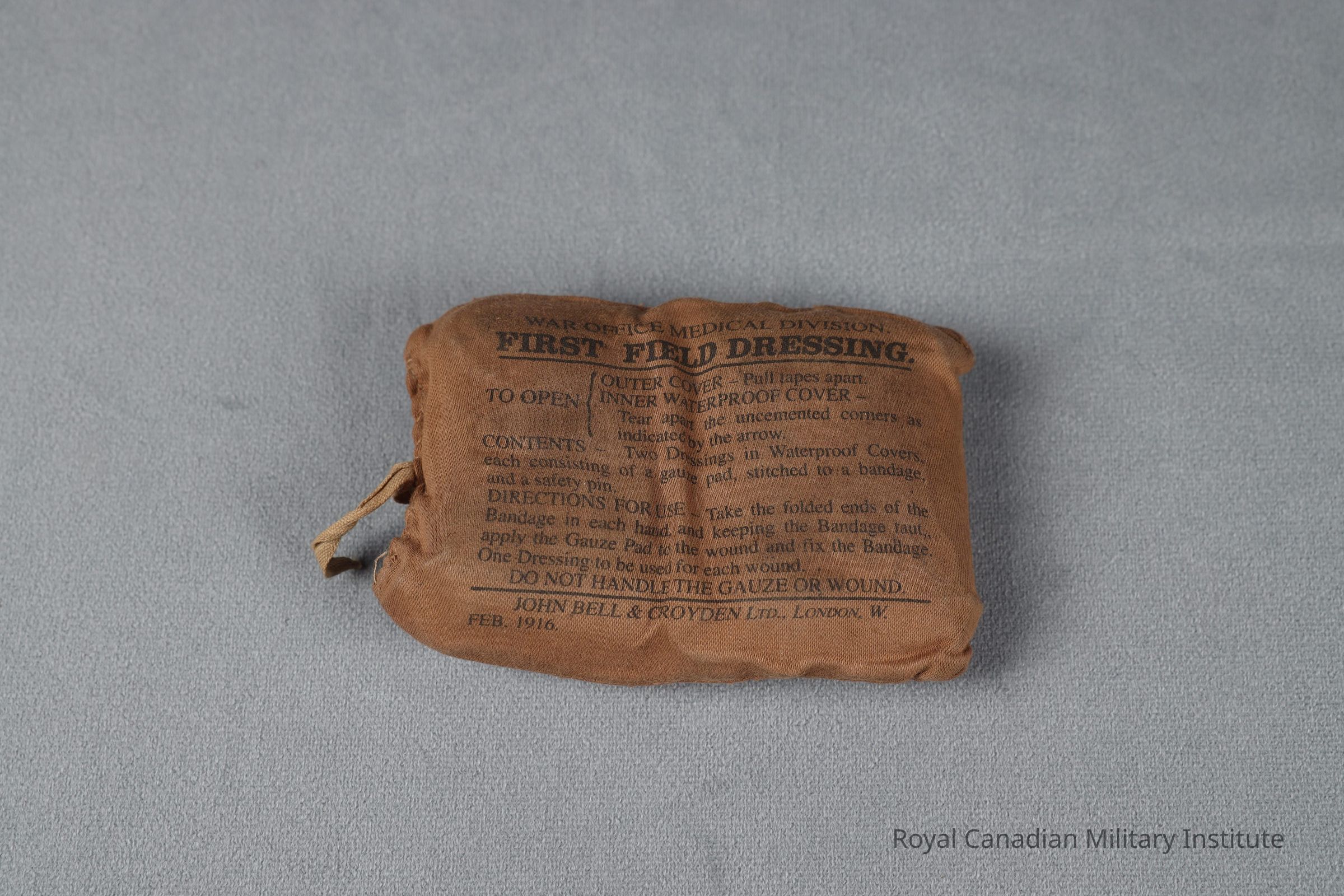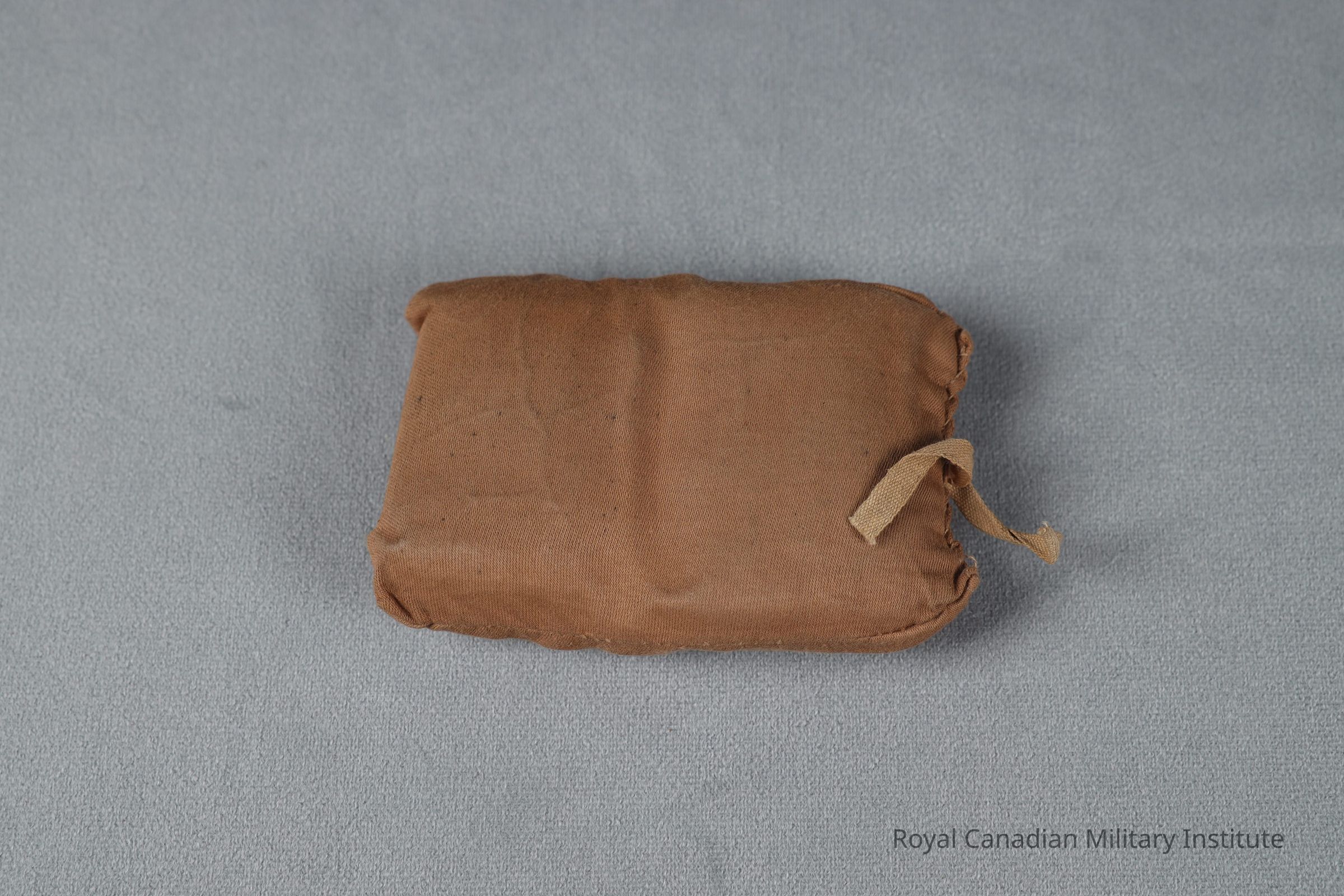1916-1919 BEF soldier's First Field Dressing. The 1919-1919 large shell dressing is made of cloth, and written instructions are on the exterior. The exterior safeguarded the dressing and kept it clean. The dressing itself was absorptive and connected to a lengthy bandage.Context