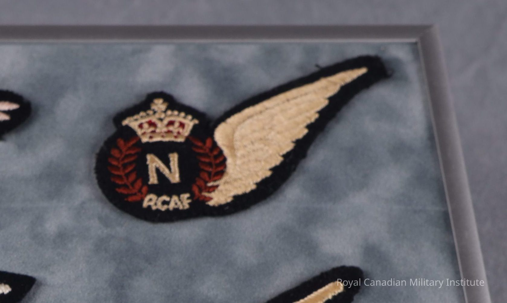 1943-1945 Royal Canadian Air Force Navigator's qualification wing badge. Red/white cotton thread King's crown atop brown cotton thread wreathed white cotton thread "N". At centre bottom of wreath is white cotton thread letters "RCAF". Angled, upswept single feathered wing. Black wool base. Unpadded. Black linen backing.Made/Created