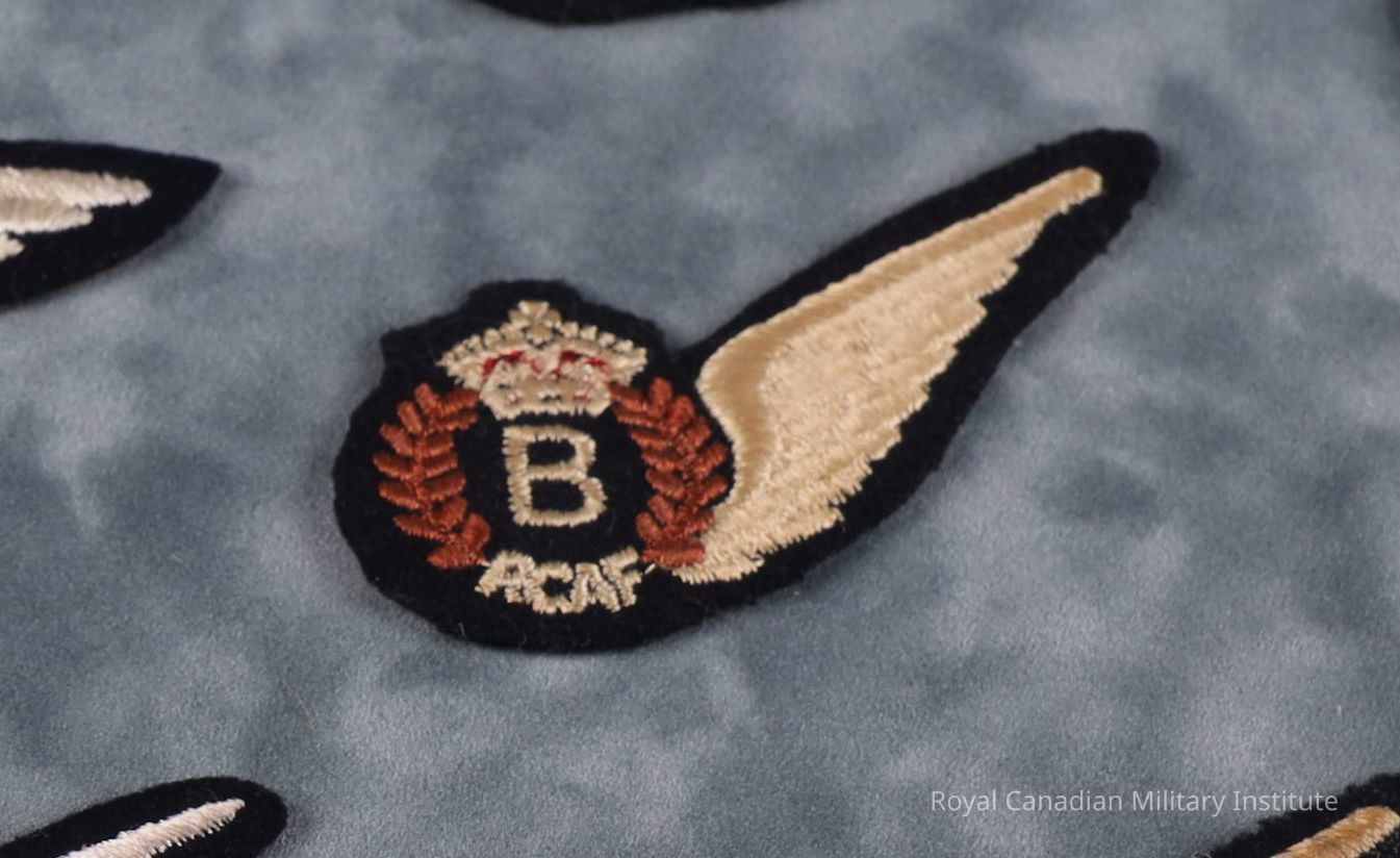 1943-1945 Royal Canadian Air Force Bomb-Aimer's qualification wing badge. Red/white cotton King's crown atop white cotton letter "B" surrounded by brown cotton wreath. At bottom are white cotton letters "RCAF." Angled upswept single feathered wing. Unpadded. No linen or paper backing.Made/Created