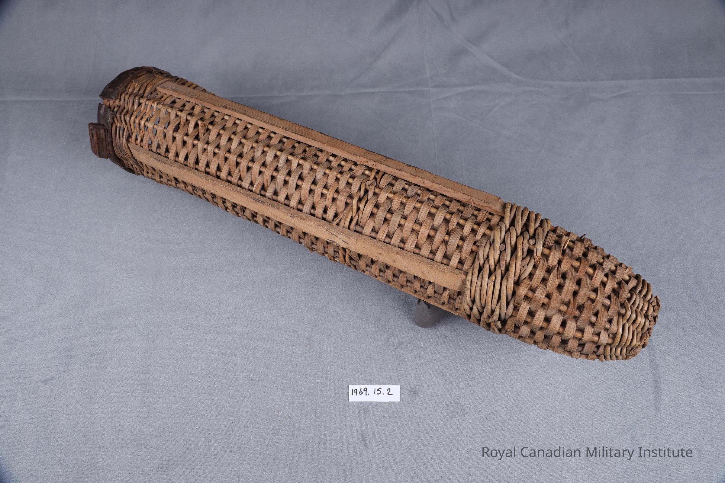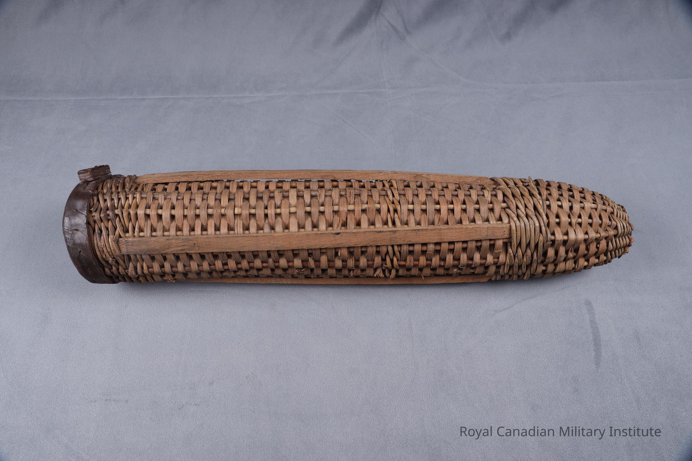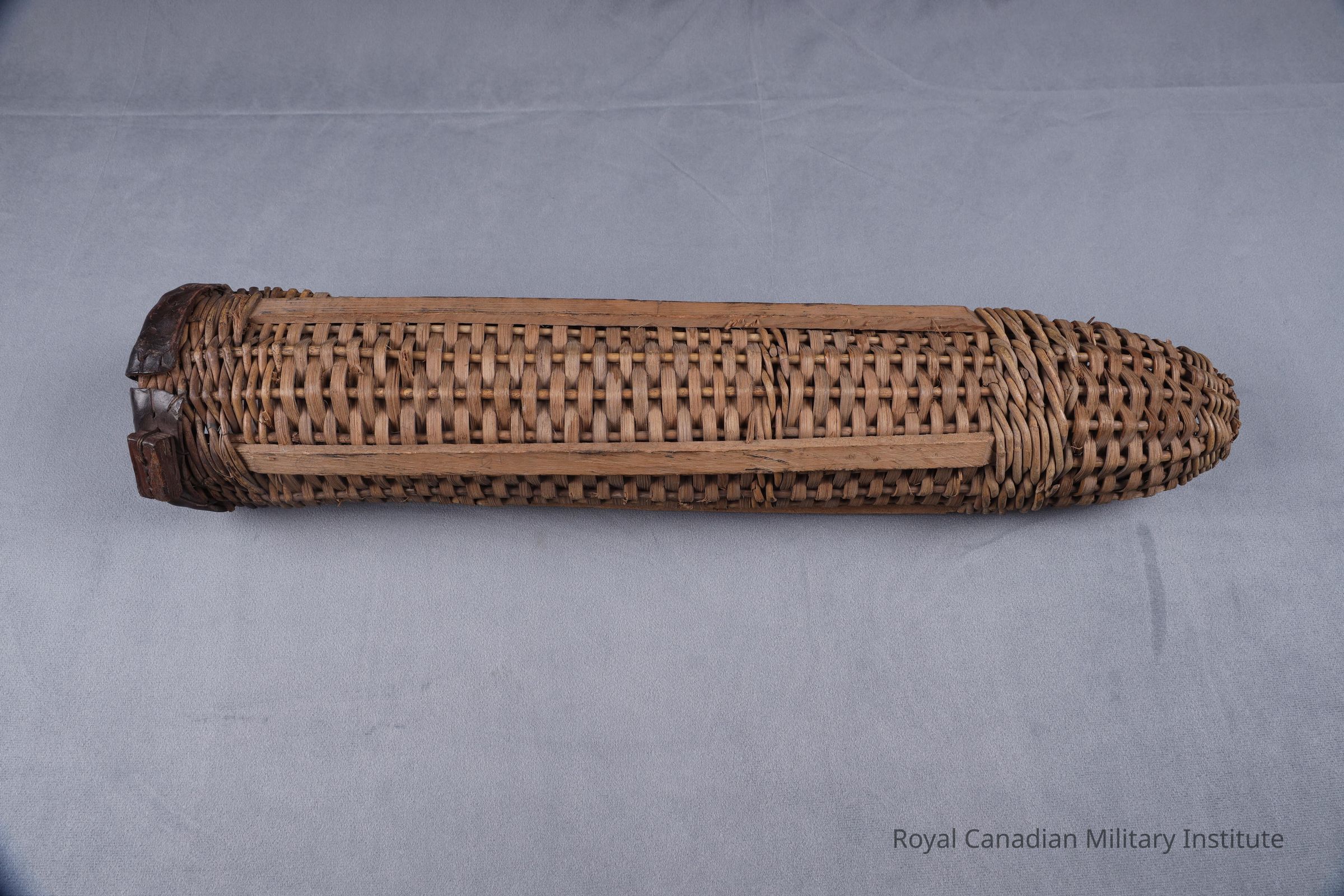 1914-1918 British Expeditionary Force (Royal Field Artillery) 18-pounder quick firing gun shell carrier. Tapered cylindrical woven wicker casing. Four hardwood splints (1.6 cm wide x 45 cm long). Brown leather base (2.5 cm wide x 11 cm diameter) sewn to base. Also sewn to base are four brown leather pads (3.5 cm long x 1.5 cm wide).Made/Created