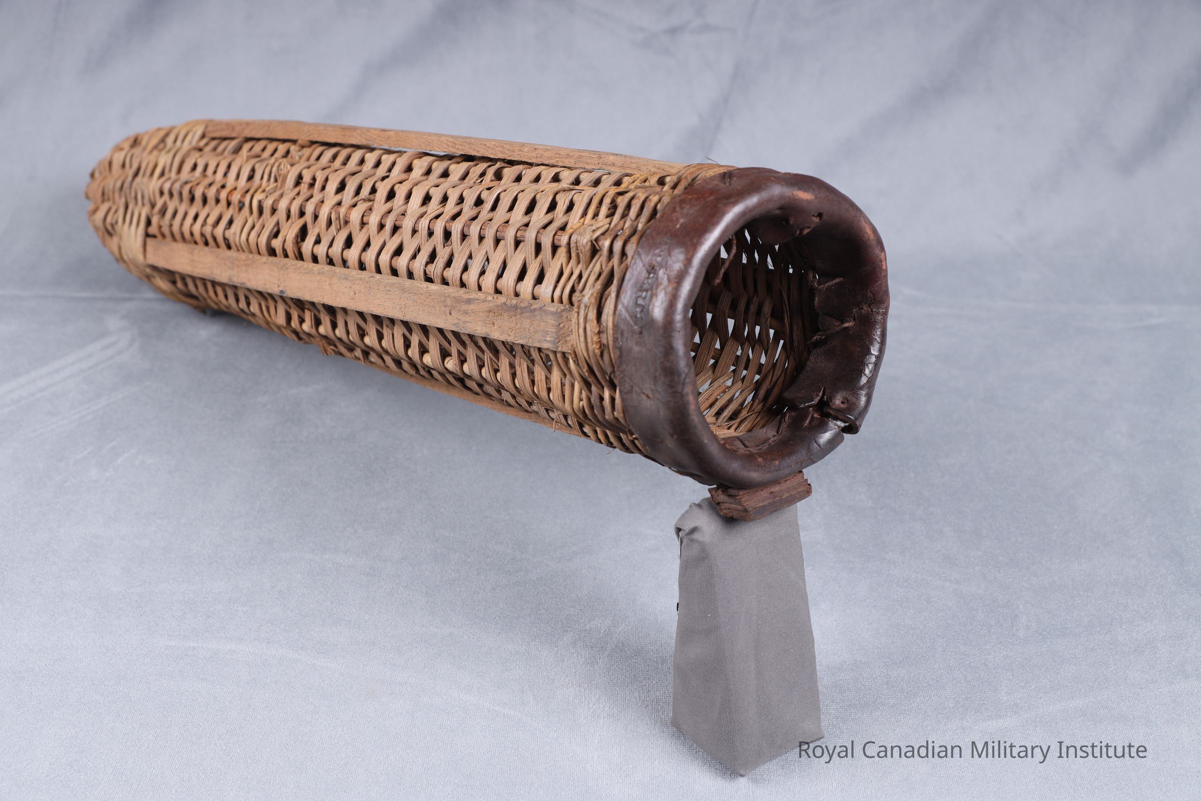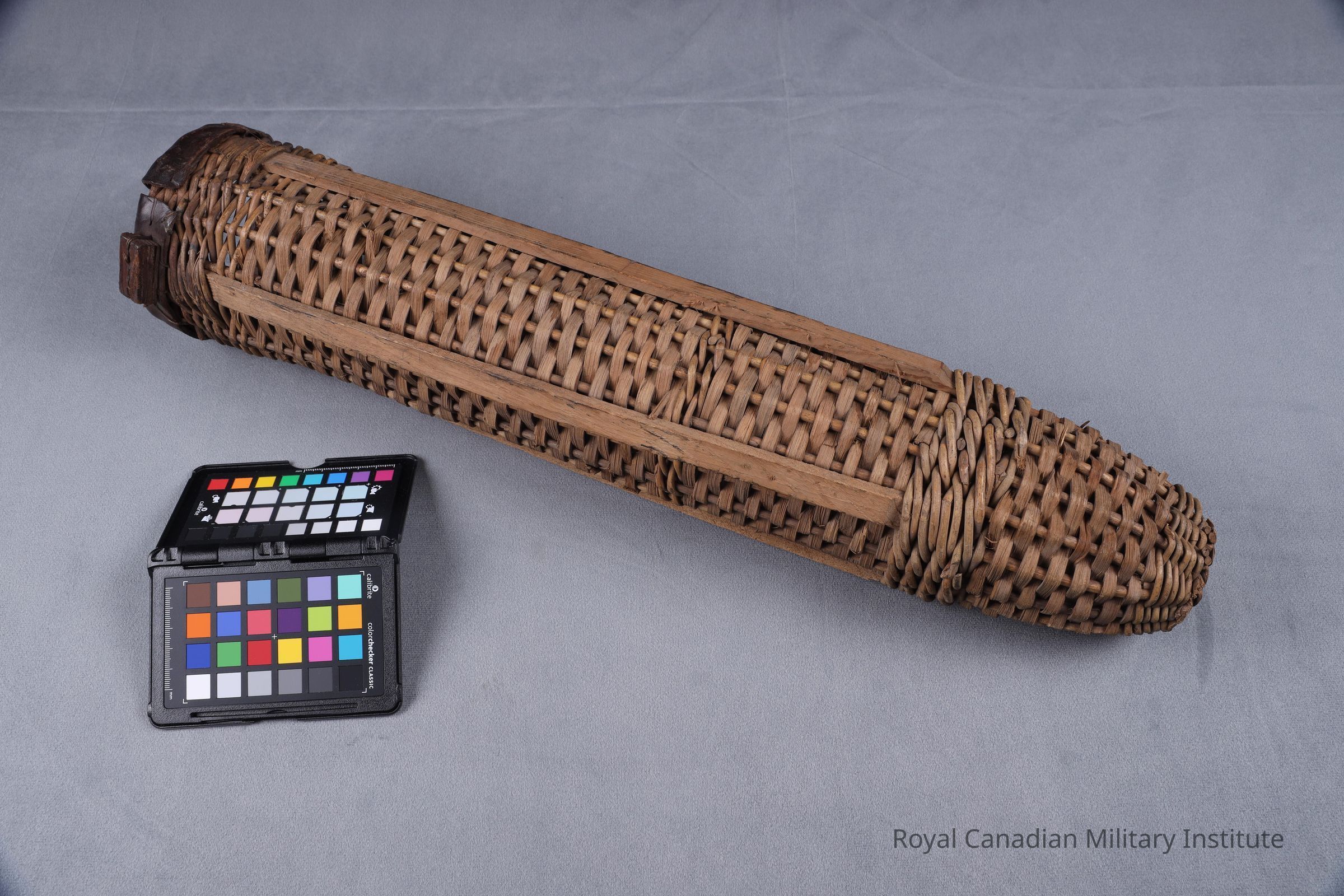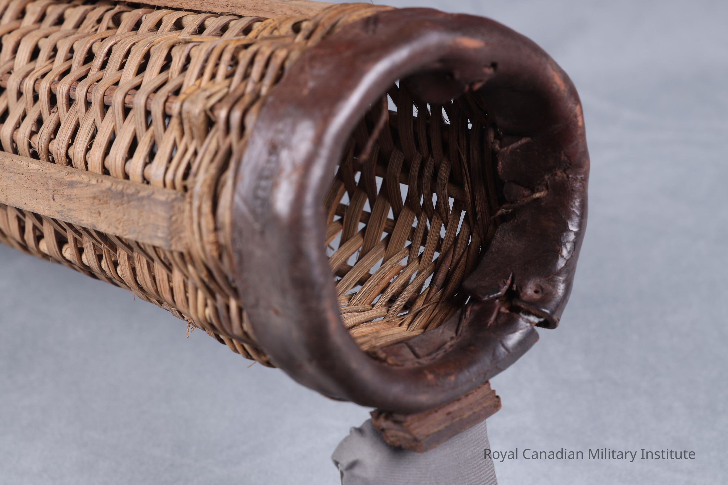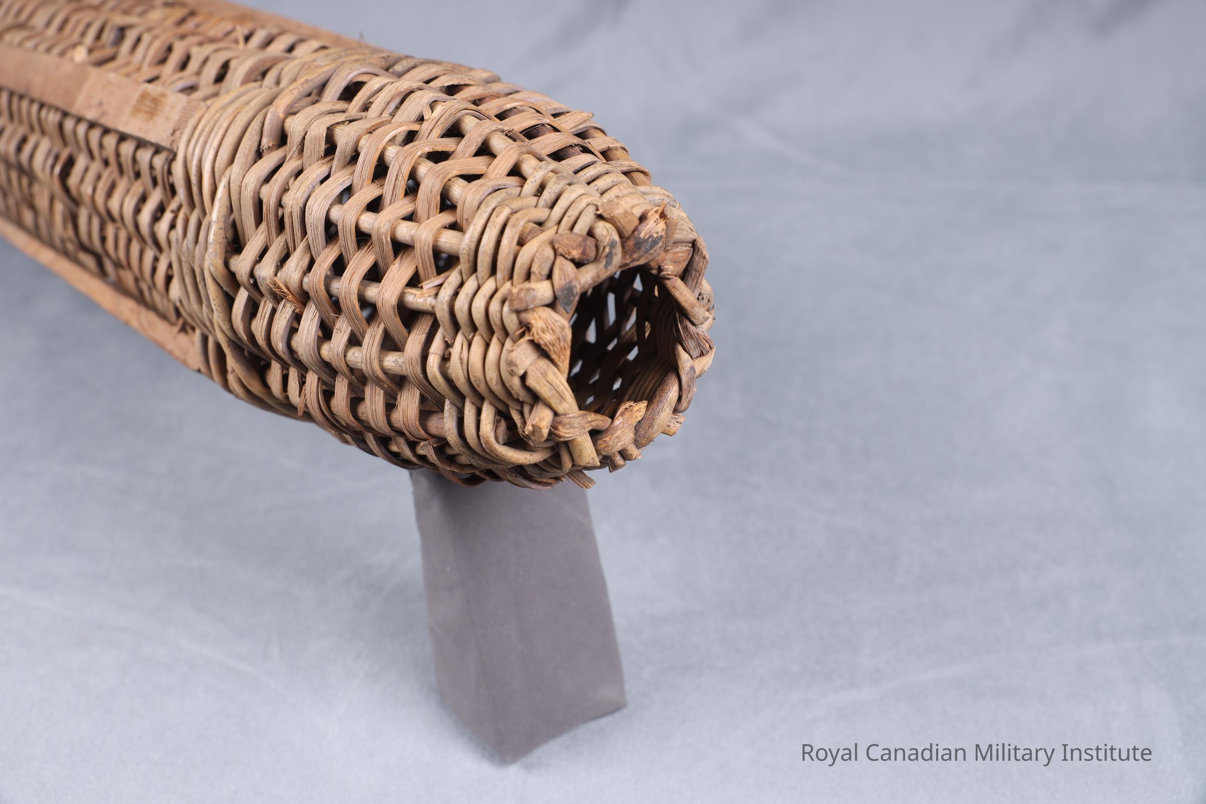 1914-1918 British Expeditionary Force (Royal Field Artillery) 18-pounder quick firing gun shell carrier. Tapered cylindrical woven wicker casing. Four hardwood splints (1.6 cm wide x 45 cm long). Brown leather base (2.5 cm wide x 11 cm diameter) sewn to base. Also sewn to base are four brown leather pads (3.5 cm long x 1.5 cm wide).Made/Created