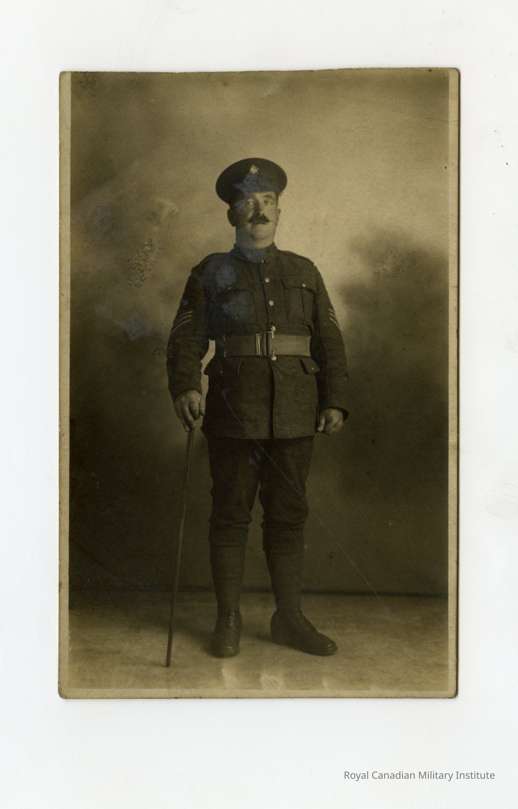 An unidentified Real Photo Postcard (RPPC) of a 31st Battalion Sergeant. Addressed to Maggie (on the inverse side, not pictured here). A full body photograph of the subject, who is wearing his full military uniform and cap. In his right hand, he holds a cane. While his body is directly facing the camera, his eyes are directed to the right of the camera (left on the postcard).